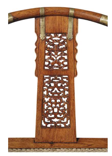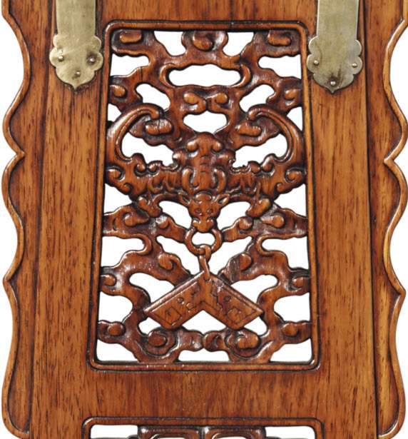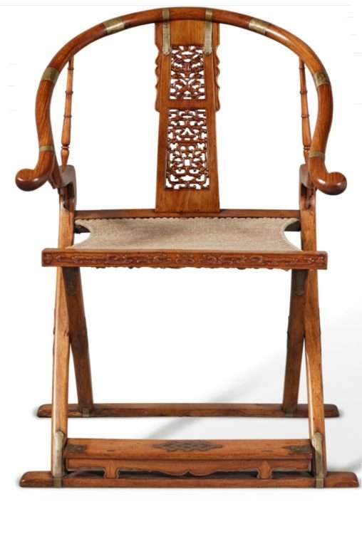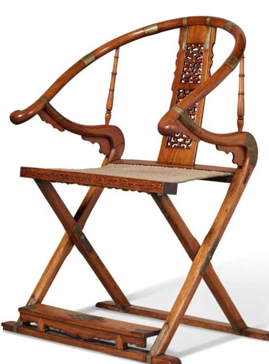 The present chair is particularly noteworthy for its intricate openwork back-splat and appears to form part of a sub-group of folding chairs carved with auspicious motifs โ in this case a stylized shou (โlongevityโ) character, a bat (fu, a rebus for good fortune โfuโ) and a jade chime. For other members of this group, compare: an armchair carved in relief with a closely related shou character on the splat, formerly in the Royal Ontario Museum, Toronto, and Museum of Classical Chinese Furniture in Renaissance, California, reputed to have been used by the Dowager Empress Cixi, and sold at Christieโs New York, 19th September 1996, lot 50, illustrated in Sarah Handler, Austere Luminosity of Chinese Classical Furniture, Berkeley, California, 2001, p. 61, fig. 5.1; another from the Mimi and Raymond Hung Collection, illustrated in R.H. Ellsworth, Chinese Furniture: One Hundred Examples from the Mimi and Raymond Hung Collection, New York, 1996, pl. 13 and sold at Christieโs Hong Kong, 1st December 2009, lot 1938; and another two with auspicious imagery in relief, apparently produced as a pair with mirrored โThree Friends of Winterโ designs: one sold in these rooms, 19th March 2007, lot 312; and the other in the Haven Collection, included in Classical Chinese Huanghuali Furniture from the Haven Collection, University Museum and Art Gallery, University of Hong Kong, Hong Kong, 2016, cat. no. 71.