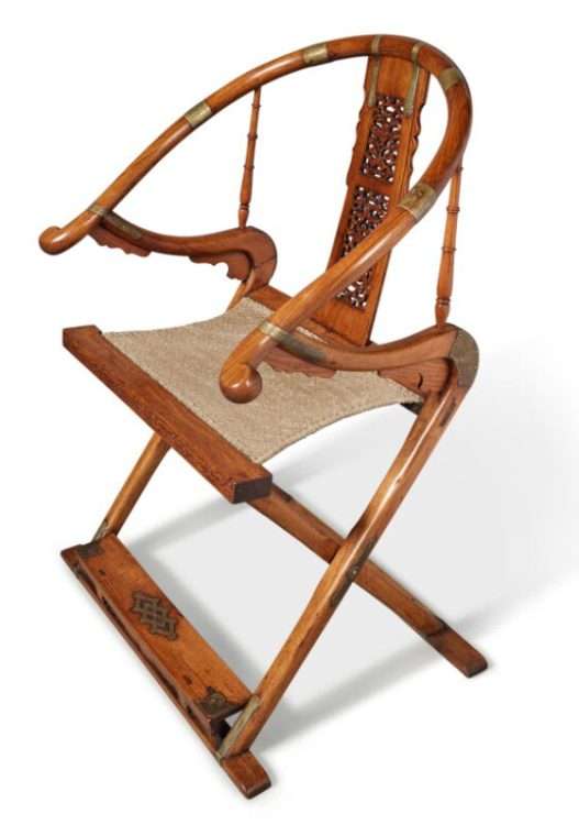 This historical and cultural significance is further evidenced by the frequent appearance of jiaoyi in imperial paintings and prints throughout the generations. The Ming painting Birthday Gathering in the Bamboo Garden by Lรผ Ji and Lรผ Wenying, in the Palace Museum, Beijing, shows some of the highest-ranking government officials of the day seated on folding round-back chairs. While the furniture represents the social status of the depicted, the antiques and scholarly paraphernalia surrounding them also suggest their aesthetic discernment and literary accomplishments. The symbolic potency of the form persisted and flourished into the Qing dynasty. In the 1757 work of Jesuit court artist Giuseppe Castiglione (1688โ1766), for example, the Qianlong Emperor is rendered at ease receiving tribute horses from Kazakh envoys. Seated on a horseshoe-back folding chair addressing his tributaries, his leisurely posture and stately authority is accentuated by his throne-like chair. Though the depicted chair appears to be a Qing reinterpretation of the design, sporting dragon heads on the armrails, its presence as a โthrone on the goโ reflects the high regard with which the Ming originals were held by the court, who preserved a number in their collection, and which are still found today in the Palace Museum, Beijing. Compare an understated Ming example illustrated in Hu Desheng, The Palace Museum Collection. A Treasury of Ming & Qing Dynasty Palace Furniture, vol. I, Beijing, 2007, pl. 62; alongside elaborate Qing interpretations, pls 63 and 65. Two further Ming jiaoyi of almost identical design are known; the first, sold in these rooms, 18th September 1996, lot 311, is preserved in the Minneapolis Institute of Art, Minneapolis (accession no. 98.80.3) (Fig. 3); and the second, formerly in the Gustave Ecke and Chen Mengjia Collections and now preserved in the Shanghai Museum, is illustrated by Wang Shixiang in Connoisseurship of Chinese Furniture, Hong Kong, 1990, pl. A90.