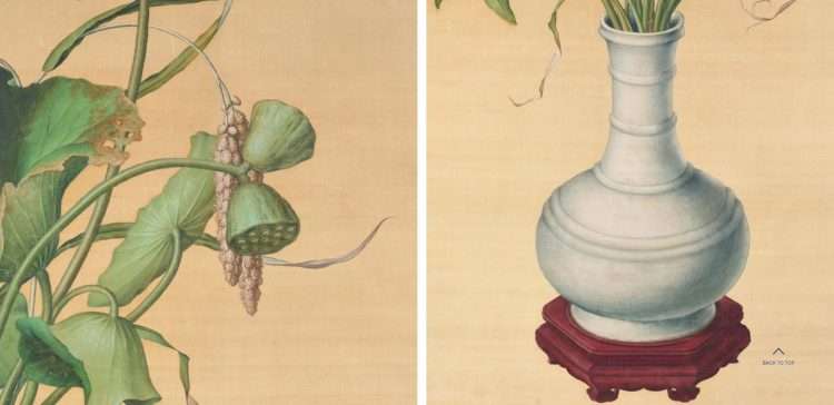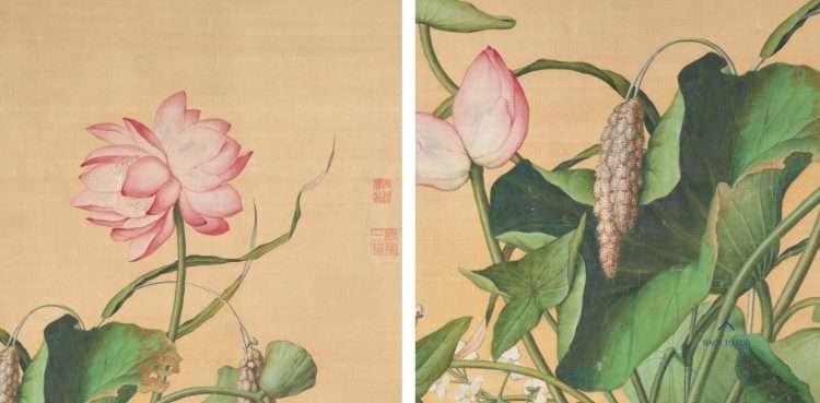 In the first year of the Yongzheng reign (1723), on the sixth day of the eighth month, a spectacular sight of lotus seed pods sharing a single stem with divided calyxes was observed. Marvelling at the sighting of the Bingdi lotus, an auspicious sign symbolising “two hearts united as one,” the Yongzheng Emperor and his court officials make haste to capitalise on this rare phenomenon.