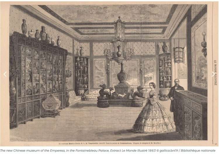 In the Compiรจgne and Fontainebleau chรขteaux, the Empress ordered construction of a tea room and a Chinese museum, respectively. She chose 18th-century furnishings for the first, including furniture in red Chinese lacquer, as well as articles in the style of the day. A tasteful mix of influences demonstrating an eclecticism in interior dรฉcor that would remain the hallmark of the Second Empire style. For Fontainebleau, the Empress showed even more exuberant orientalism with the installation not only of a Chinese museum in 1863, but a salon des lacques, as well. The gifts from the Siam ambassador, who was hosted by the Emperor two years earlier at the same chรขteau, served as the collectionโs foundation. It would soon expand thanks to many new objects from China, where the Second Opium War and the Franco-English troopsโ ransacking of the (Old) Summer Palace added momentum to global demand for Far Eastern antiquities.