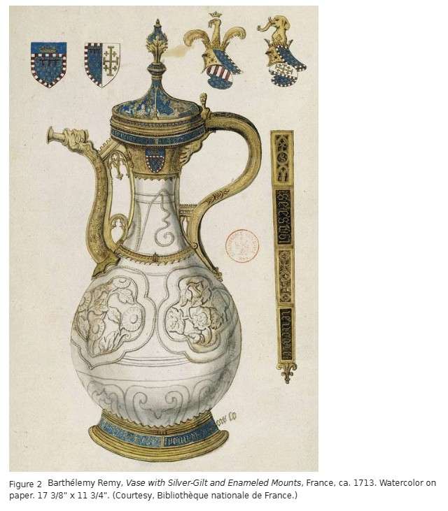 By 1416 this vase had moved to the Kunst- und Wunderkammer (chambers of arts and wonders) of Jean, duc de Berry, of France, and by 1689 it was in the collection of Louis, the Grand Dauphin (1661–1711), heir to Louis XIV. From him it passed to Bishop François Lefebvre de Caumartin (1668–1733), who in 1713 allowed François Roger de Gaignières, an antiquarian, to have it recorded in a watercolor (fig. 2).[7] Thus the vase assumed a new identity as an antiquity, now prized for its age and historical associations.