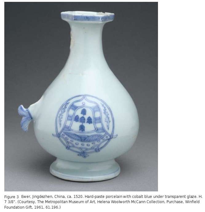 When you order something, there is always the risk that it will not turn out the way you expected. That is what happened with this ewer (fig. 3). It is decorated with the coat of arms used by Manuel I of Portugal (r. 1495–1521), but the arms are upside down. Though no doubt a disappointment to the person who commissioned it, it is one of the earliest pieces of Chinese porcelain decorated with a European design and provides clues as to how export porcelain was designed and made.