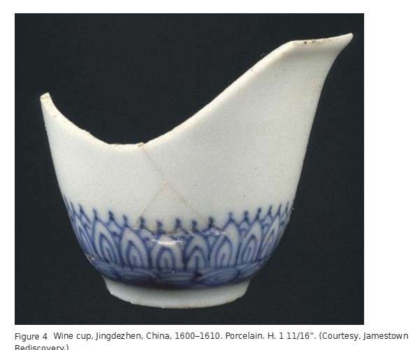 This tiny cup (fig. 4) is a symbol of the emergence of a global economy at the turn of the seventeenth century. It was used, broken, and discarded circa 1610 in Jamestown, Virginia, the first successful English settlement in North America.