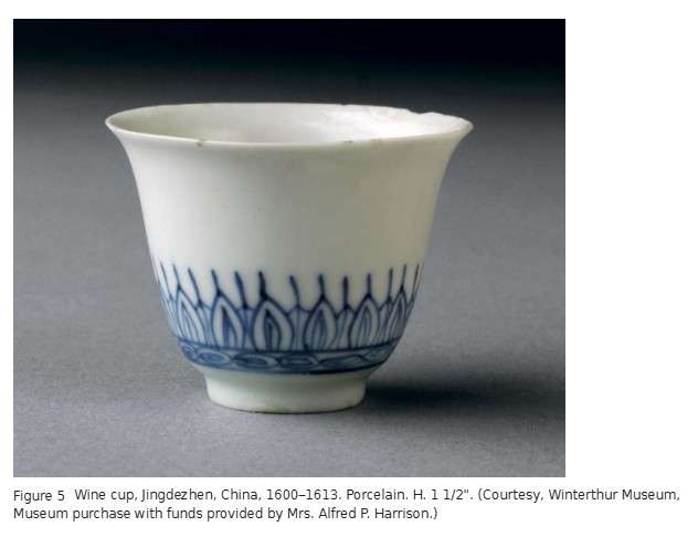 These finely potted cups must have been among the most common types of porcelain exported to Europe in the first decades of the seventeenth century (fig. 5). By 1619 officials in Amsterdam were begging their agents in Asia not to send any more “because the country is full of them.”[17] Despite the oversupply, cups like this continued to be exported until the 1640s, when civil war in China disrupted porcelain production.