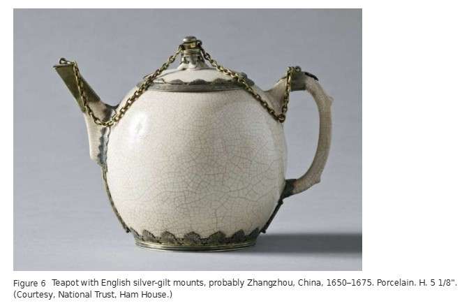 This teapot (fig. 6) is among the earliest known to survive in Europe. Made between 1650 and 1675, it is thought to have belonged to the Englishwoman Elizabeth Murray (1626–1698), Duchess of Lauderdale. Sophisticated, wealthy, and well connected, she was a regular at the court of Charles II (1620–1685), whose wife, Catherine of Braganza (1638–1705), is often credited with popularizing tea in England.[19]