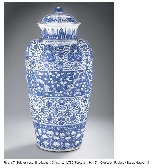 As the China trade became more established in the late seventeenth century, the amount of Chinese porcelain coming into Europe increased. Where before it had been hard to get more than a few pieces, it was now possible to build extensive collections. Large, showy, and expensive pieces like soldier vases were a mark of a collector’s wealth and sophistication. In addition to those owned by Augustus and Friedrich (who kept several), similar vases were acquired by numerous European royals and aristocrats and even by wealthy merchants. Richard Gough, a British East India Company merchant and the uncle of Harry Gough (see below), bought a set of three in 1692.[27]