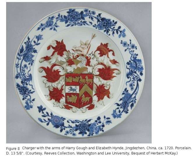 One of the ways Gough showed off his new status was by commissioning a set of armorial porcelain. Increasingly popular from the late seventeenth century, armorial porcelain was a way to demonstrate one’s wealth, status, and family heritage. It was especially popular among newly rich China trade merchants, who could easily commission dinner services through colleagues or during their own trips to China. Harry and Elizabeth Gough had at least three services of their own, and a fourth with the Gough arms may have belonged to them or to one of their relatives.[33]