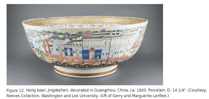 This punch bowl (fig. 12) depicts the European and American trading offices, or hongs, in the Chinese port of Guangzhou. “Hong” comes from hang, the Cantonese term for company or business, and I-kuang, which translates as “barbarian houses.”[48] Hongs were located along the waterfront outside the city walls and were identified by flags on poles in front of the structures. Few Westerners—all of whom were male, as Western women were not allowed in Canton—were permitted any farther into China. Samuel Shaw, the first American merchant to go to China, noted with some disappointment that “Europeans, after a dozen years’ residence, have not seen more than what the first month presented to view.”[49]