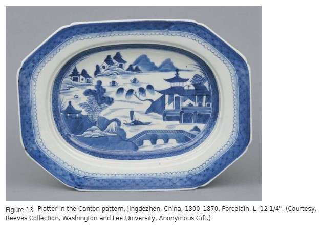 This platter, decorated in the so-called Canton pattern (fig. 13), belonged to Mary and Robert E. Lee, and is part of a set thought to have been their everyday china while Lee was president of what is now Washington and Lee University from 1865 until 1870.