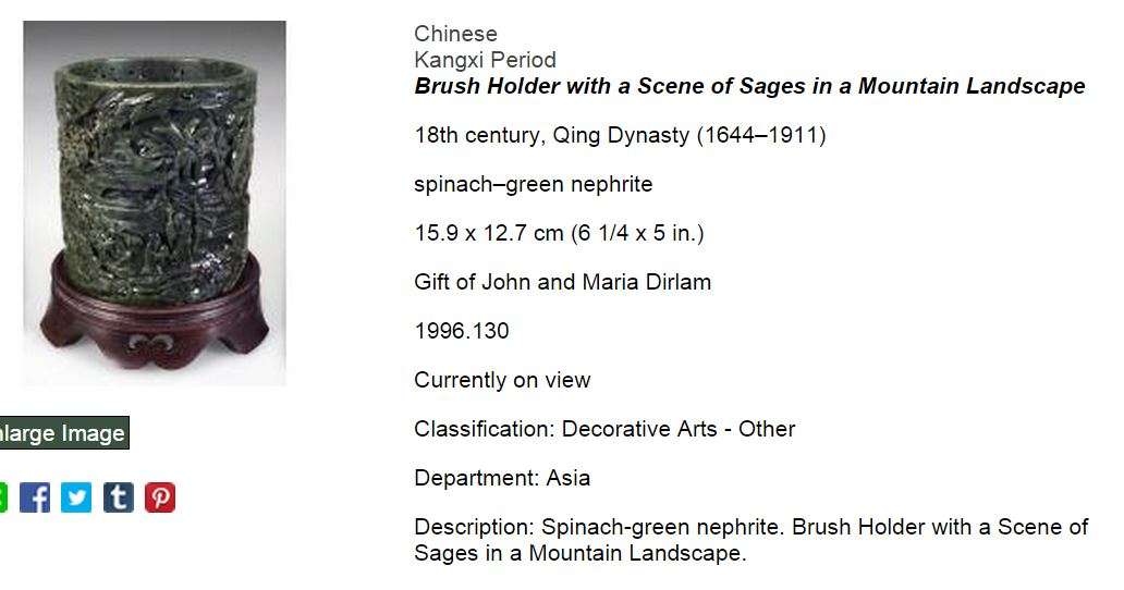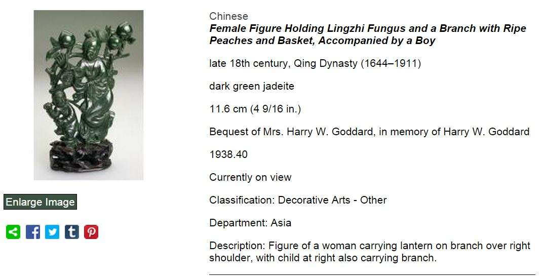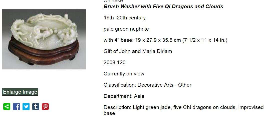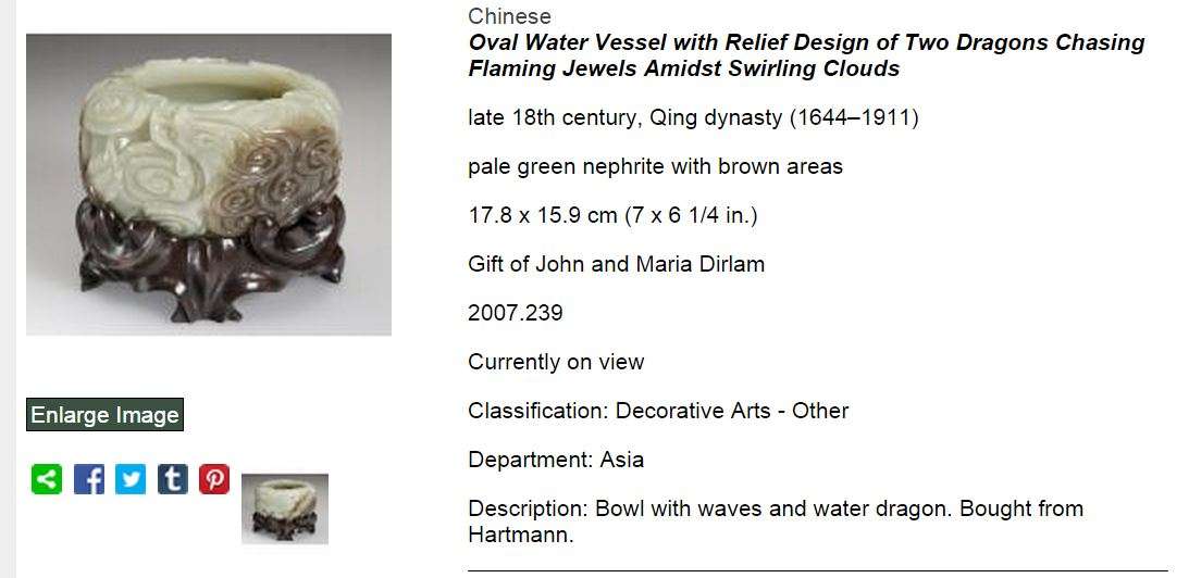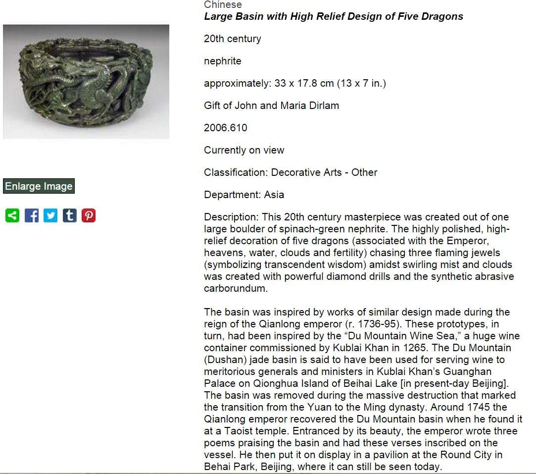 While the museum's collection of jades is not the largest in the world, the institution has a good number of truly superb examples donated by several generous benefactors over the museum's 115 year history. Of the gifts those from Worcester County industrialist, Harry W. Goddard, (1863–1927) and Maria and John Dirlam, Mr Dirlam is the president J.I. Morris Co., in Southbridge, Massachusetts are stand outs. Hats off to both of them! Many examples in the collection are from the Qianlong (1735-1795) period which many collectors view as the high point in the history of Chinese jade carvings.