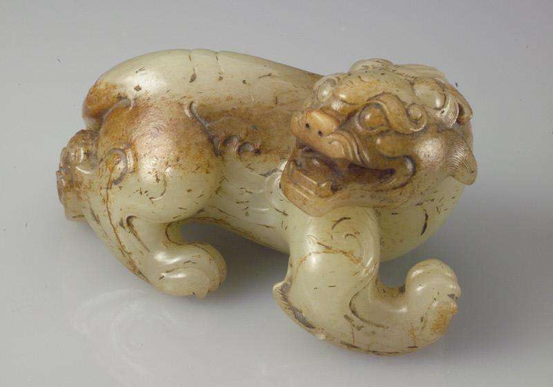 Carved from striated pale green and russet nephrite this classical form was first seen during the Han dynasty, the Bixie measures 6" in length.