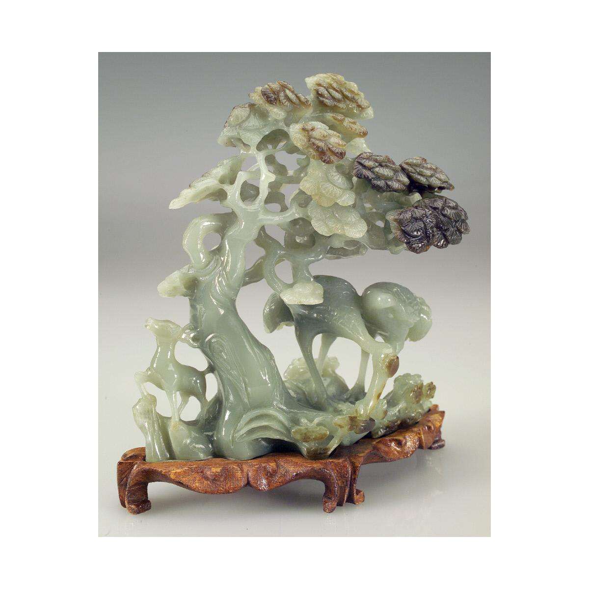 - 20th C. Nephrite Statue with Birds, Deer and Pine Tree