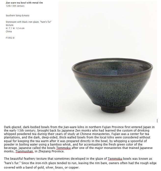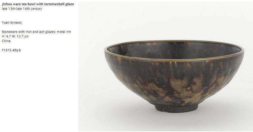 - Jizhou ware tea bowl with tortoiseshell ash glaze and metal rim.