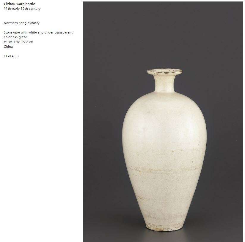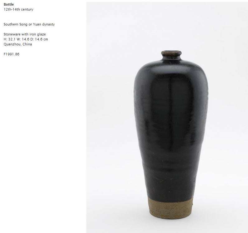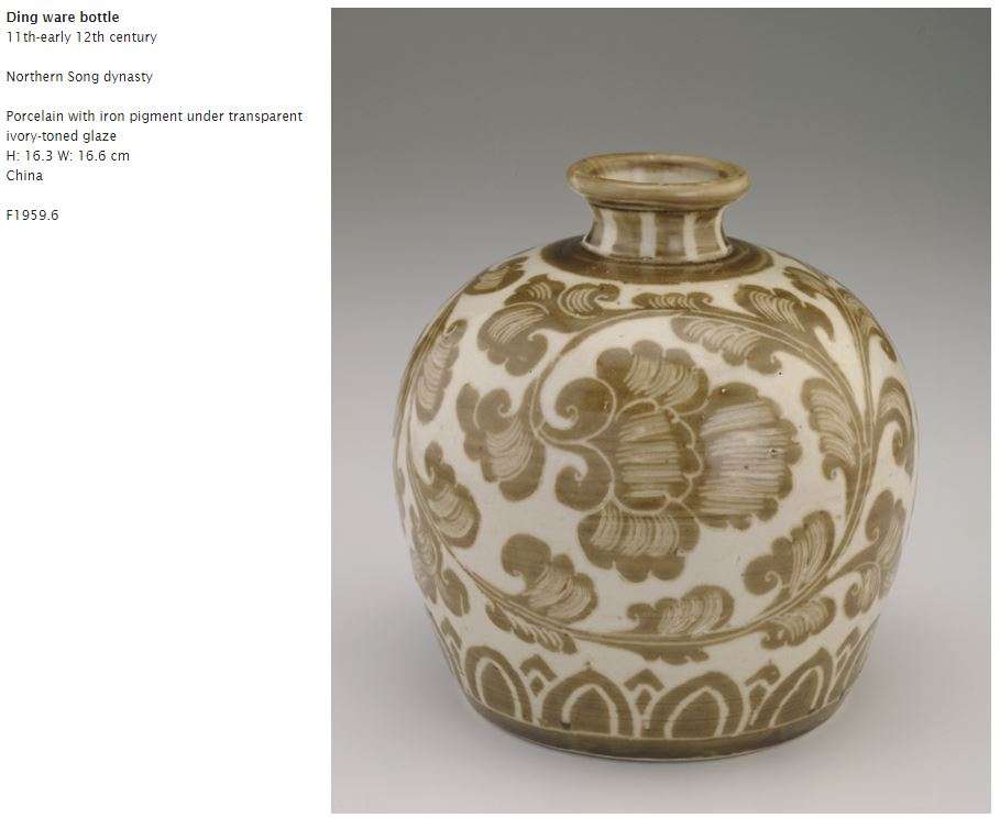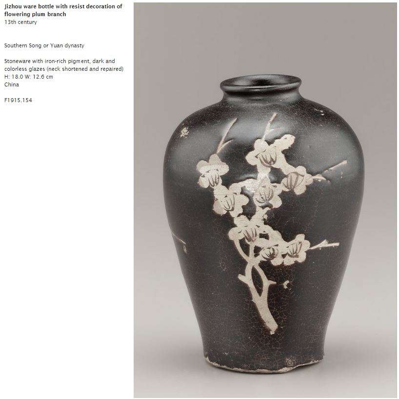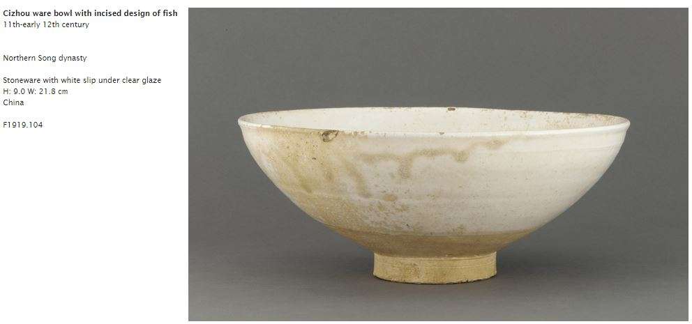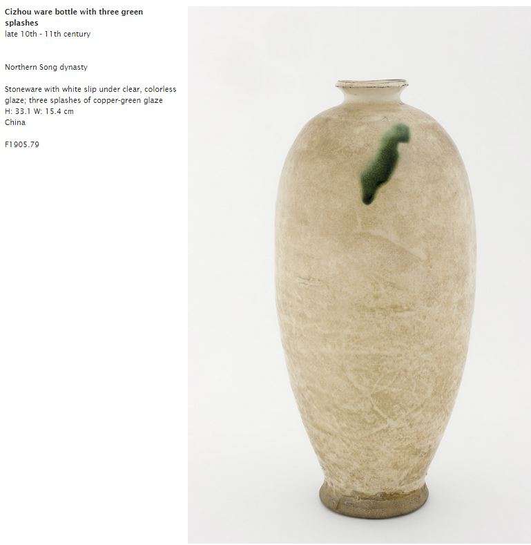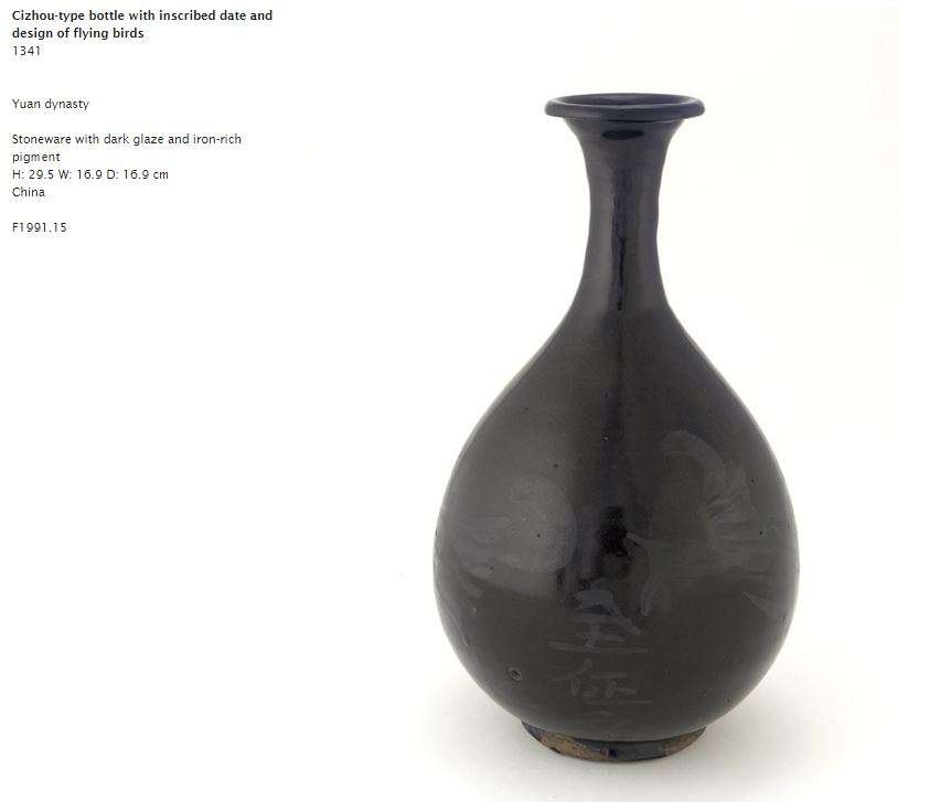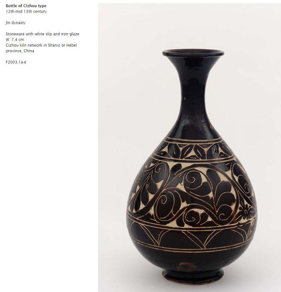 With continuation of only slightly different ceramics being made with the introduction of radically different cobalt decorated porcelains it was an exciting time. So true were some pieces made later in this era dating some objects accurately became difficult. This difficulty is evidenced by numerous Freer-Sackler entrees describing pieces as "Southern Song to Yuan" or "Jin or Yuan", "Northern Song or Jin" etc. To further illustrate this difficulty, one example in the collection is dated Song Dynasty or "Modern".