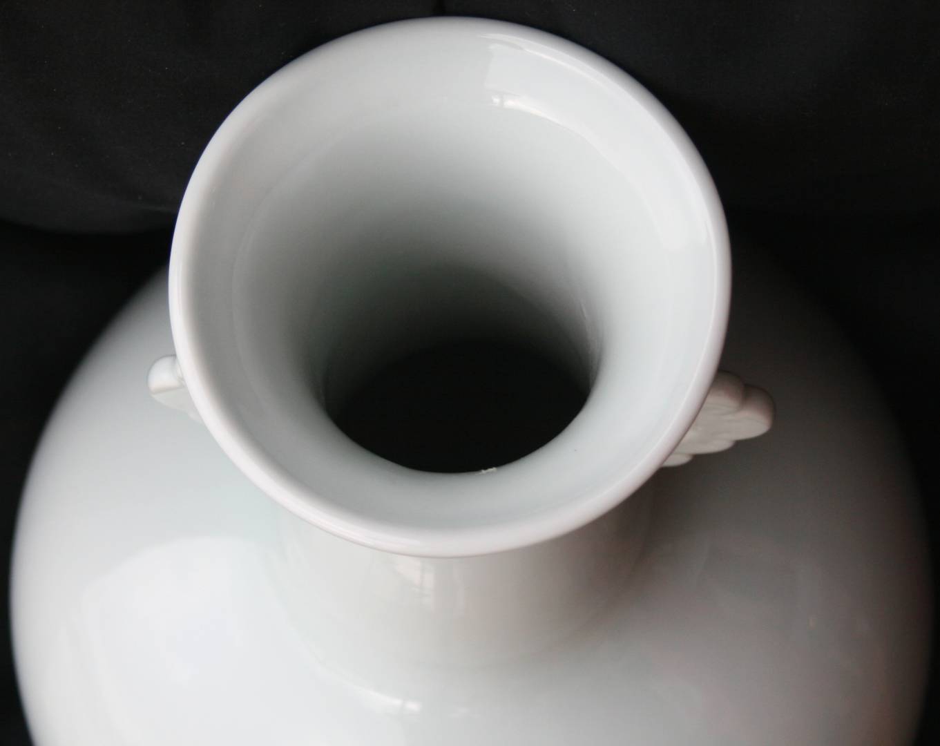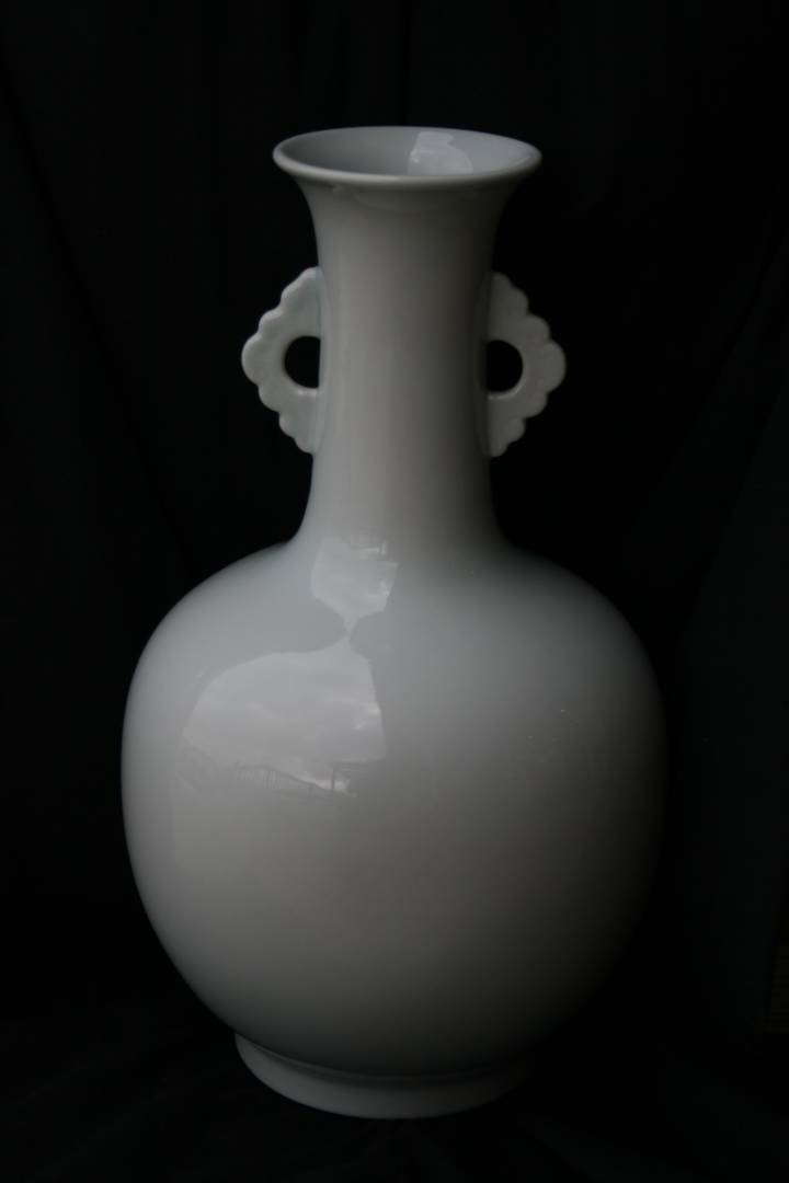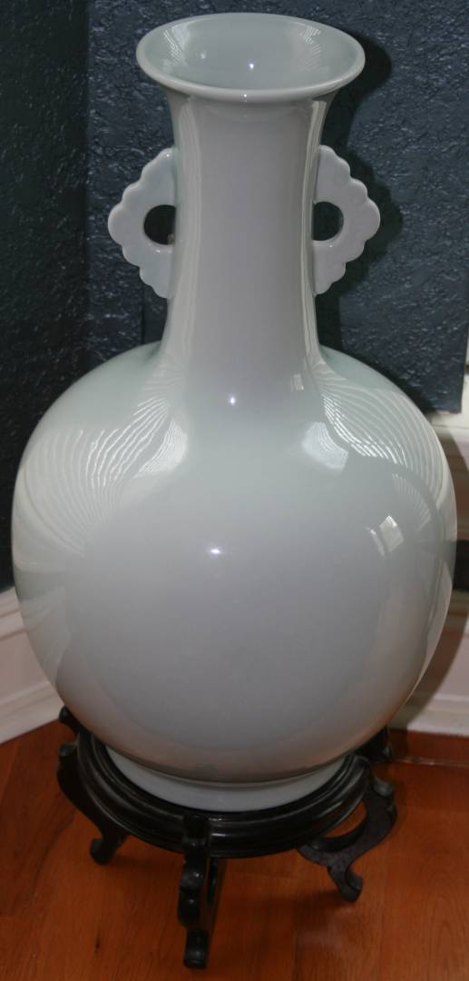 Im picking this up on Saturday. Its a nice vase, about 8.5 inches tall by around 12. Its a monochrome double handled style with a blue-gray celadon tint. The shop stated its more blue in person so the exterior lighting may be affecting its appearance. Its hard to tell if something is engraved on the center of the bottom as well.