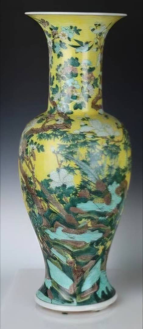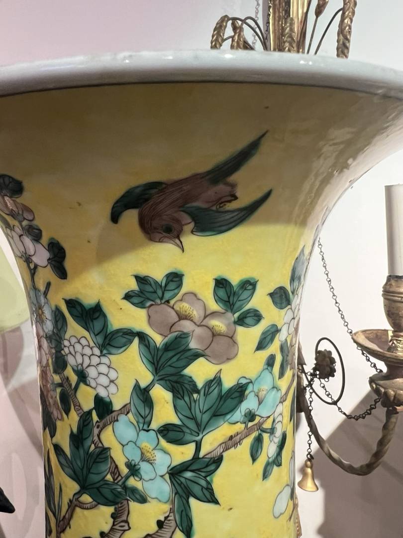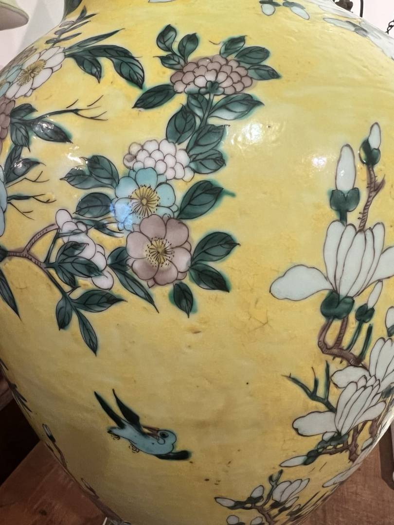 the famille noire vase is late 19th century, the lamp vase is most probably Kangxi, pity for the several damages besides missing the top part. This guy takes horrible pictures, in the sense that they are clear but too much close, hence the shape is very distorted.