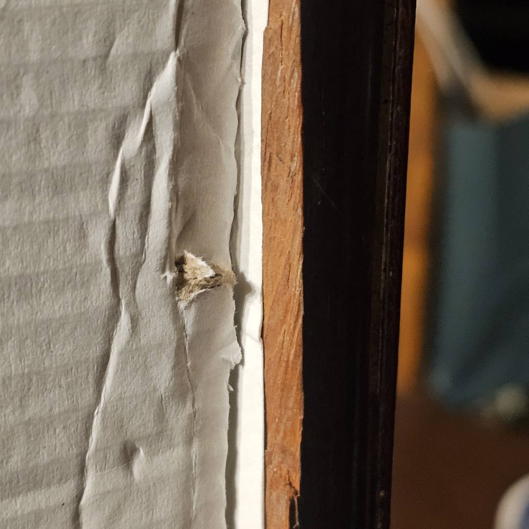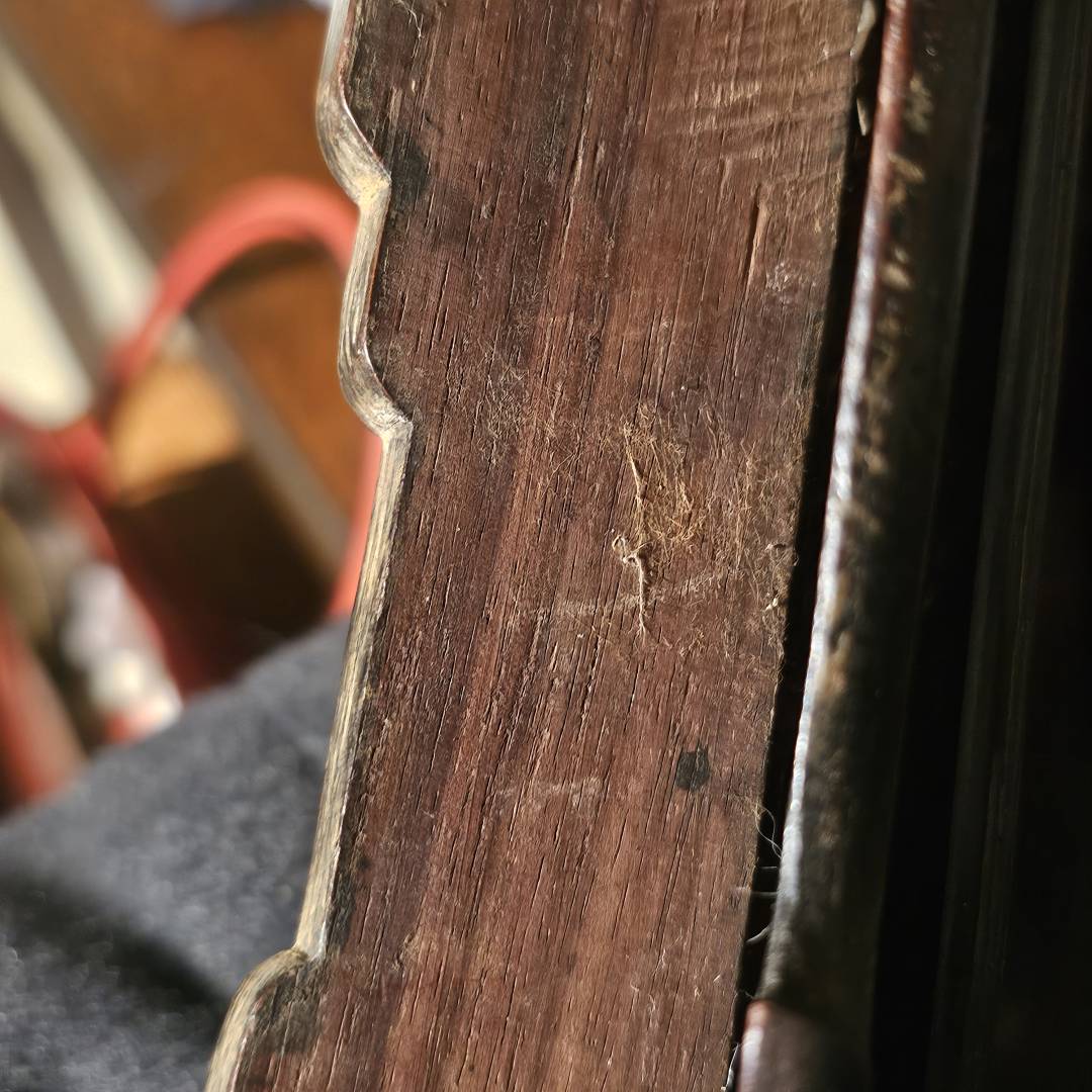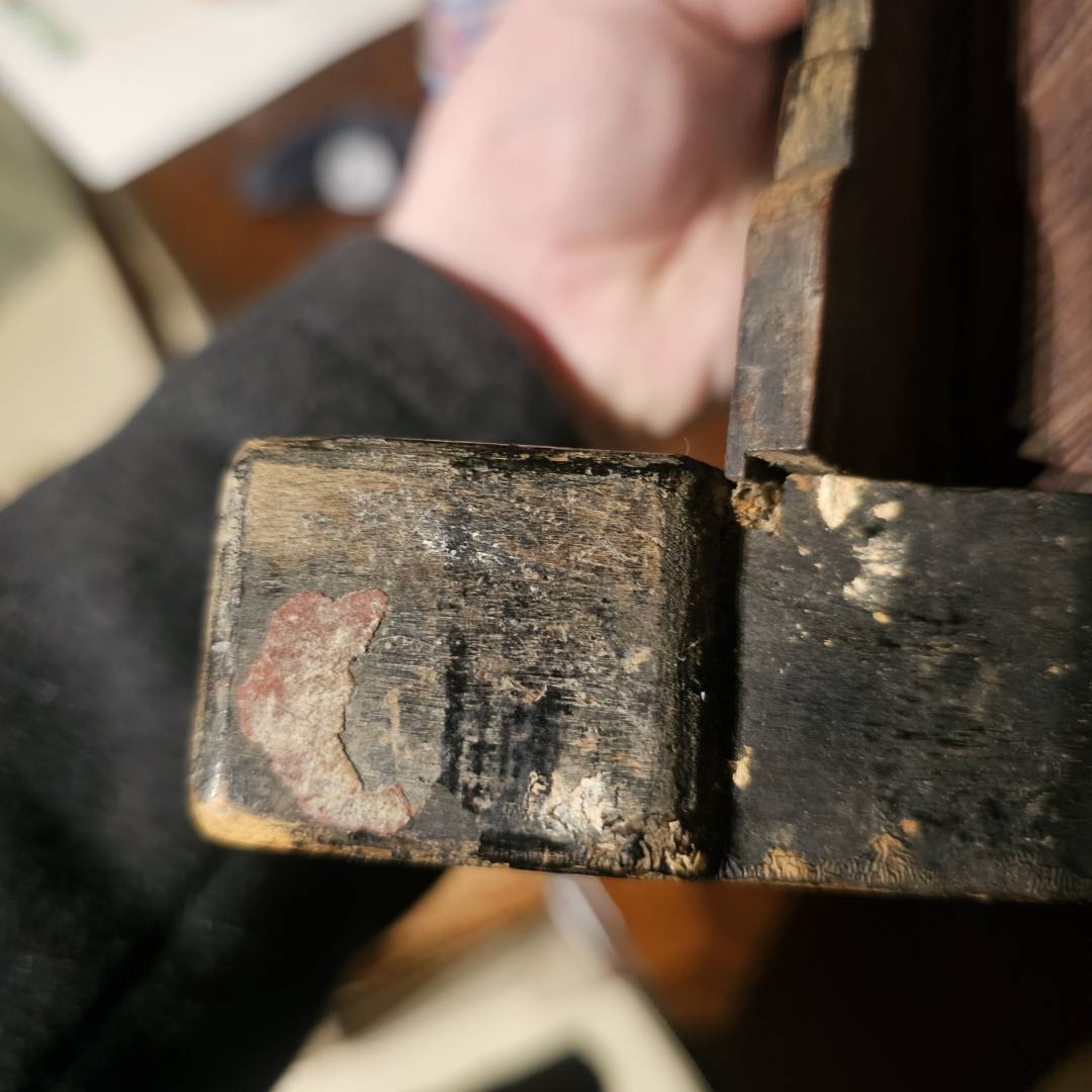 - The back panel is missing and left exposed. What i want to do instead is apply a piece of pine panel and do a dark stain/matte glaze finish to recreate the tint. I have some scrap boxes that would fit the bill and partial age to help recreate the appearance.