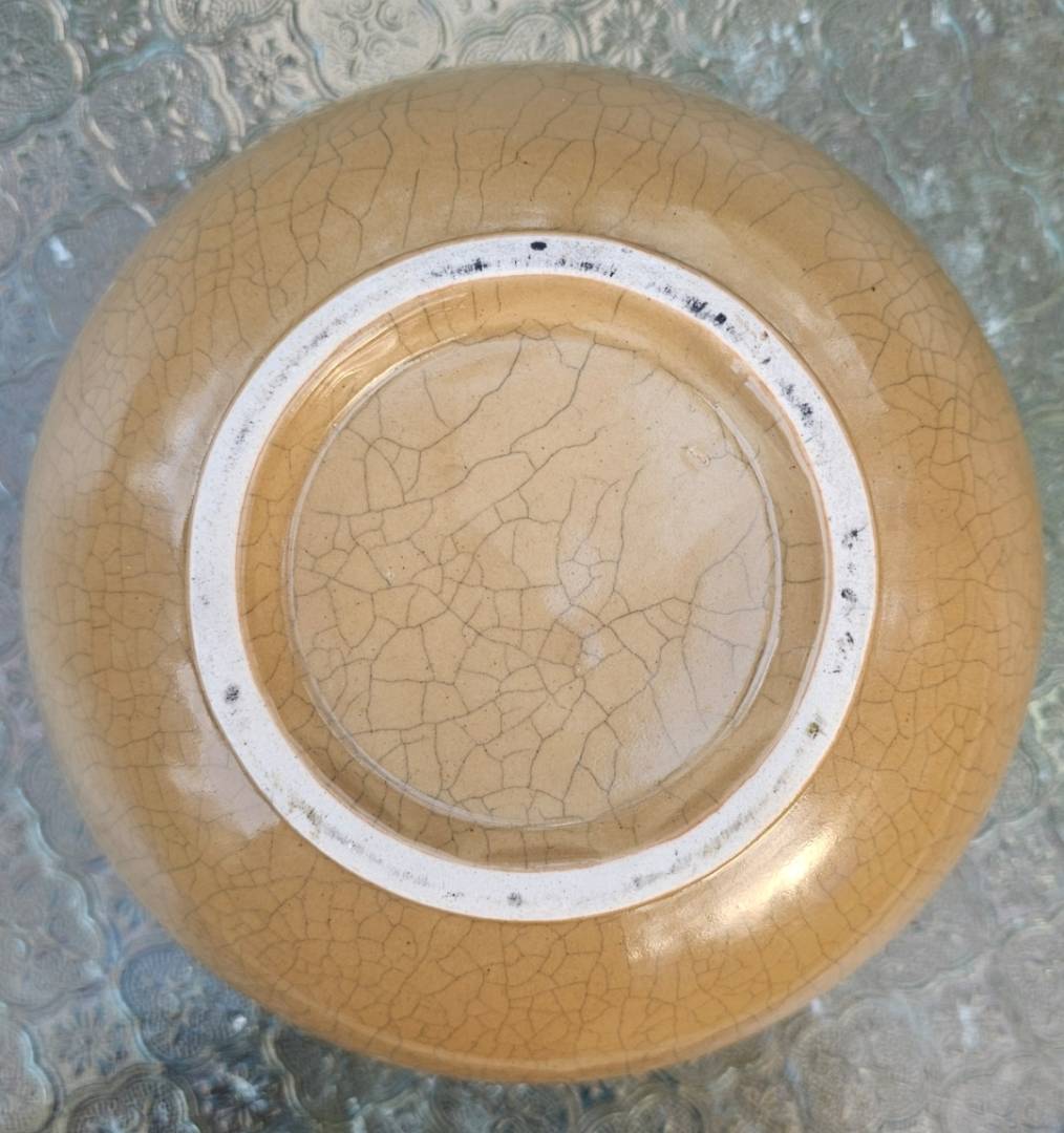 Its not perfectly round, and shows hand glazed pooling throughout but the foot rim feels off and I dont think theres as many scratches as there should be to be anything over 100 years old. Although it has some pops and a spur mark on the foot bottom.