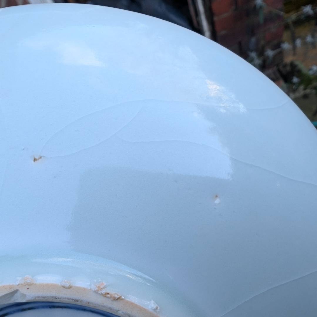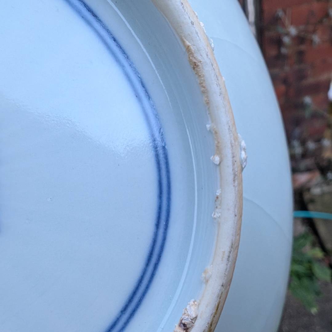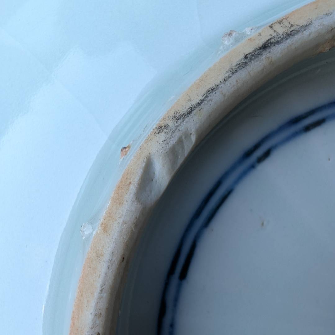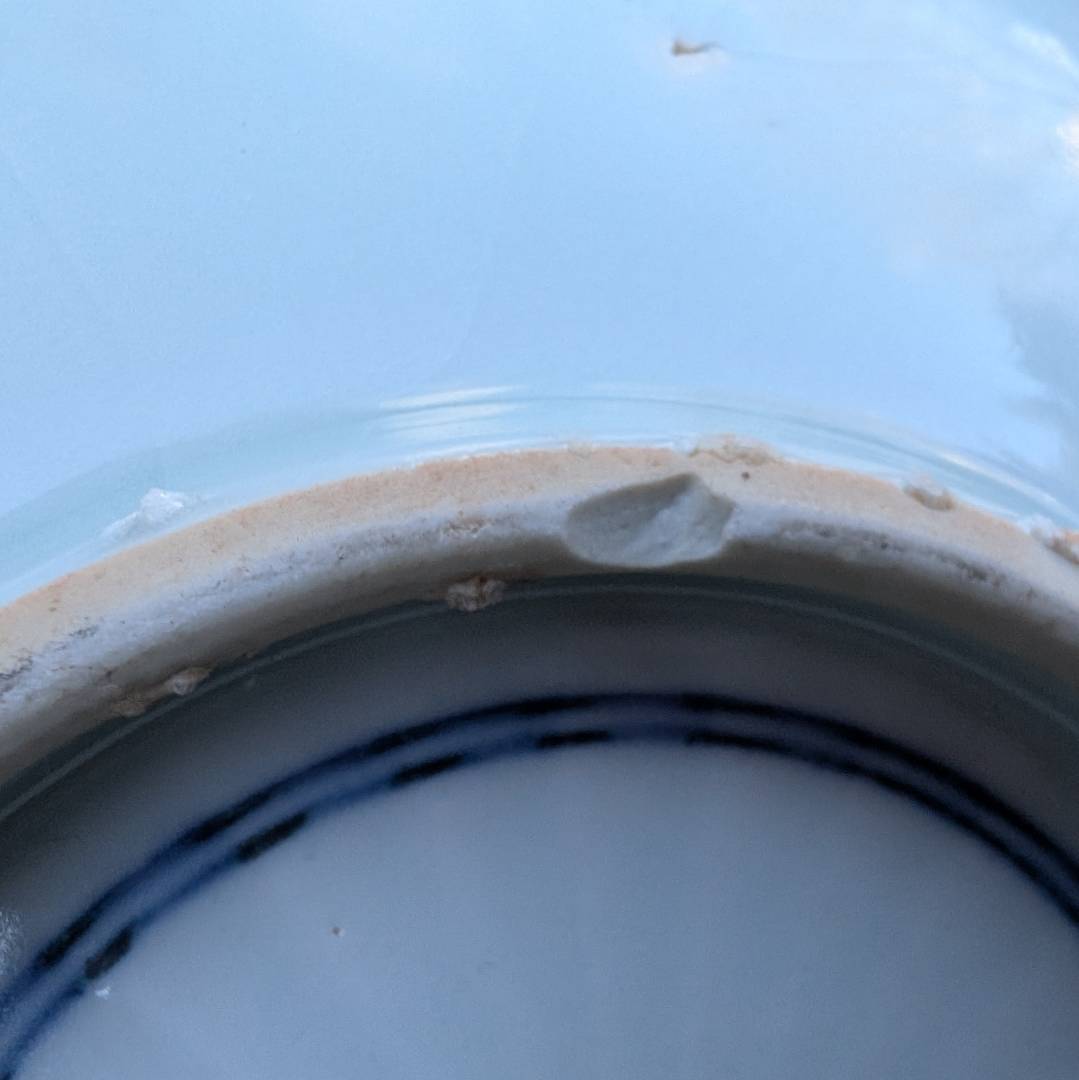 An interesting point about the chips to the foot that may not be clear in the photos is that the porcelain exposed is a very similar iron oxide colour to the rest of the foot instead of the white you would expect. Perhaps the chips were done pre firing or the whole foot was coloured after the chips were made.