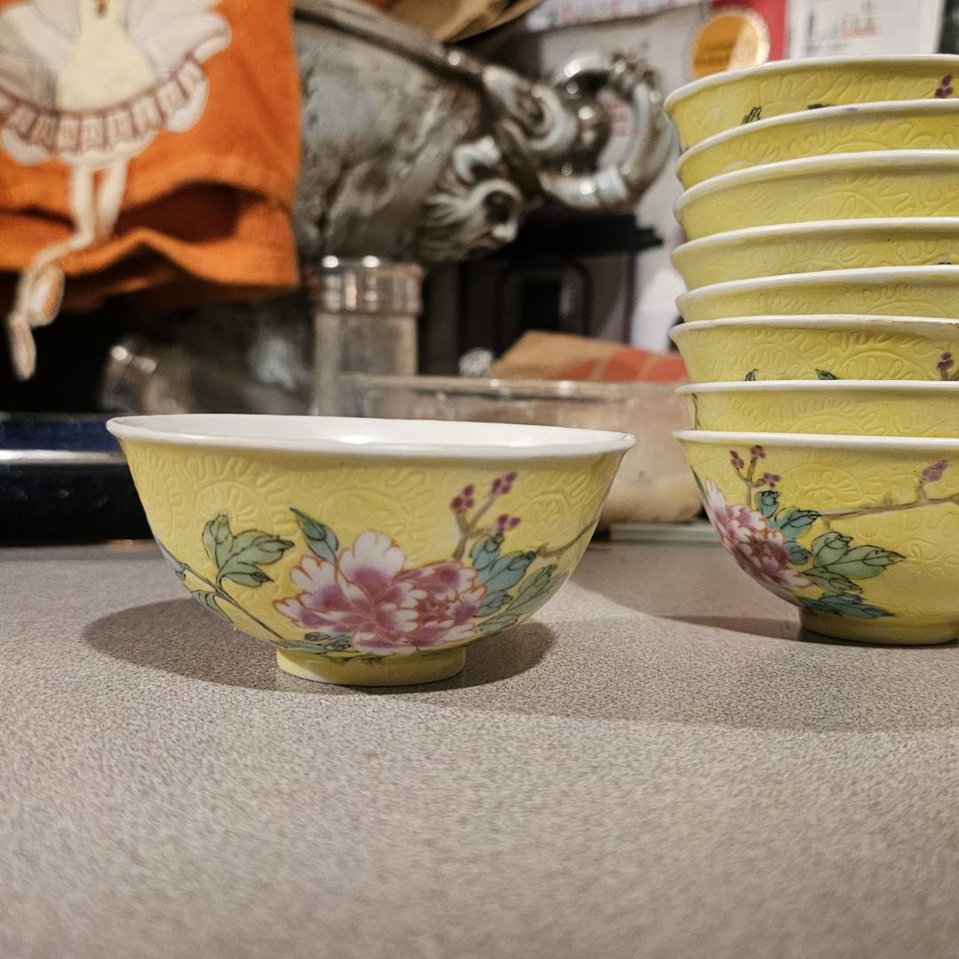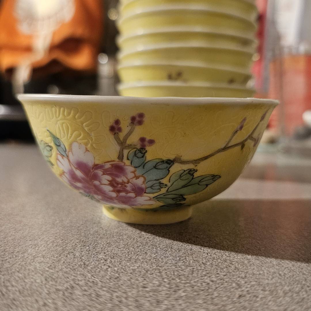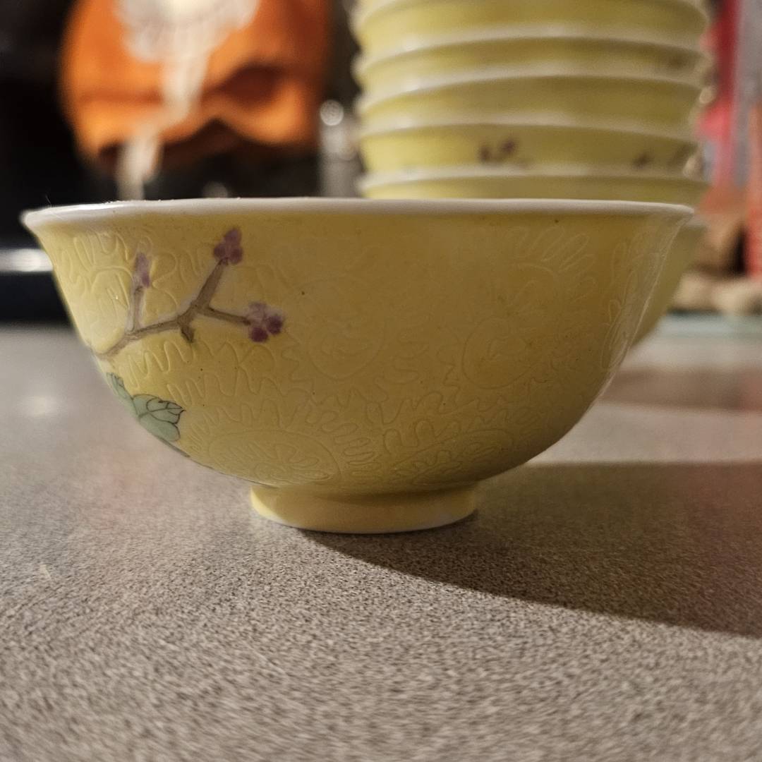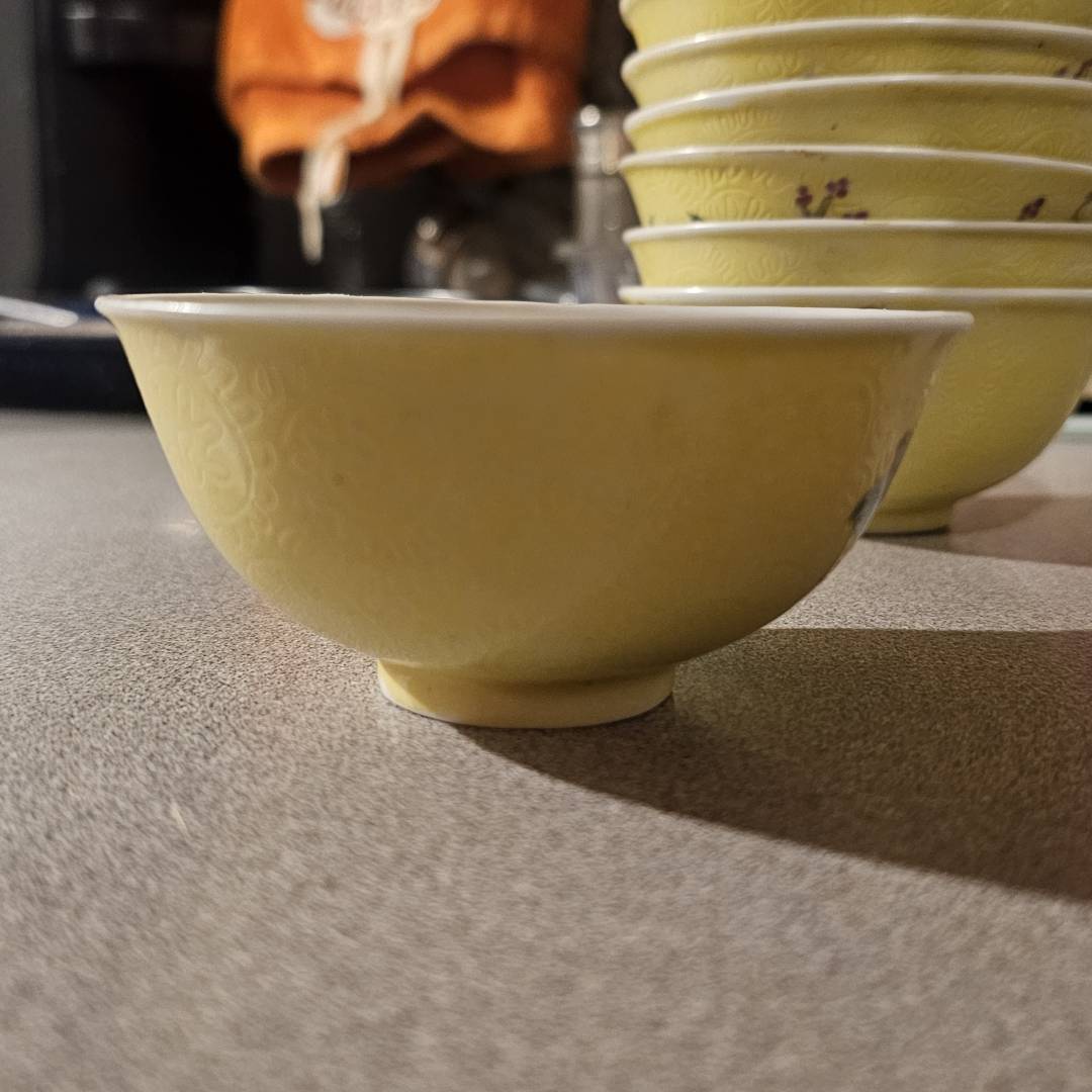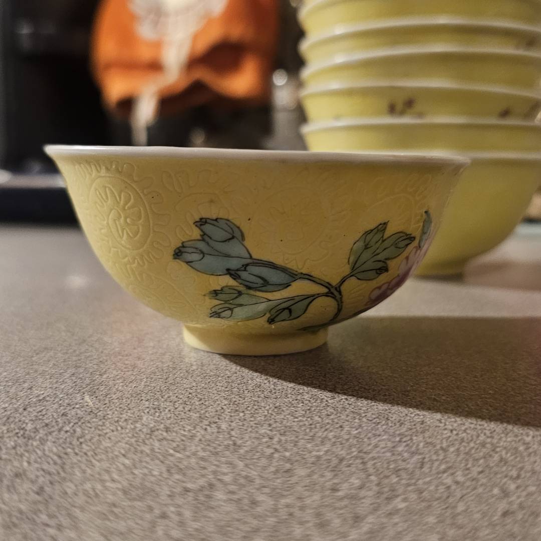 I have this set of 9 matching handpainted enamel bowls with yand done sgraffito applied to each, white inner, and partially translucent from top down stopping to wards the base.