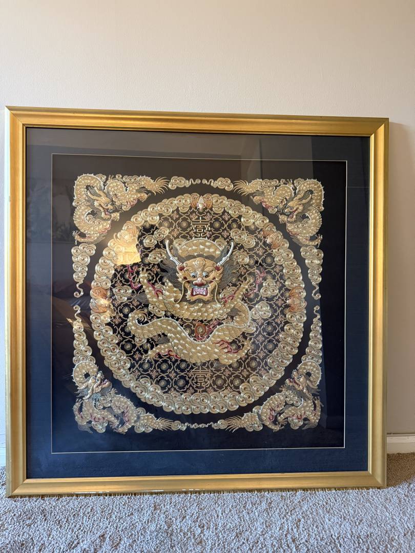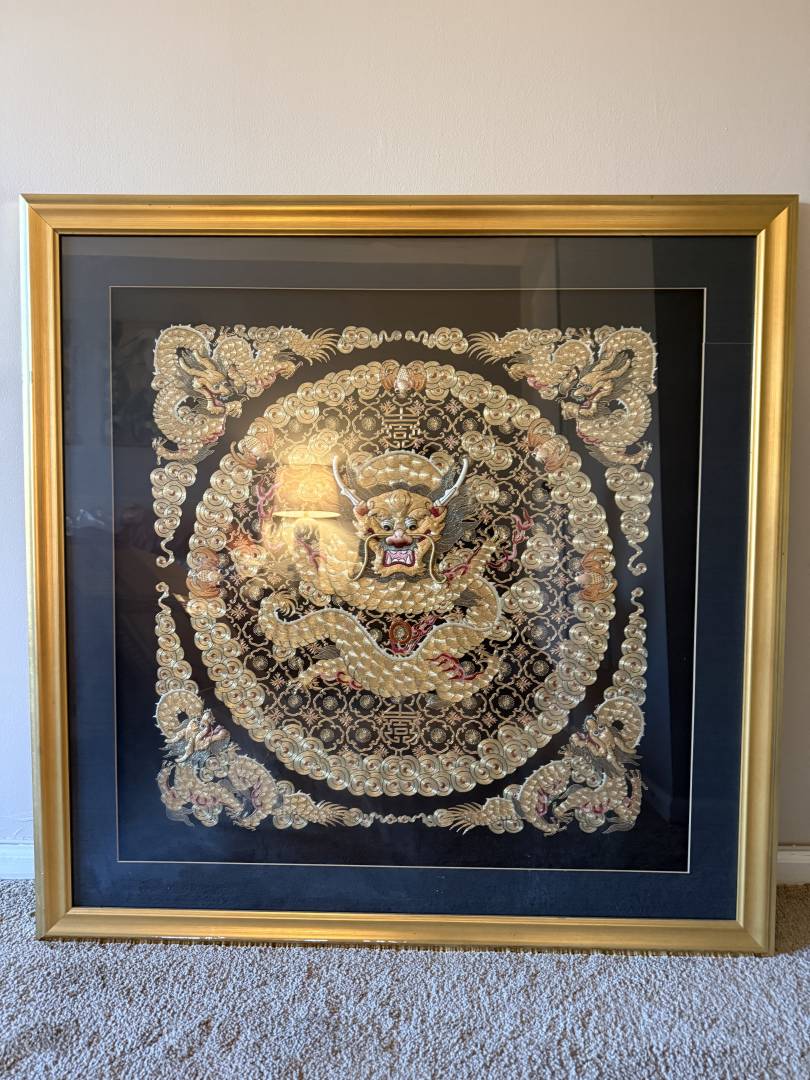 Hello there, I have picked this artwork up almost a decade ago. It is 3 feet by 3 feet Hand-embroidered Chinese gold-thread dragon textile (imperial court style), likely late 20th century export art. It is from Artion Gallery Hong Kong. The gallery doesn't exist anymore, they do have a few more galleries around Europe but whenever I tried to ask information on the piece they wouldn't get back to me. Any chance someone could give me a bit mow information on this piece?