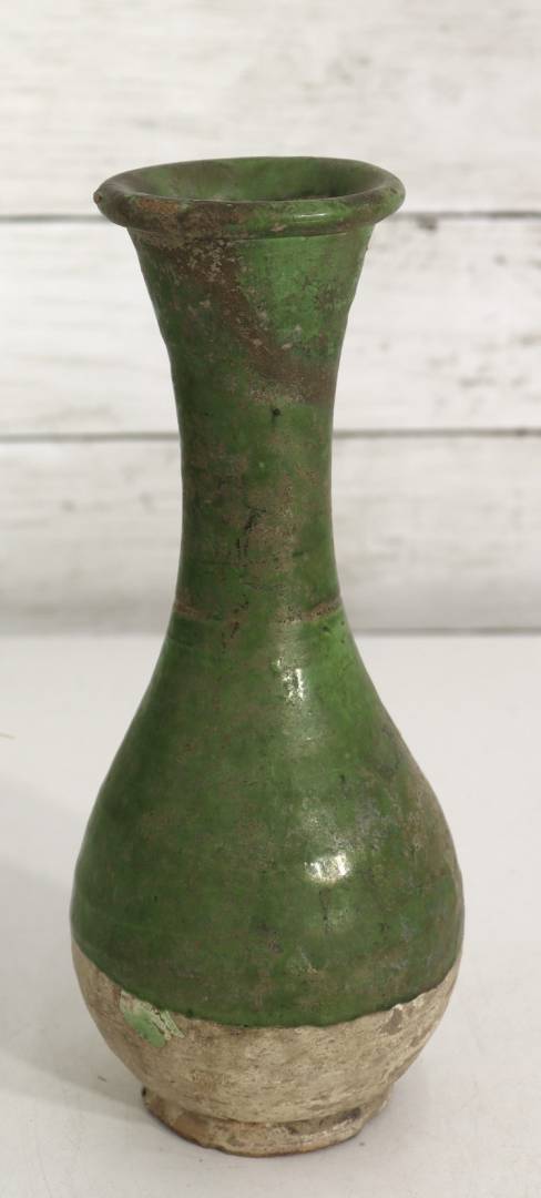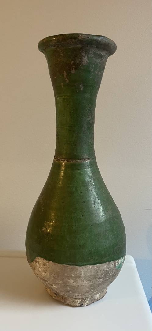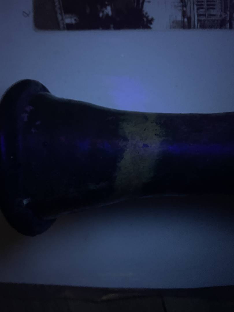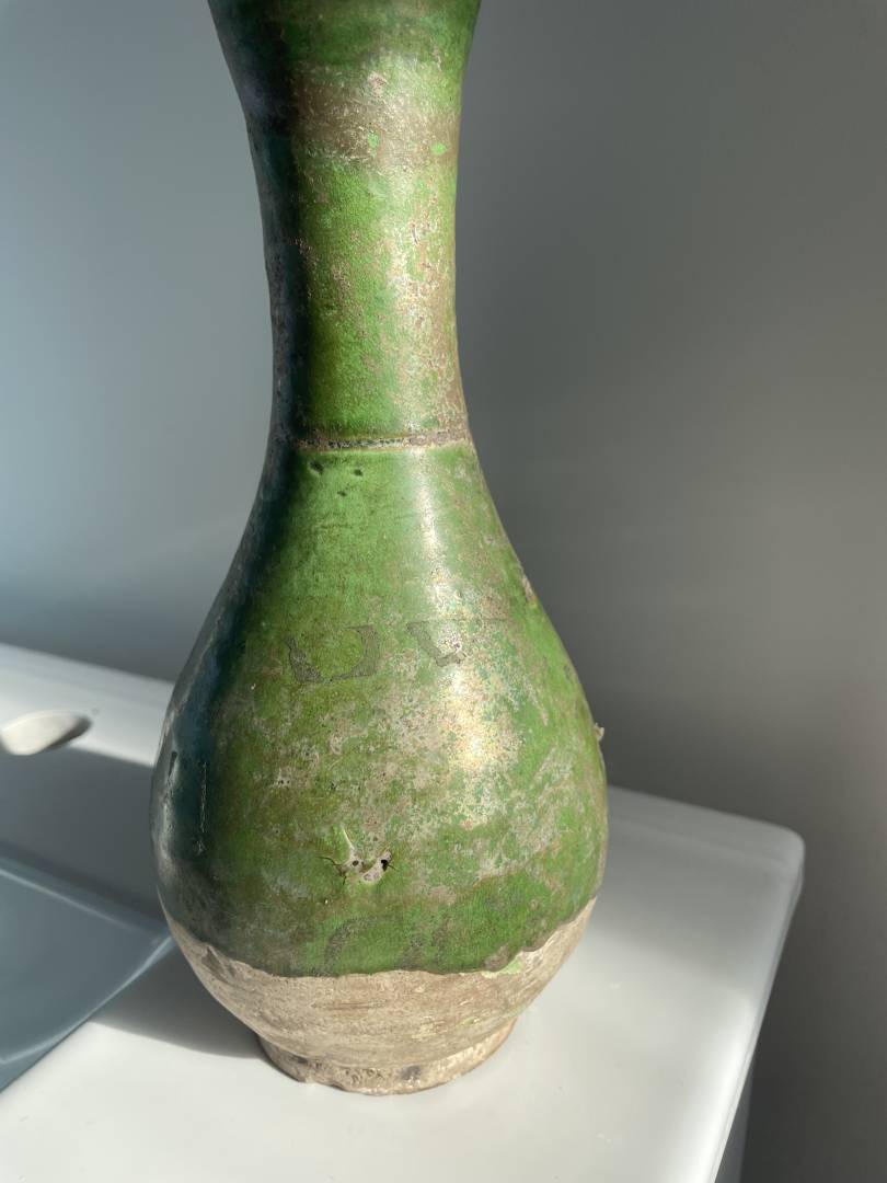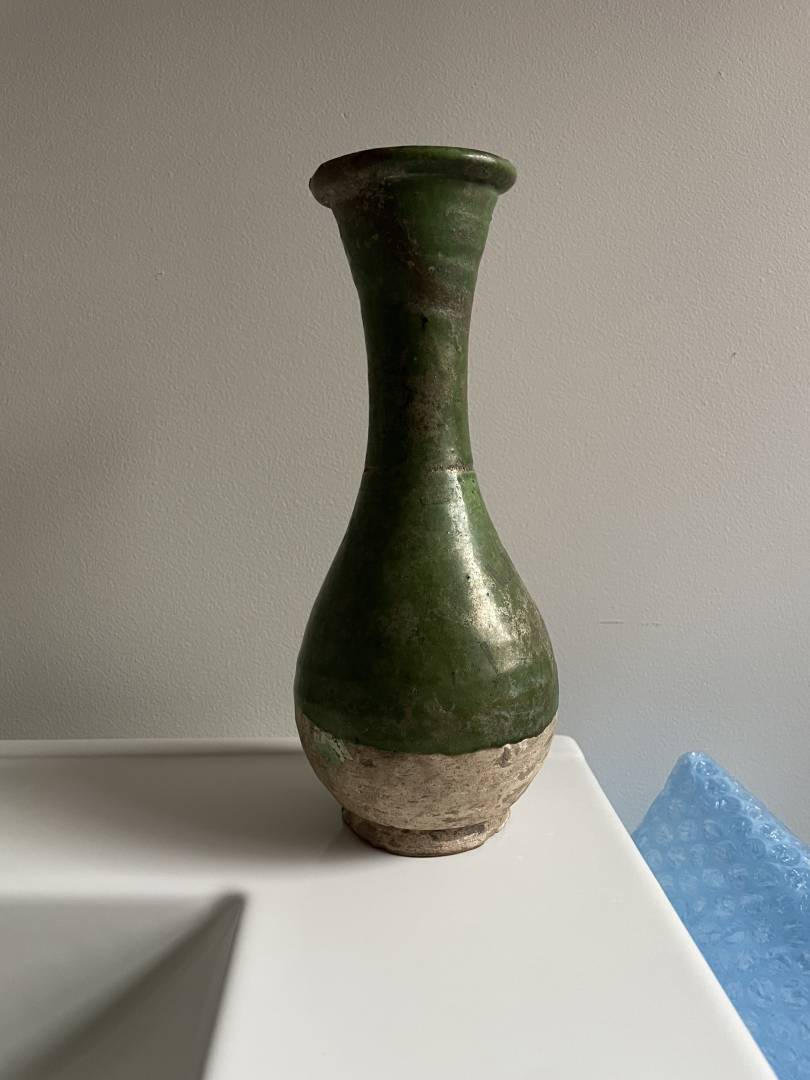 It looks very similar to green glazed Liao Dynasty vases I see at auction houses but it has a smaller opening. The base also seems similar to others, but it has UV reactive residue on it and a repair on the brown band near the top. There’s dirt inside and on the base, and the side is iridescent like it’s been buried for a while.