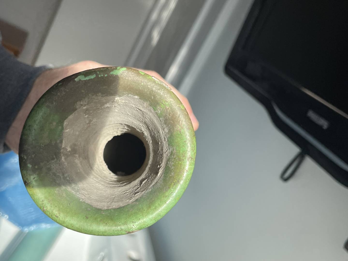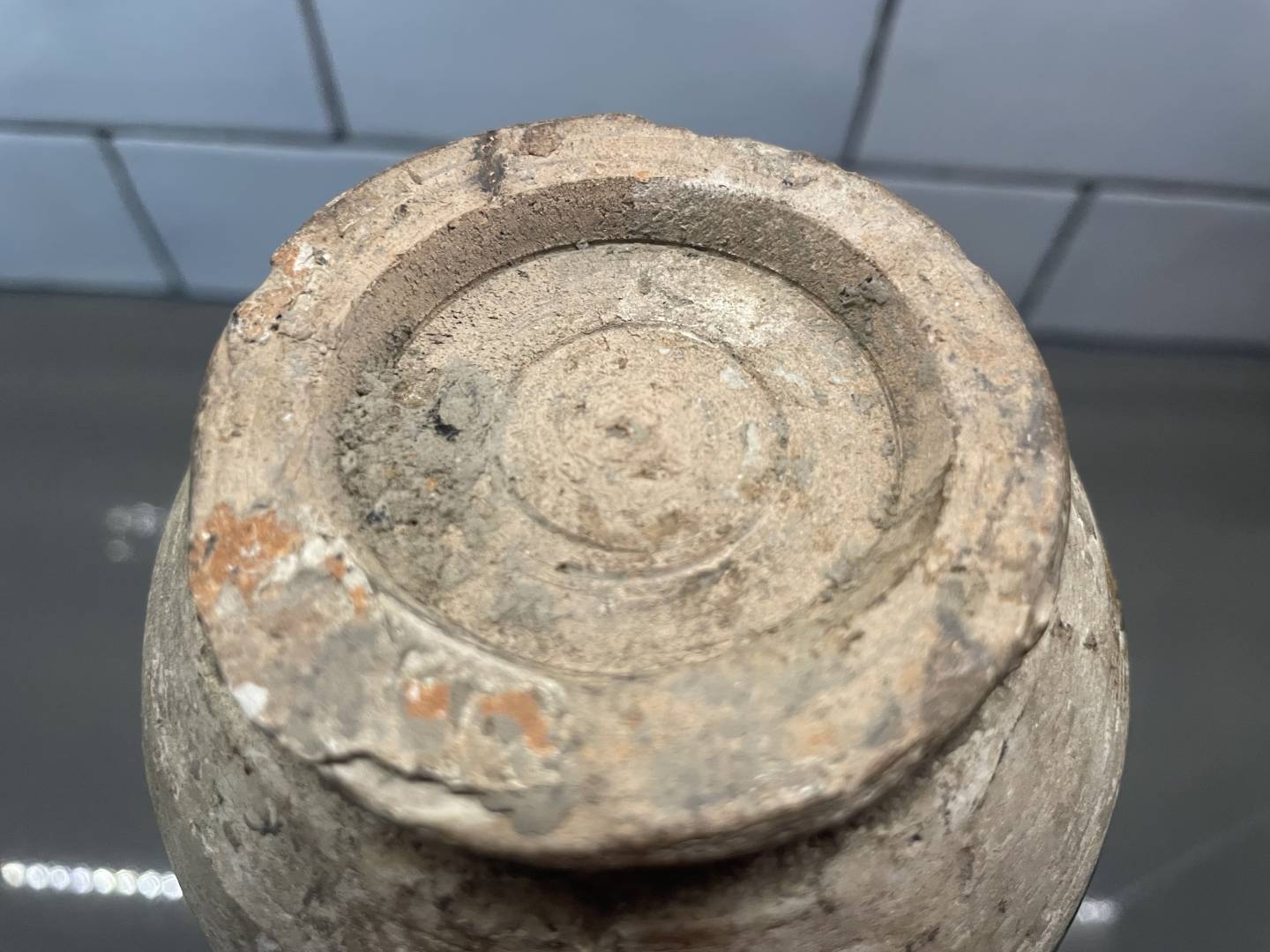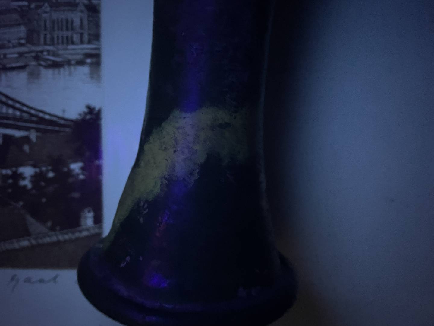 It looks very similar to green glazed Liao Dynasty vases I see at auction houses but it has a smaller opening. The base also seems similar to others, but it has UV reactive residue on it and a repair on the brown band near the top. There’s dirt inside and on the base, and the side is iridescent like it’s been buried for a while.