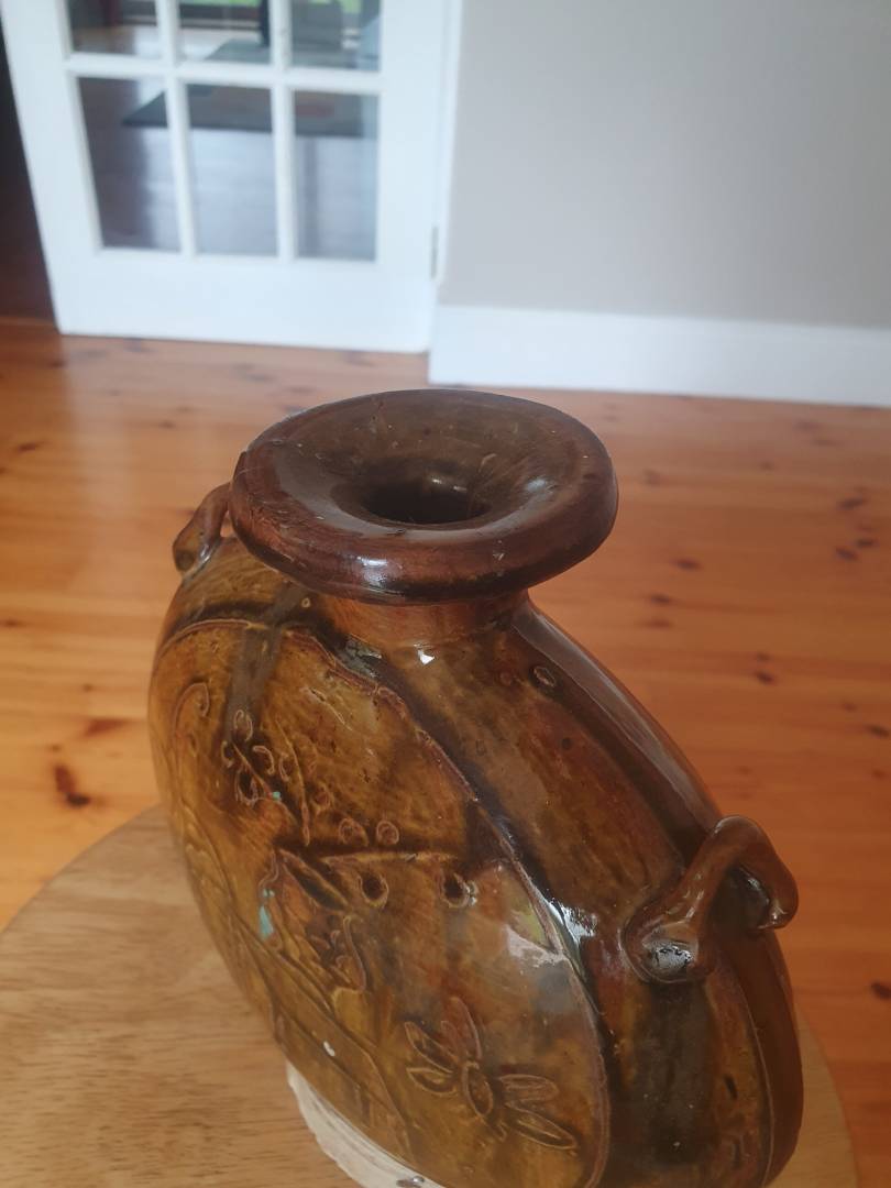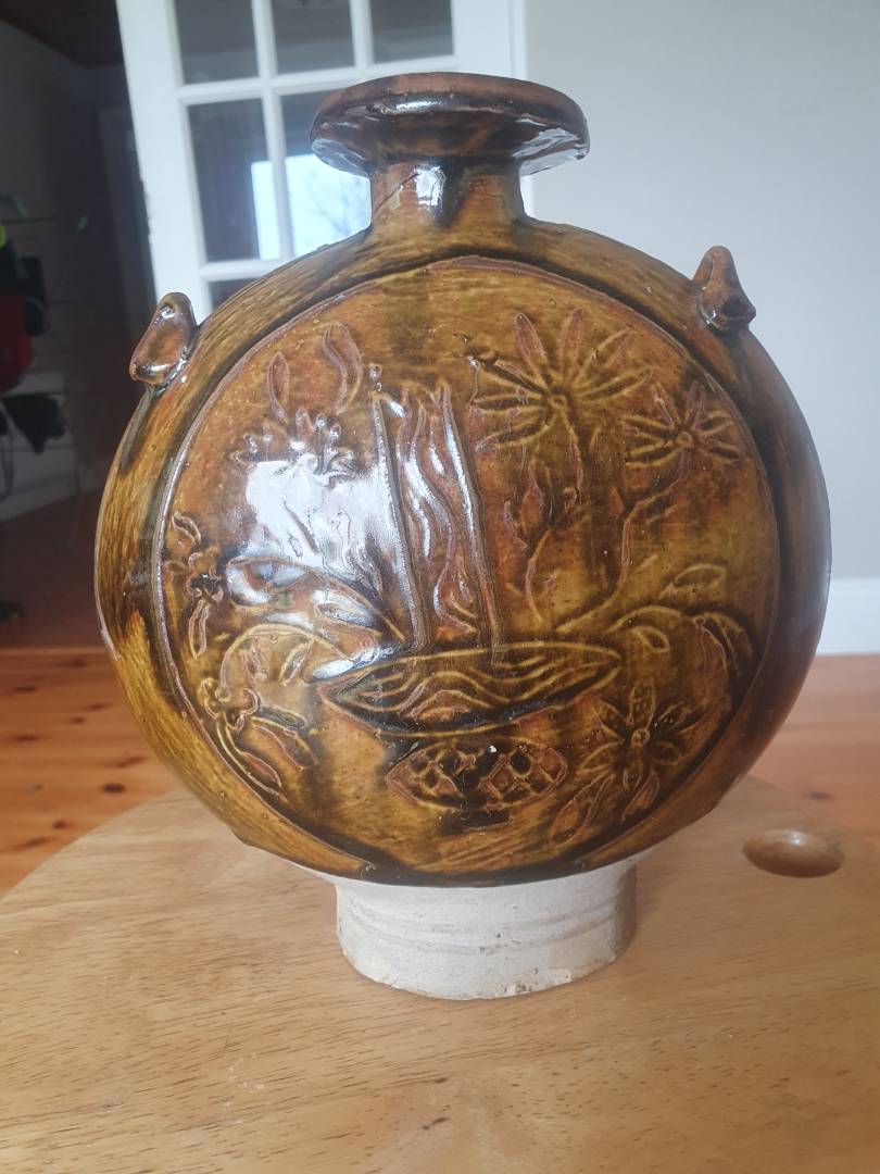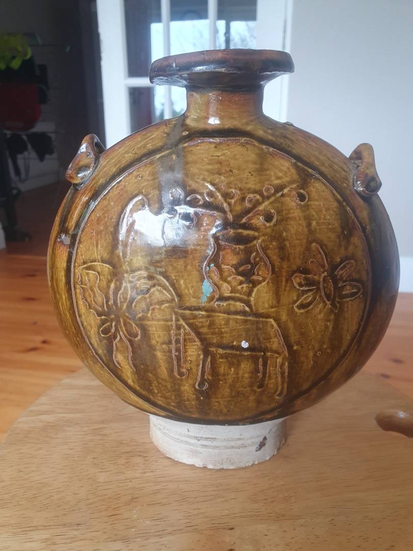 Am wondering can someone help identify origion and possible age of this moon flask I am researching.