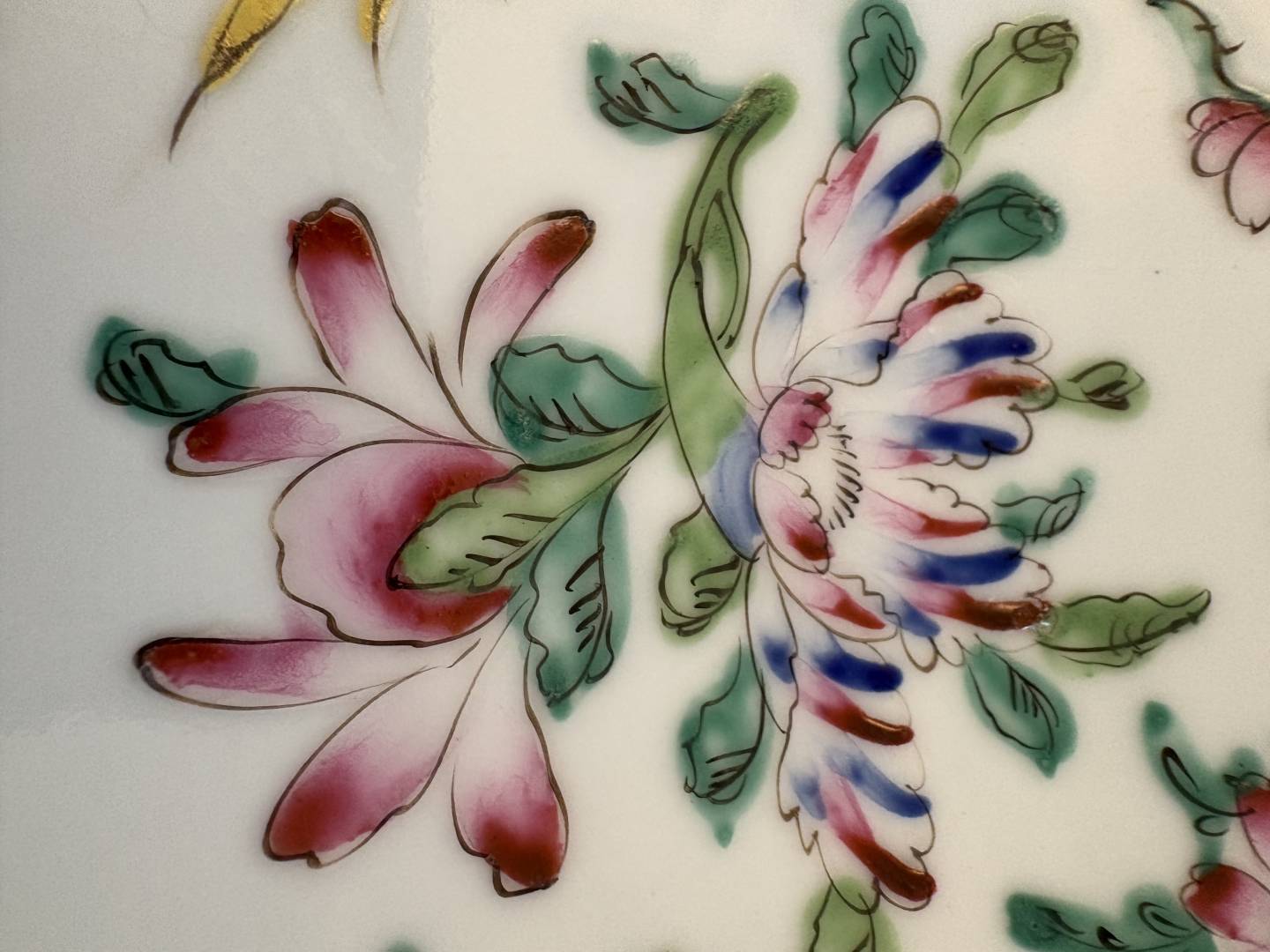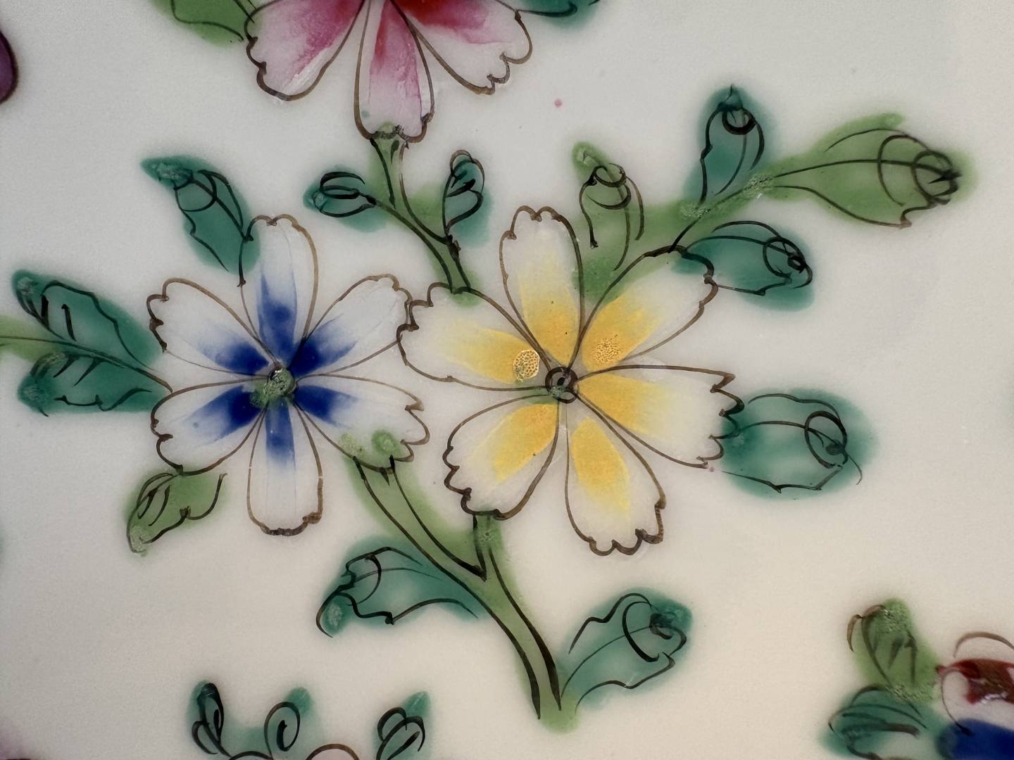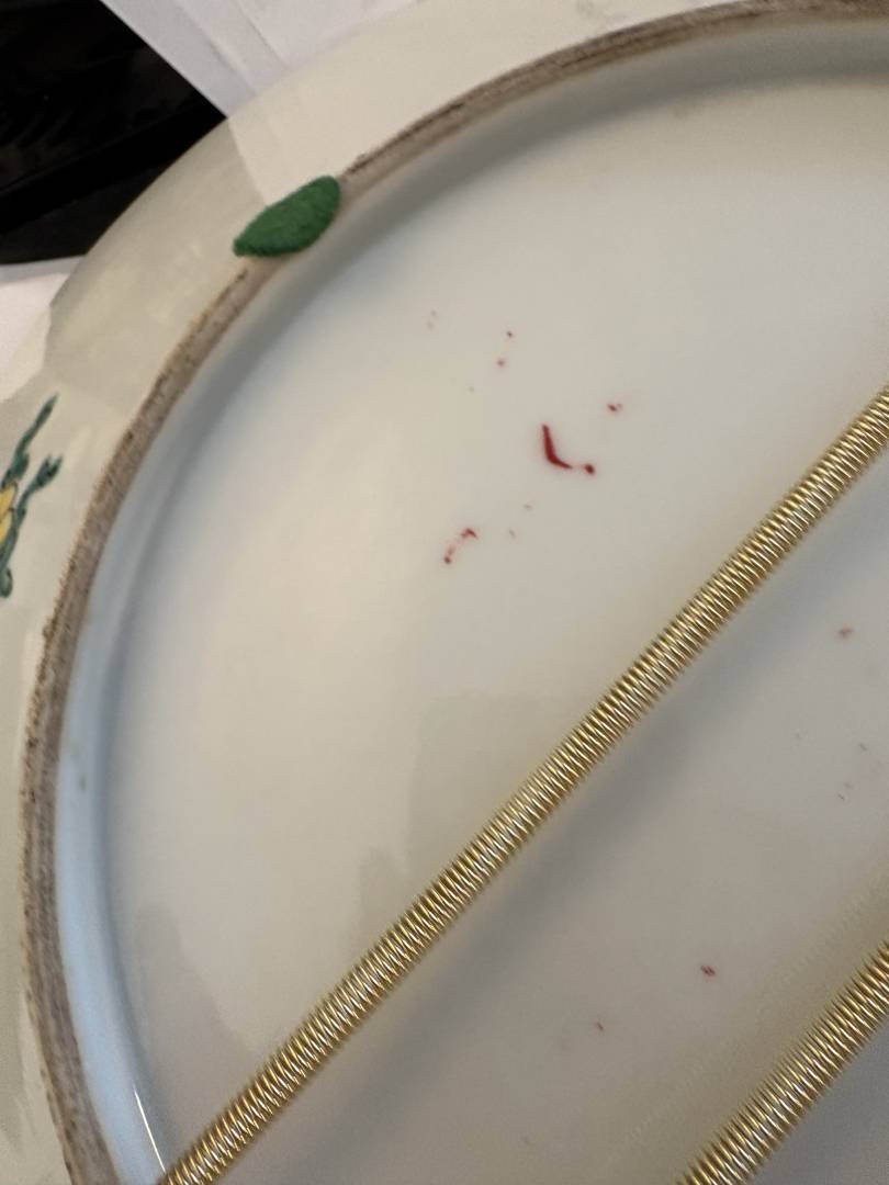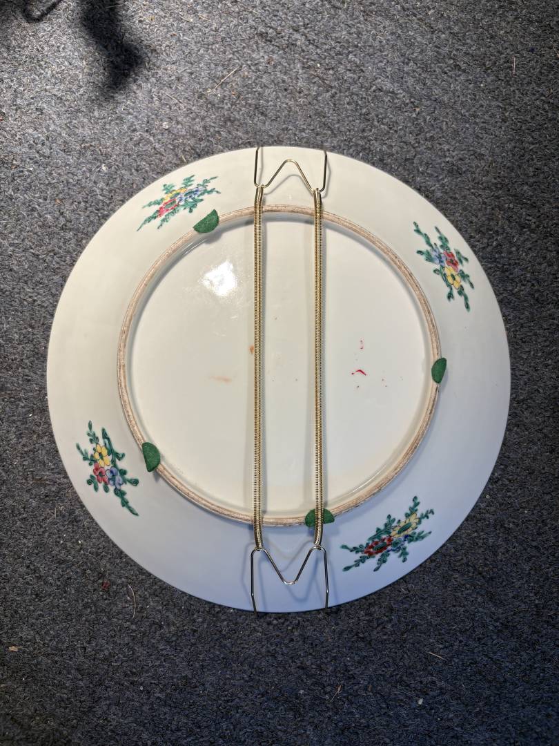 ASSUMING THIS CHARGER IS NEW OR "VINTAGE", HERE ARE MORE PHOTOS. I a very much of a newbie, but learning from you all and Peter. From a distance, this charger was attractive to me and I bought it for $75 taking a chance. However, photos taken in person shows how sloppy the painting is with flowers outlined in black and filled in with a splash of color. There is a spot of red paint spilled on the bottom. In a shop, it could bring at least $75 if marked as vintage(lesson: do not falsify) ! Any other comments so I can learn more from those of you much more knowledgeable would be appreciated.. it will go to Salvation Army