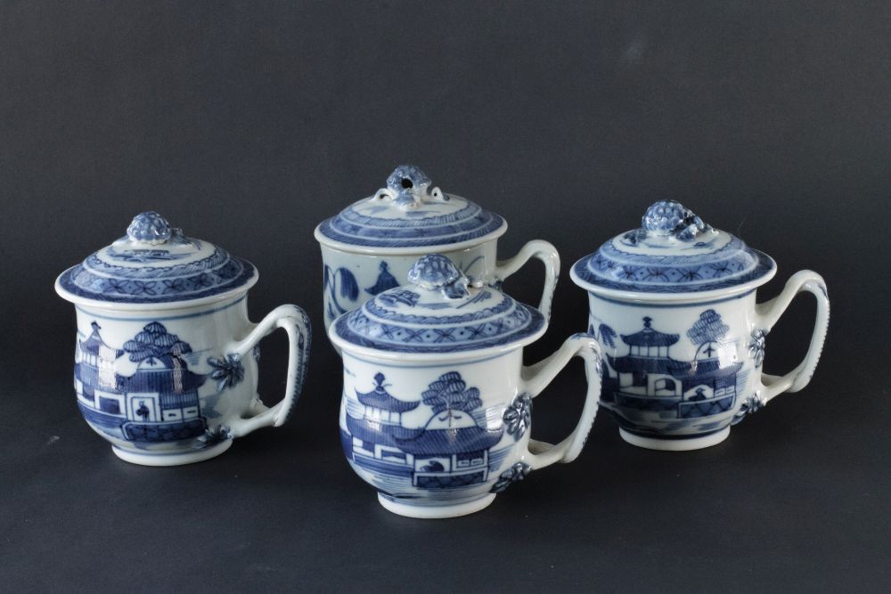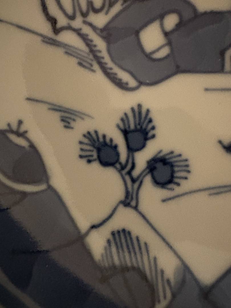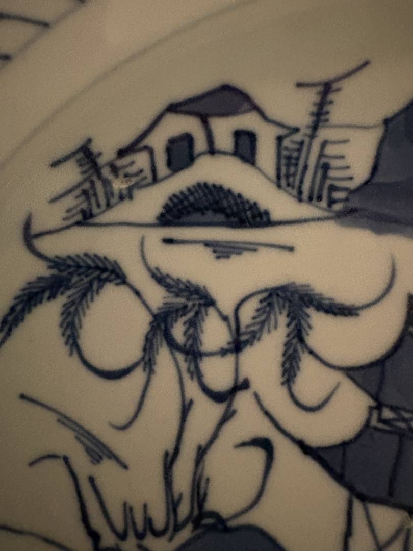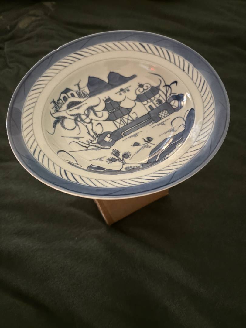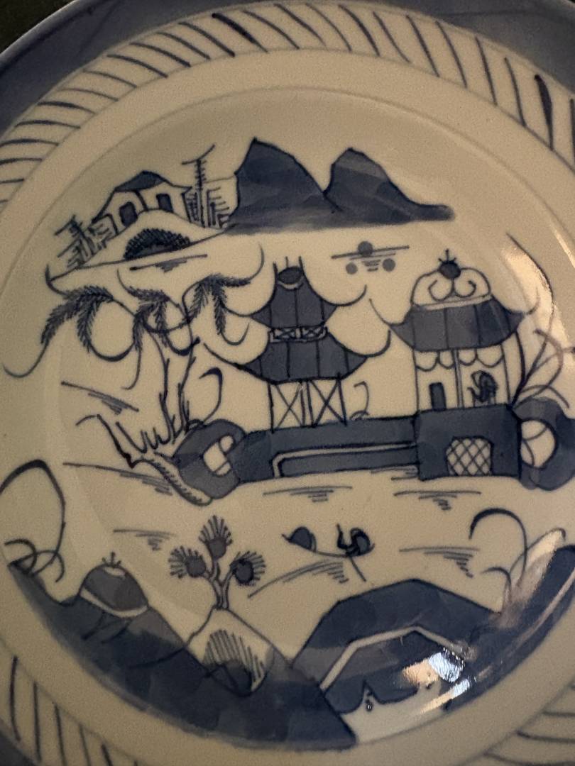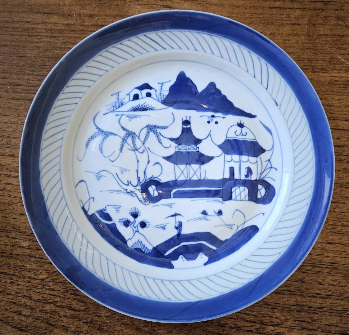 It also happens to represent my favorite kind of B&W Canton porcelain. I love the lively striated border better than the "cloud and rain" from earlier in the 19th century and the stylization of the trees, buildings, etc. is nice as well as the thin and fin and thin quality of the porcelain. I have a little collection of them that I take out for Saturday night dinners. One plate has an umbrella man on the bridge; someone was looking at the old Nanking pattern. Congratulations!