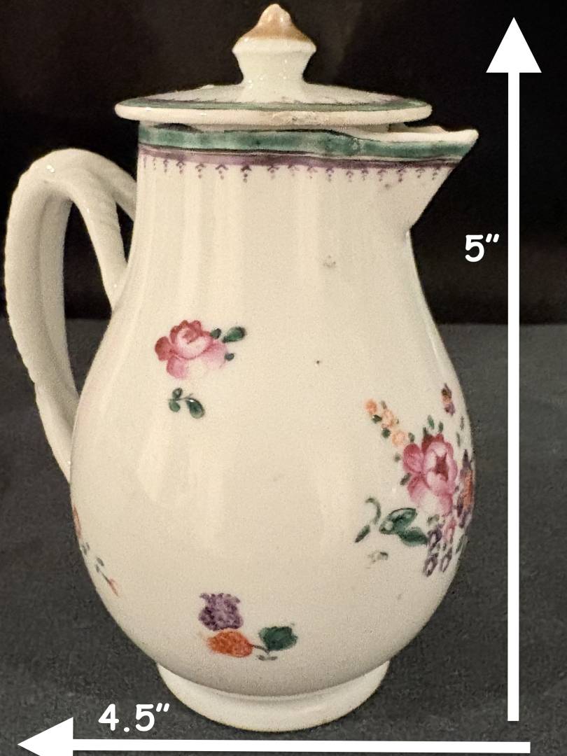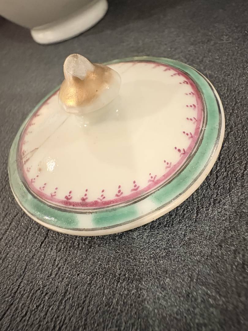 I bought this cute Creamer  for a "tiny" amount of money because I liked looking at it.   I like the shape, simplicity etc.   Lid is probably a replacement - What is the Country, Age, and name ? ?  Thanks