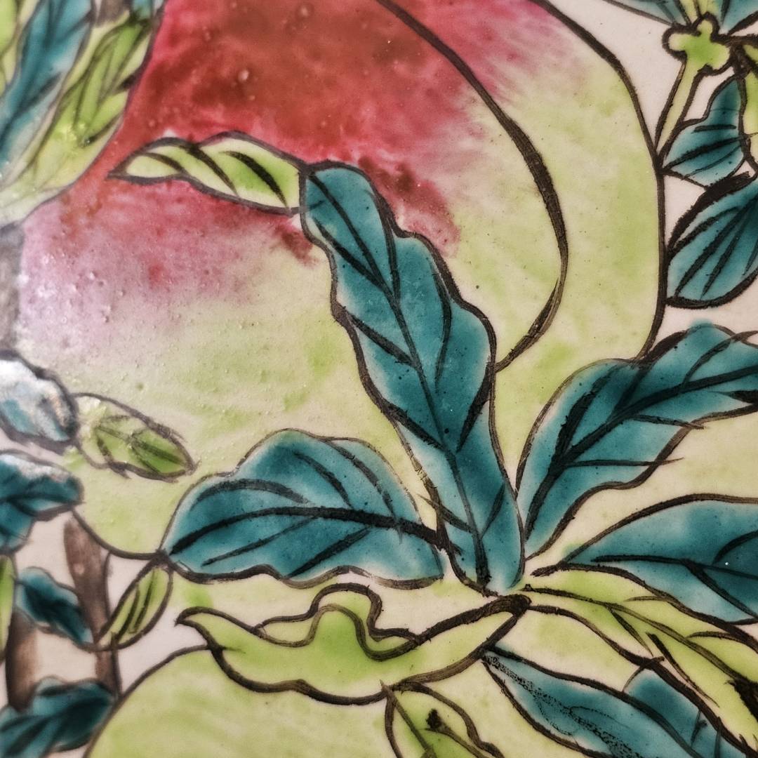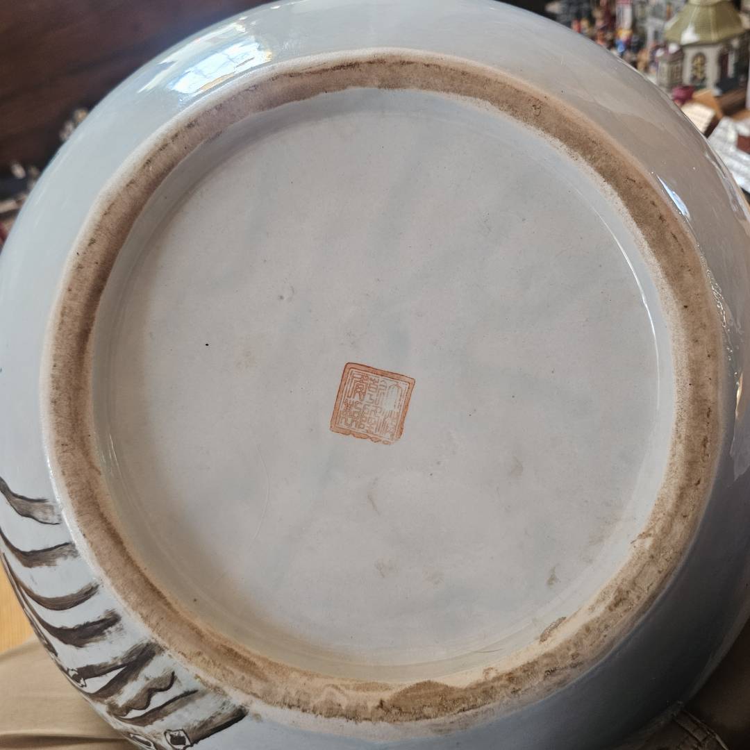 Its 20.5 inches x 17 inches. It has good handwork, the colors seem alright. There is an iron-red qianlong seal mark on the bottom. It has some glaze skips, pitting and iron flecks around the body. Would this all fall under earlier 20th or later 20th century if anyone has a guess? If I'm right it would be later mid-century based on the strength of the lines, maybe the weaker appearance of the wood tones and details might support this but theres usually a clarity difference between how the peach colors will look in more modern era applications which these and some other points make me consider its earlier too.