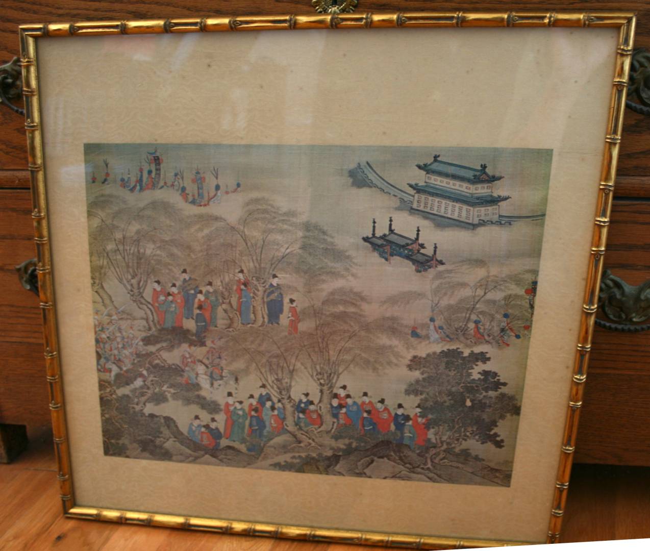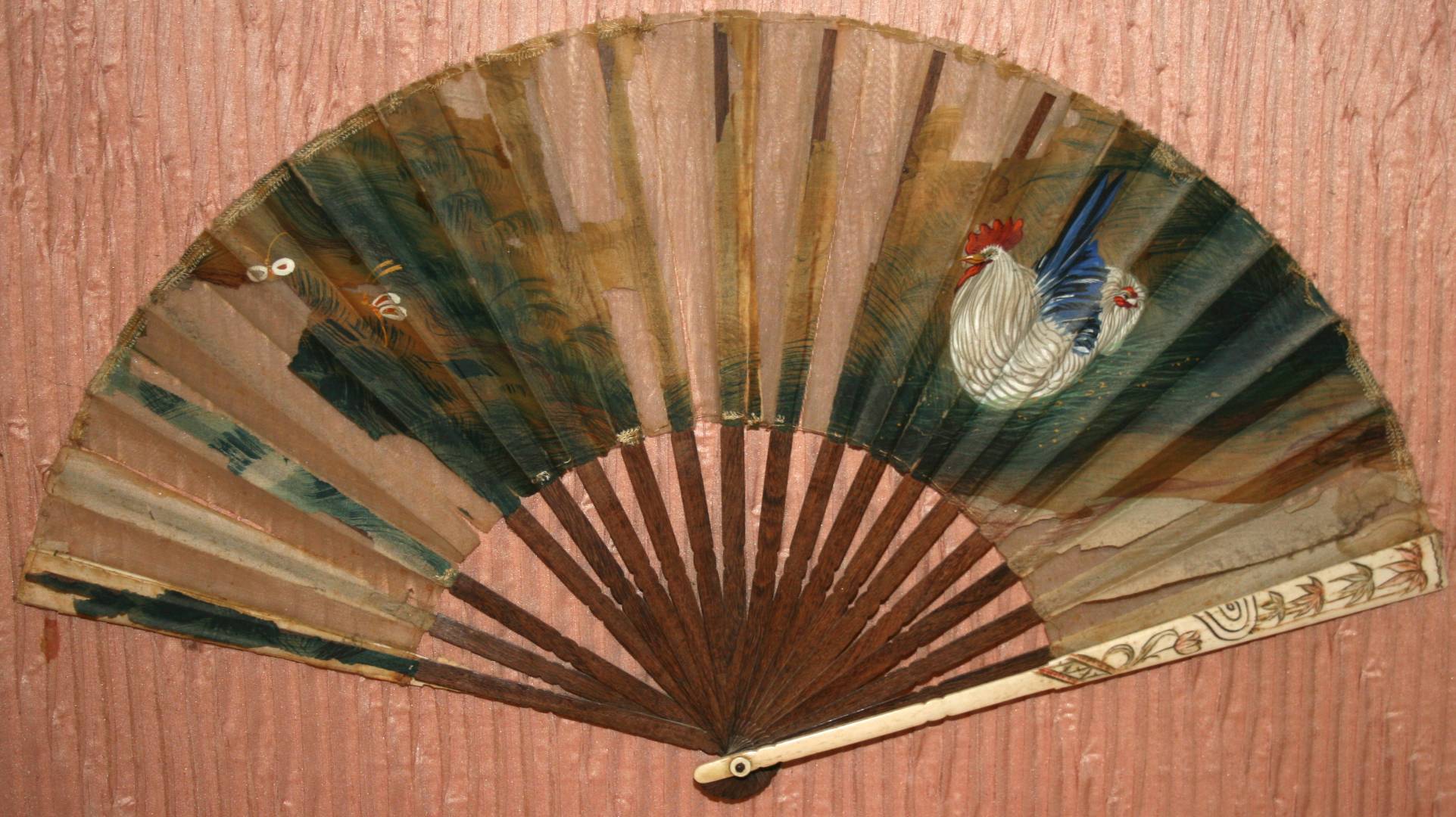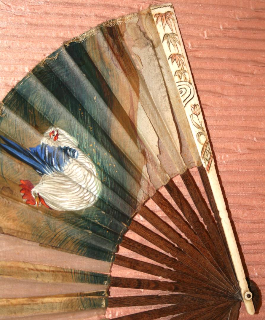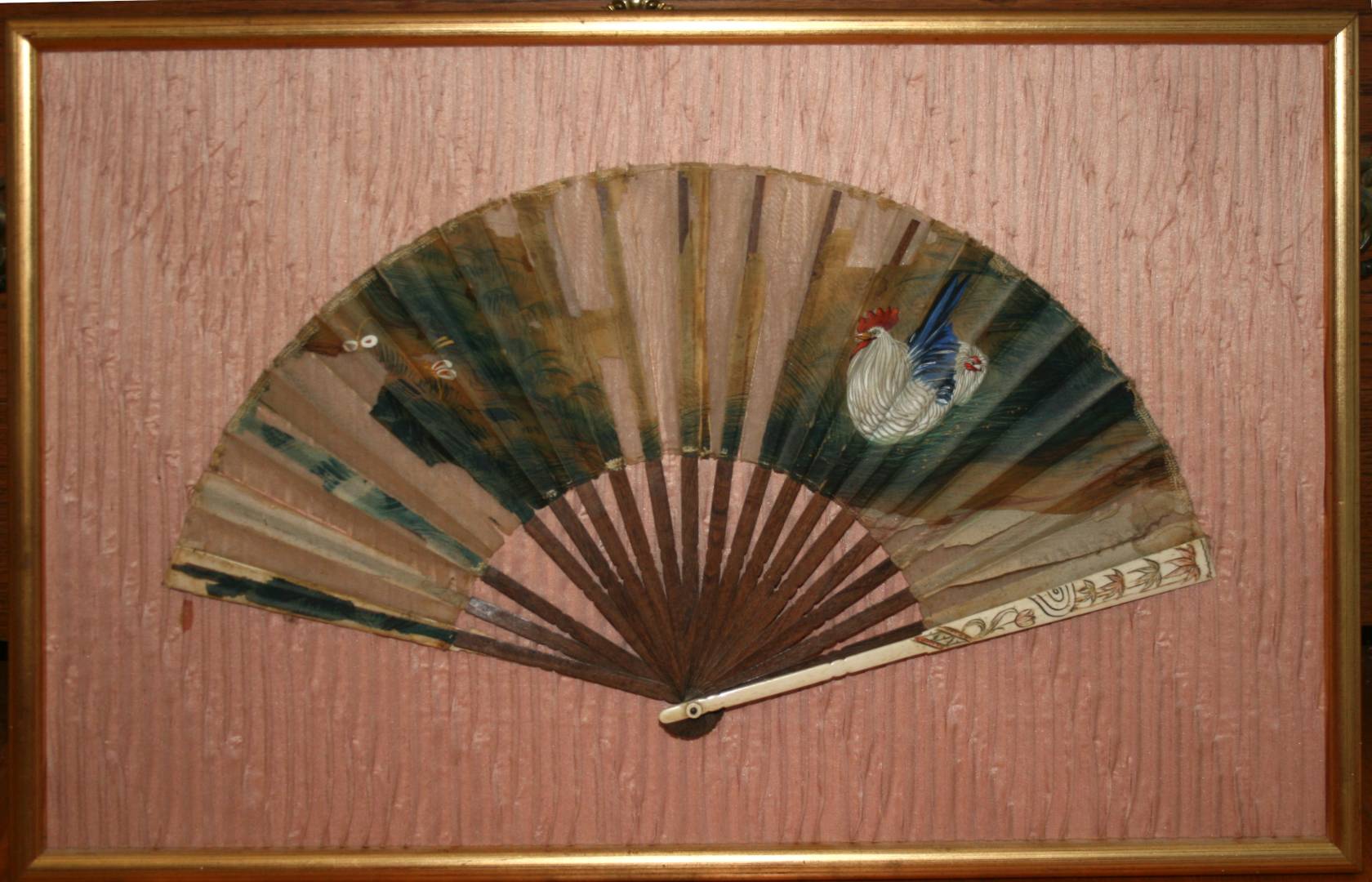 Also, a framed (I liked the background rucked silk, the fan is damaged, should have been under glass), but I liked the chickens, also from a Houston estate sale.