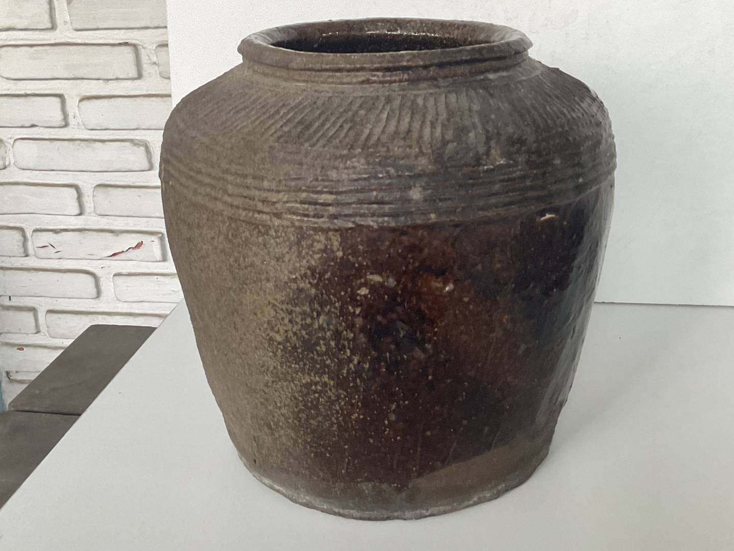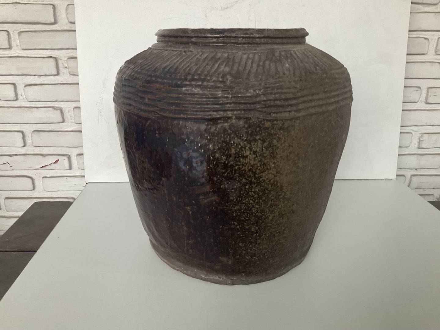 This is a tough one to date.10.5" tall. Japanese? The glaze almost looks Sawankhalok, but just the glaze. Am thinking 19th, but could be earlier? The form is very good for this type. I think it comes across best when plopped in amongst a regular scene.(last pic).