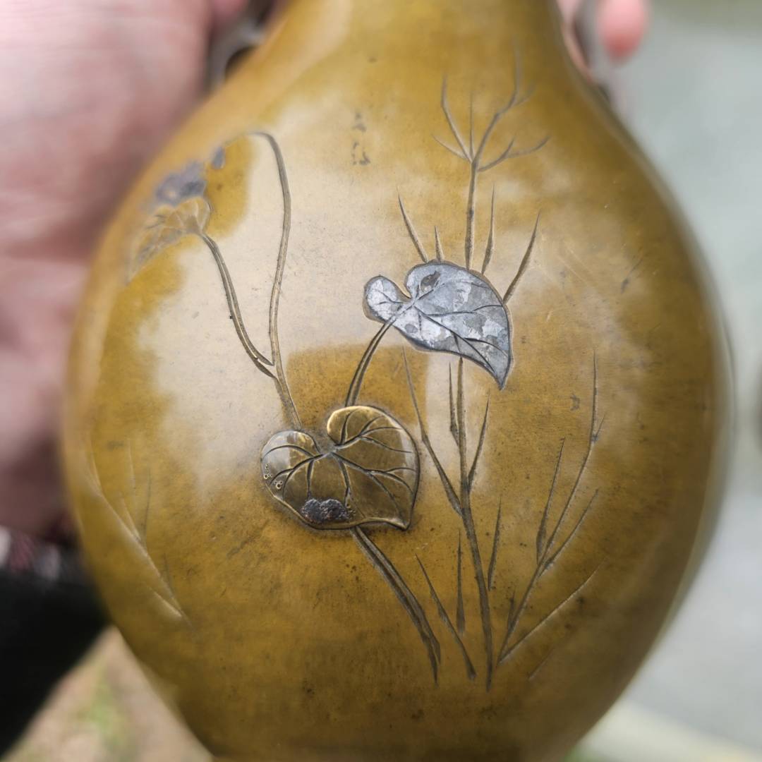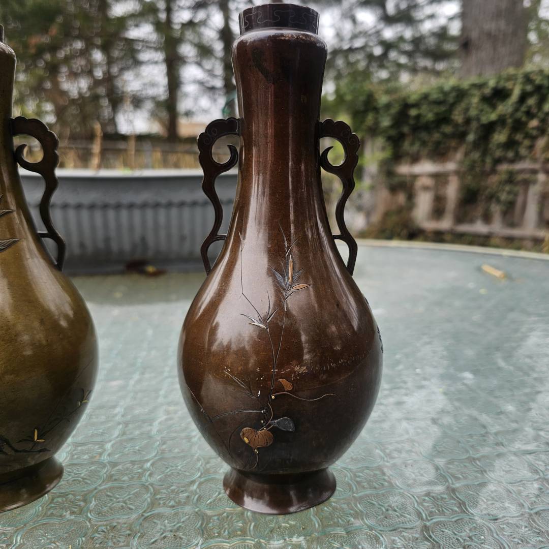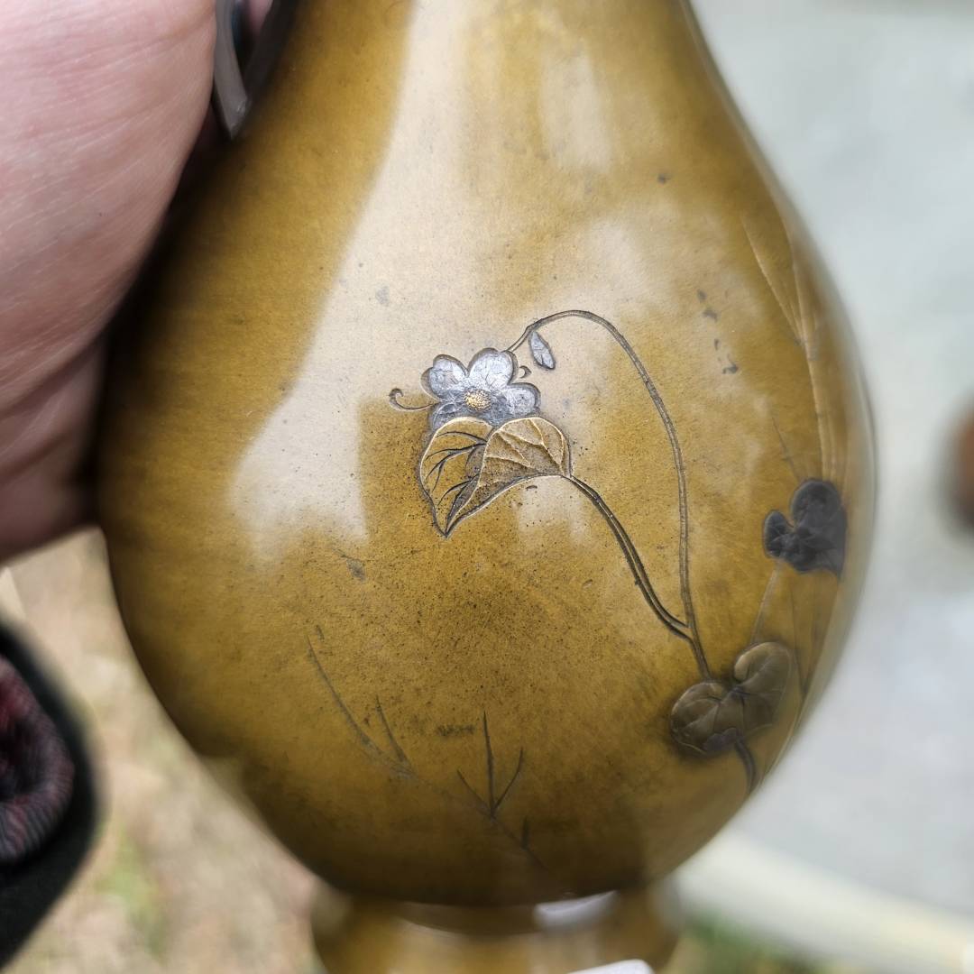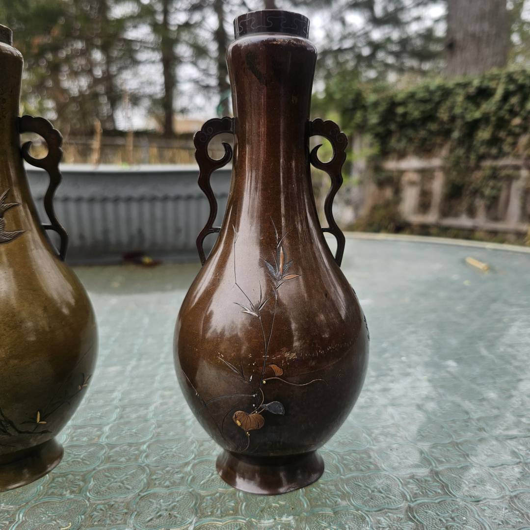 I have the opportunity to purchase this pair of mixed metal vases in the style of Suzuki's works. Im hesitant since its a small investment if they are legitimate, but the details and photos are pretty vague and unclear. The signature is missing the double-mountain signature above them, and I've only been able to see this signature on a pair listed via Waki auctions on another pair. Its currently a gamble, but from what is shown, is it likely made by him?