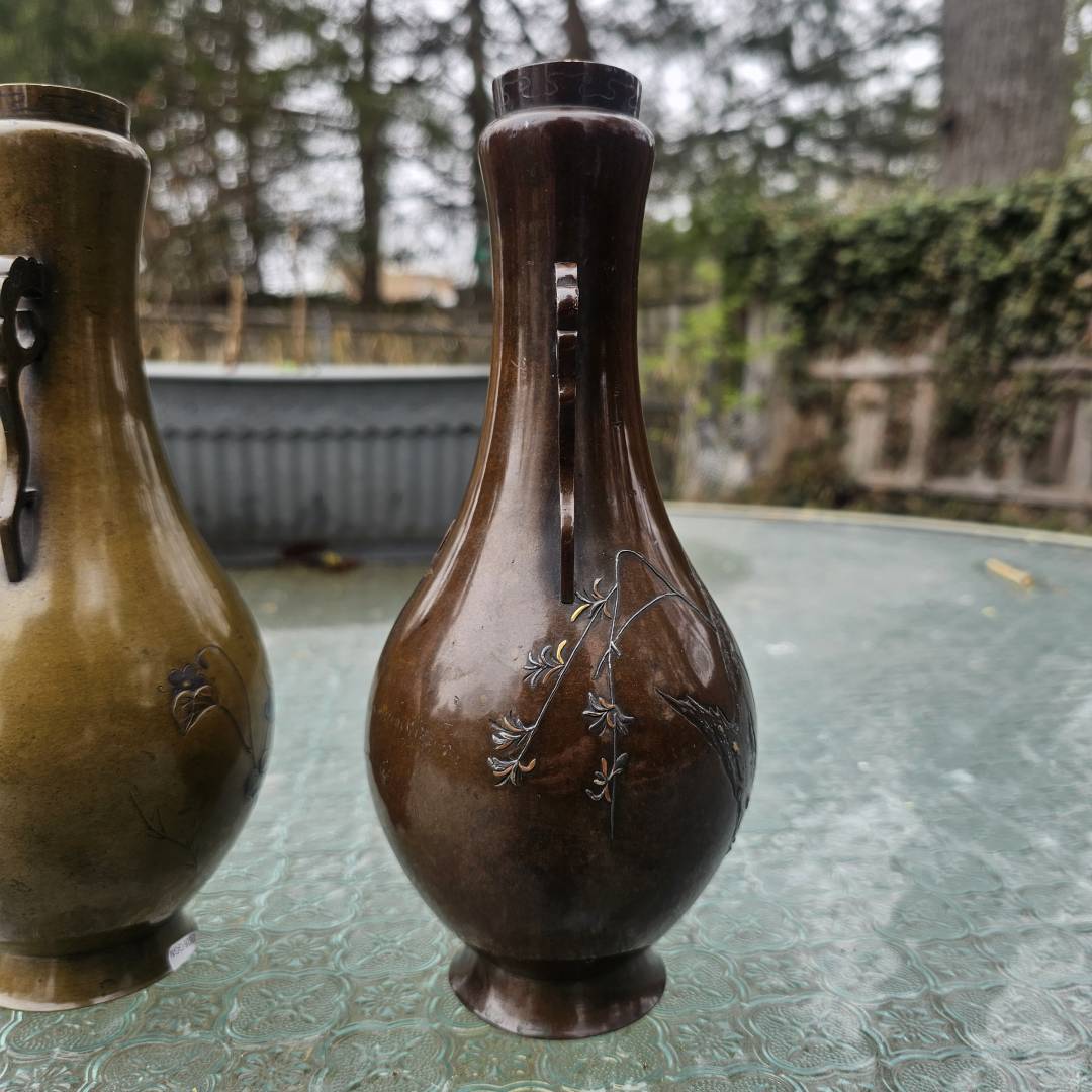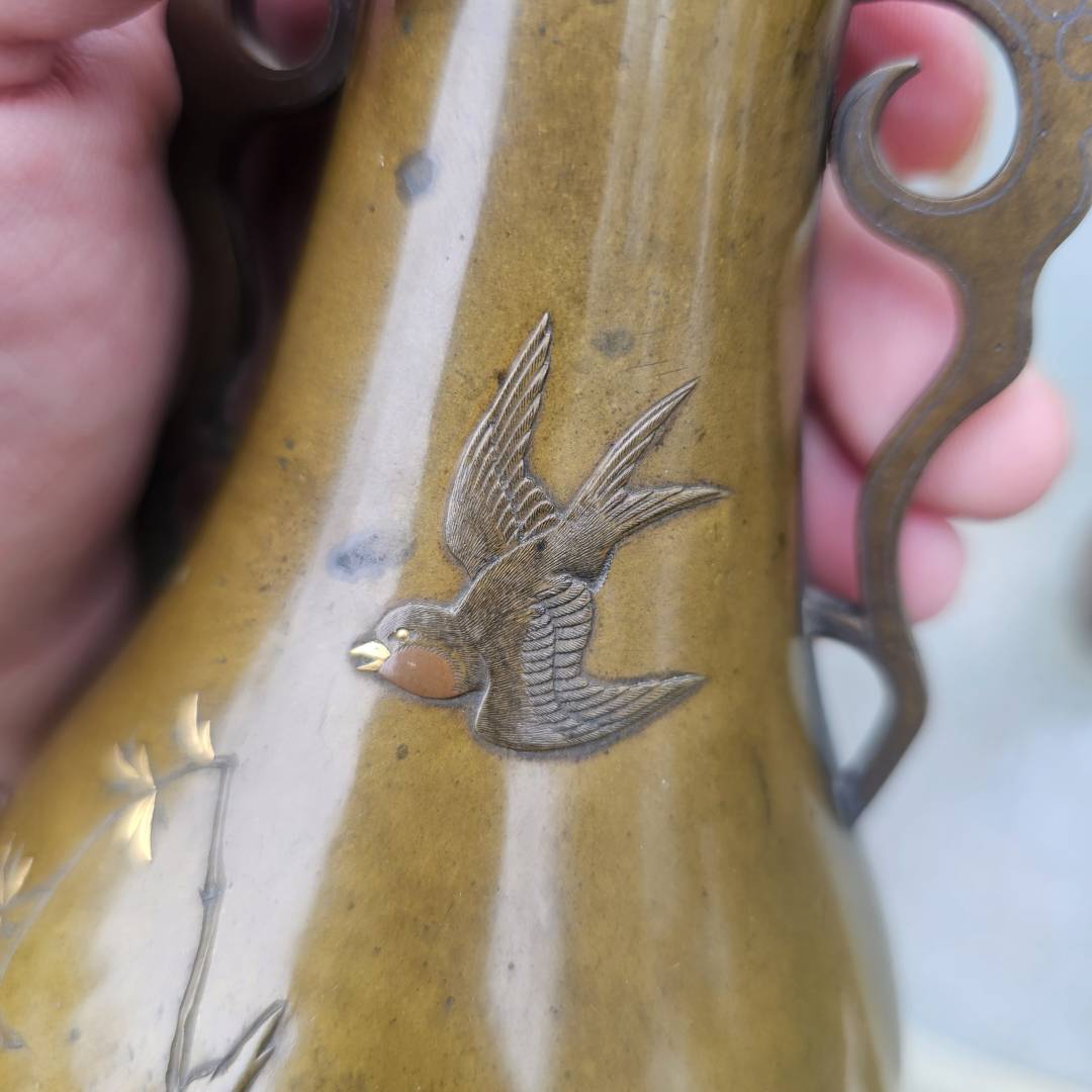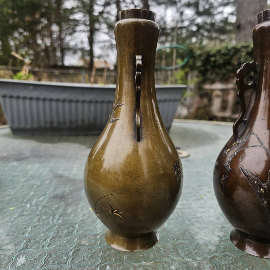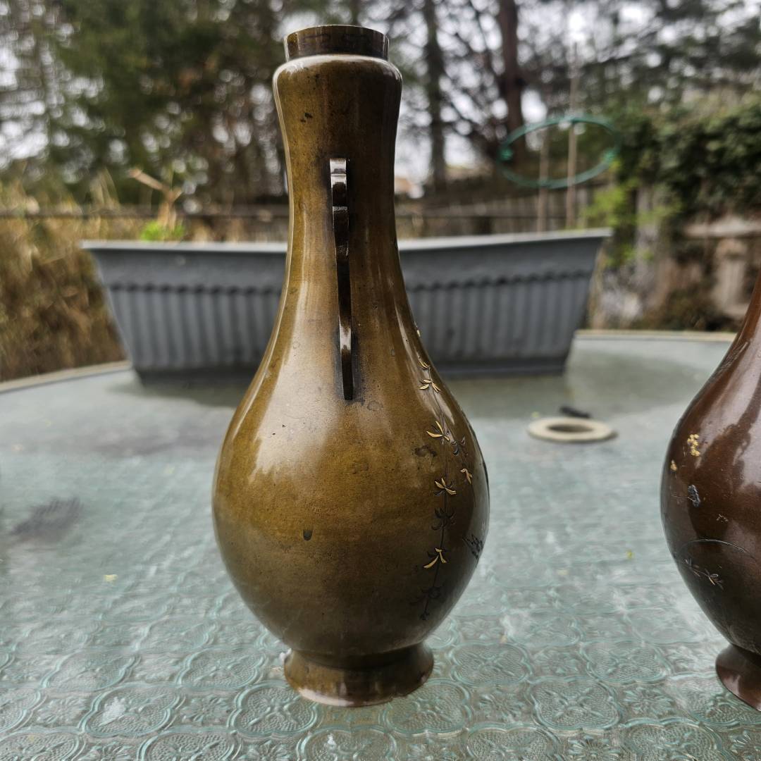 I have the opportunity to purchase this pair of mixed metal vases in the style of Suzuki's works. Im hesitant since its a small investment if they are legitimate, but the details and photos are pretty vague and unclear. The signature is missing the double-mountain signature above them, and I've only been able to see this signature on a pair listed via Waki auctions on another pair. Its currently a gamble, but from what is shown, is it likely made by him?