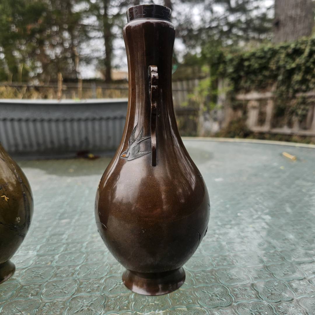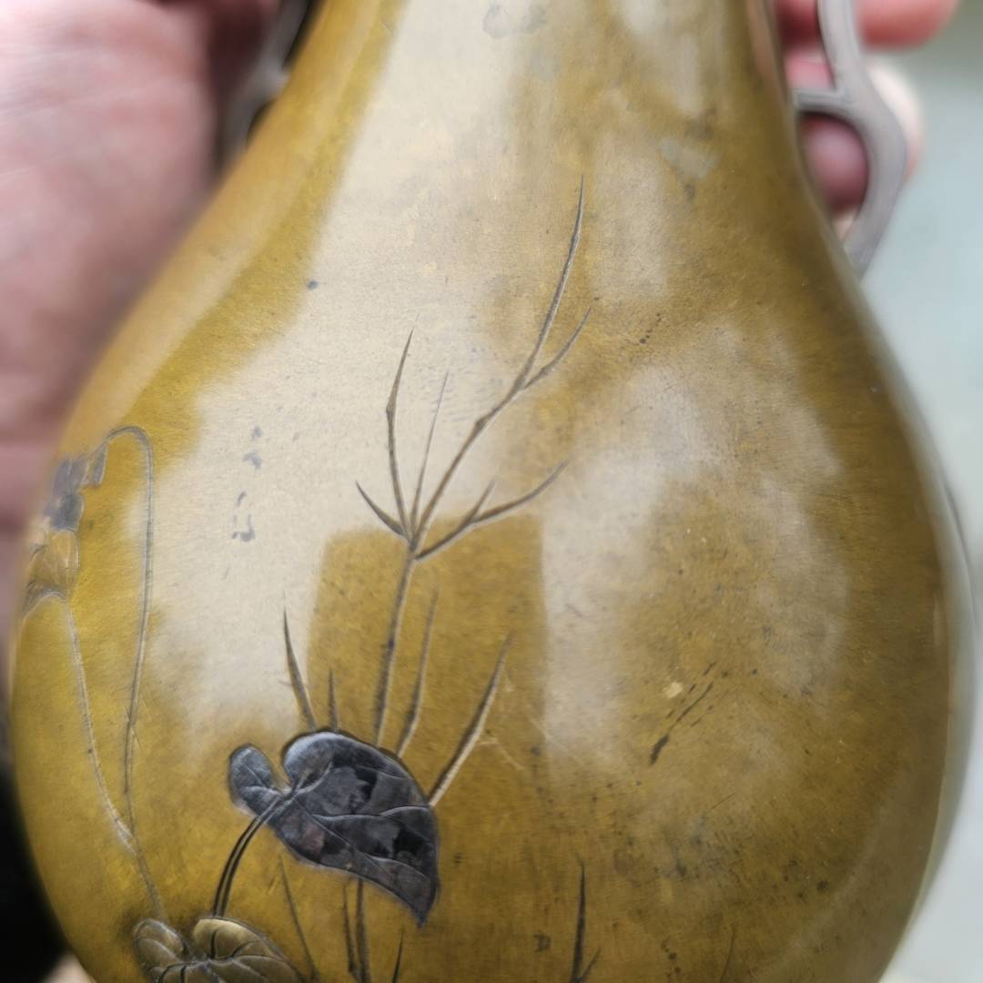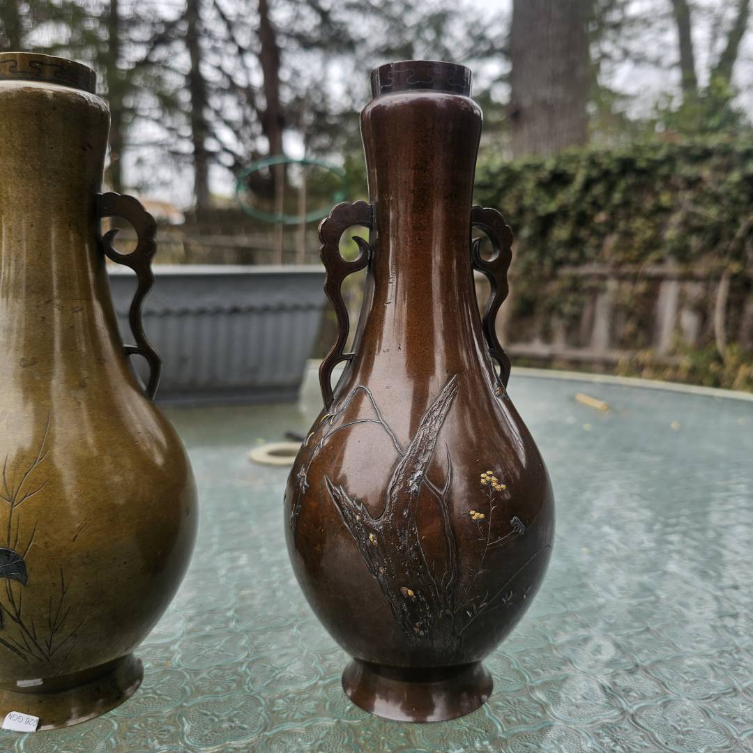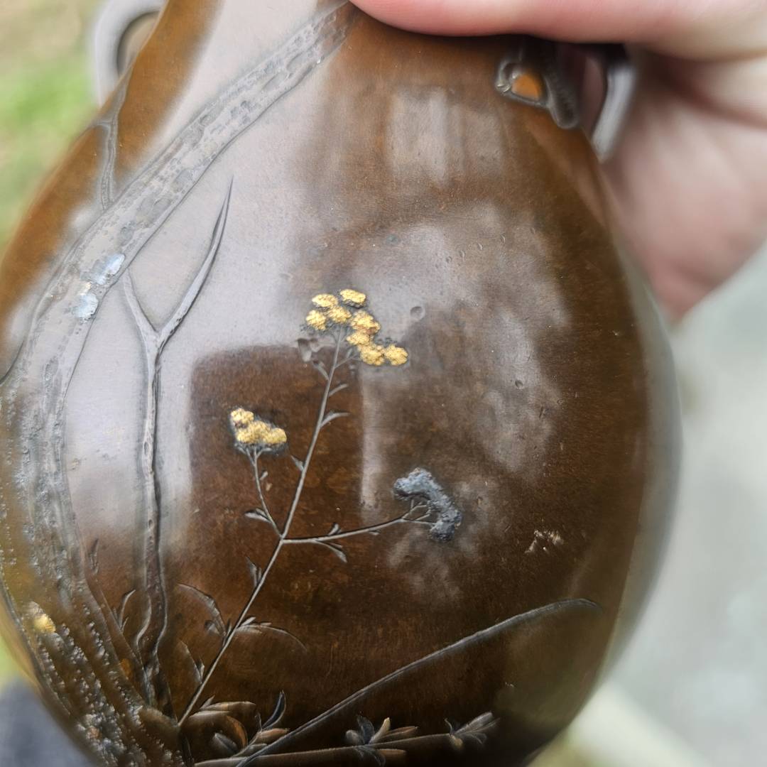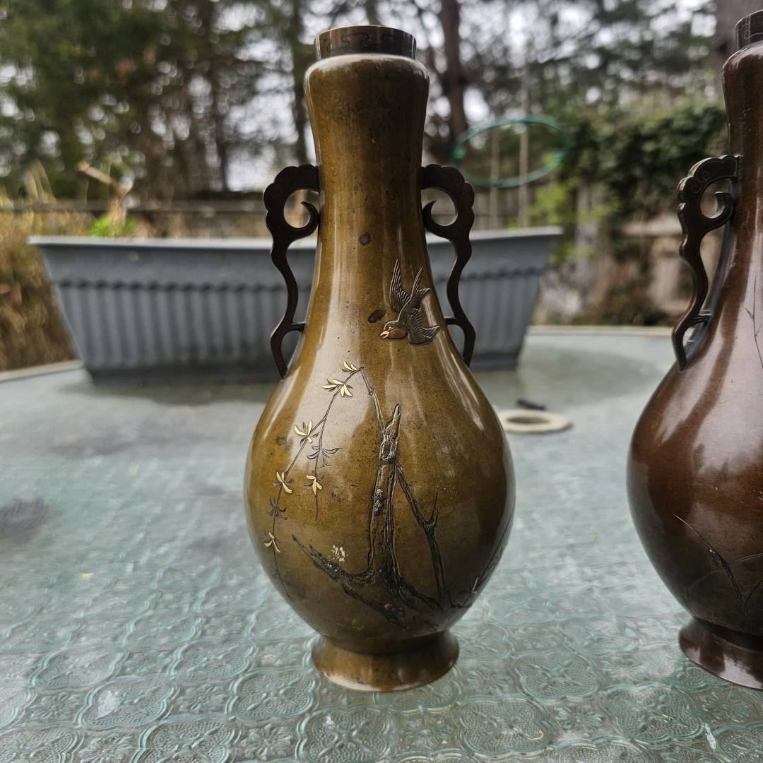 I have the opportunity to purchase this pair of mixed metal vases in the style of Suzuki's works. Im hesitant since its a small investment if they are legitimate, but the details and photos are pretty vague and unclear. The signature is missing the double-mountain signature above them, and I've only been able to see this signature on a pair listed via Waki auctions on another pair. Its currently a gamble, but from what is shown, is it likely made by him?