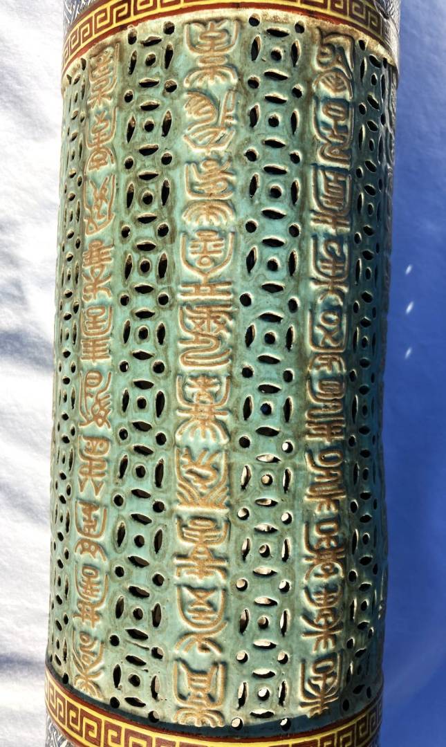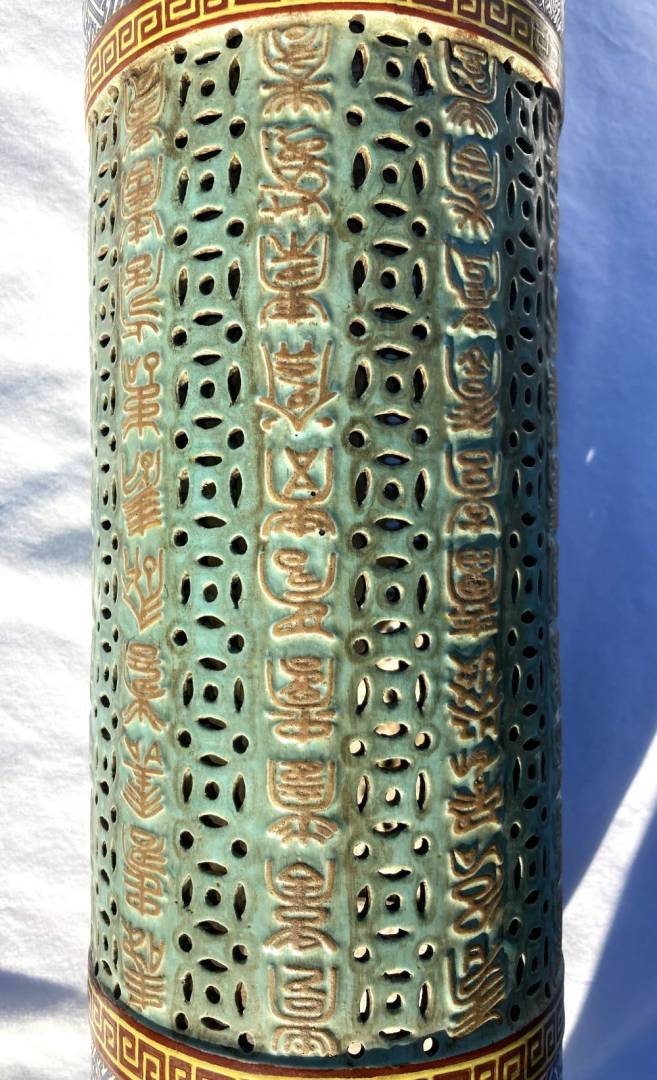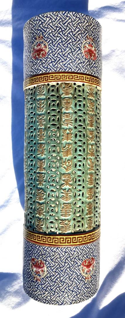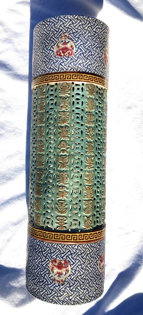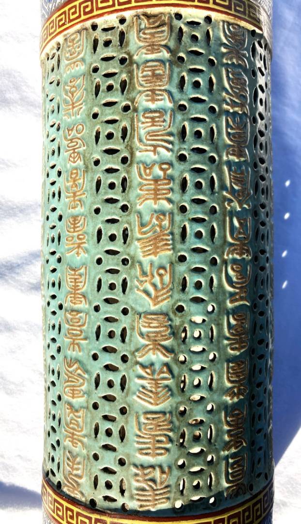 Really interesting I believe 18th century large Chinese Porcelain Famille Rose cylinder Candle Holder / Incense Burner possibly for a Buddhist Temple. Measures 17 inches high with a 5 inch diameter. Would have had a fancy wood pedestal where a Candle or Incense would sit in the middle in some kind of porcelain cup and send light out of the holes in the middle area or incense smoke. Looks to be early construction with the 4.5 inch top and bottom cylinders being formed on a potter's wheel than attached to the middle area that is a molded piece by hand. The main part I need help in is the Translation of 10 rows of Chinese Calligraphy down the middle of the piece. It is all in raised embossed gold enameled characters. I do not know where its supposed to start or end but the Translation could help to make sense of that. Also any other knowledgeable information would be highly appreciated! Thank You for your Help! Gary K