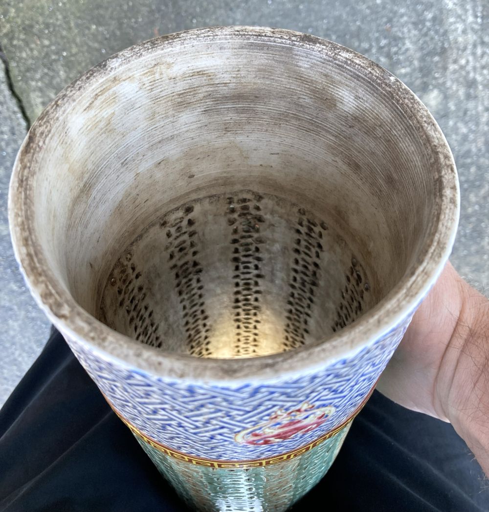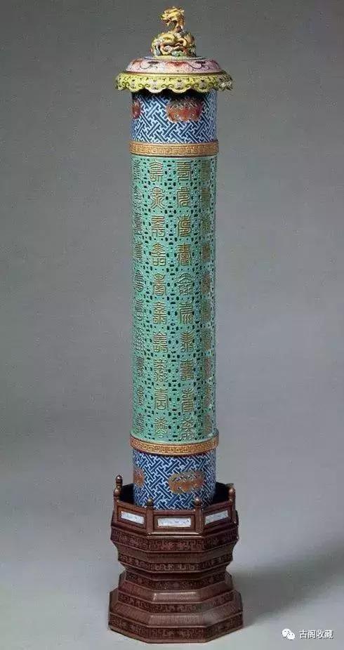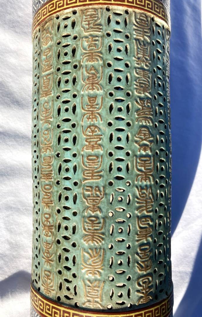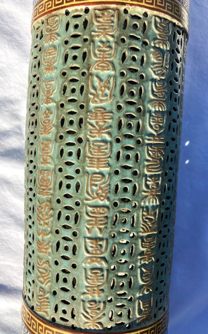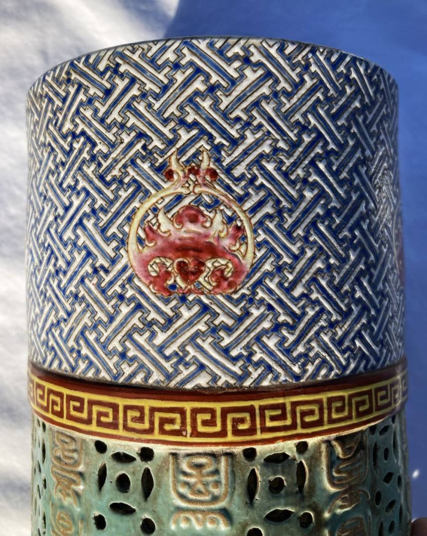Really interesting I believe 18th century large Chinese Porcelain Famille Rose cylinder Candle Holder / Incense Burner possibly for a Buddhist Temple. Measures 17 inches high with a 5 inch diameter. Would have had a fancy wood pedestal where a Candle or Incense would sit in the middle in some kind of porcelain cup and send light out of the holes in the middle area or incense smoke. Looks to be early construction with the 4.5 inch top and bottom cylinders being formed on a potter's wheel than attached to the middle area that is a molded piece by hand. The main part I need help in is the Translation of 10 rows of Chinese Calligraphy down the middle of the piece. It is all in raised embossed gold enameled characters. I do not know where its supposed to start or end but the Translation could help to make sense of that. Also any other knowledgeable information would be highly appreciated! Thank You for your Help! Gary K