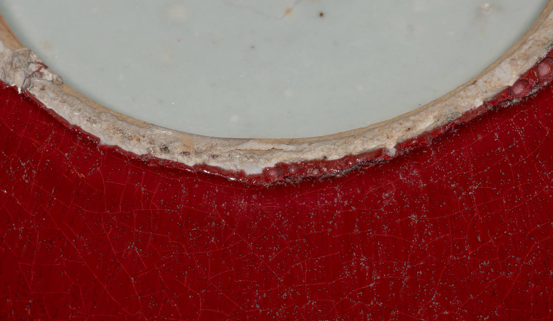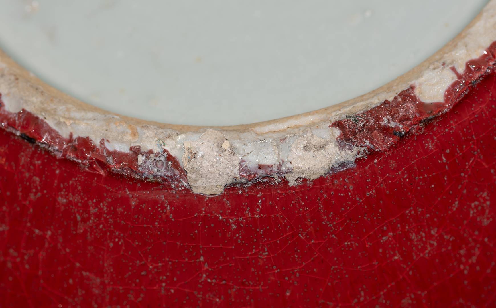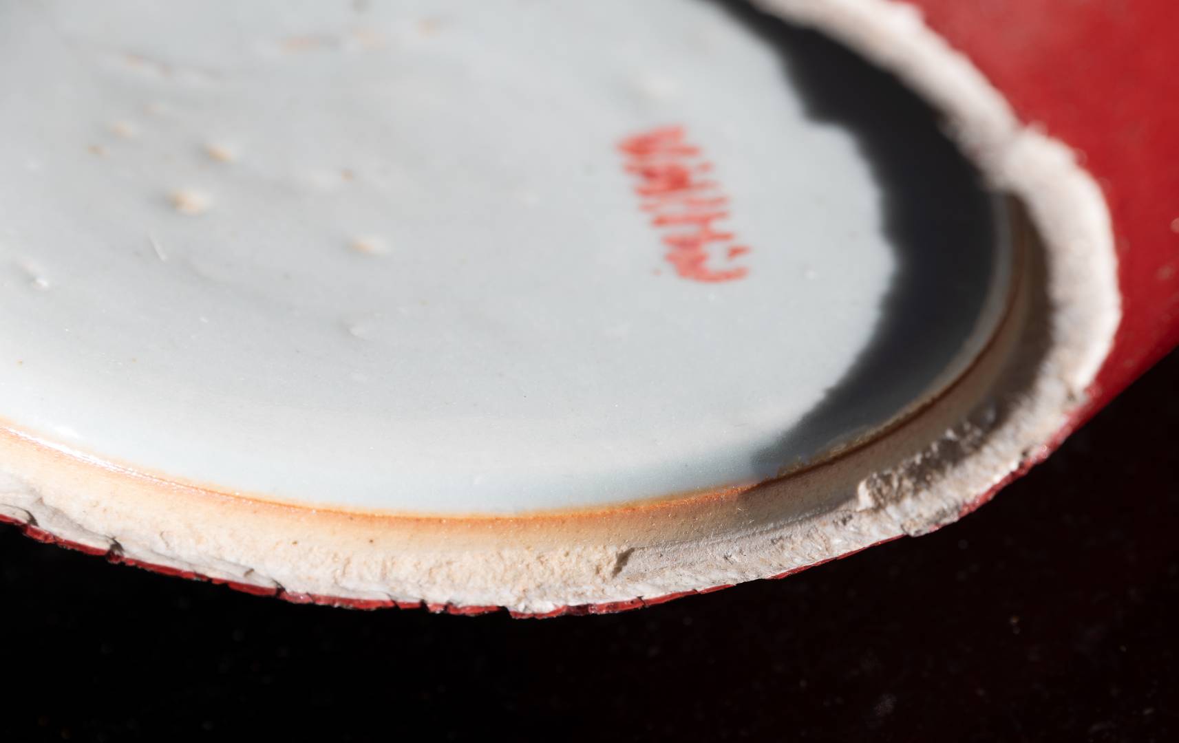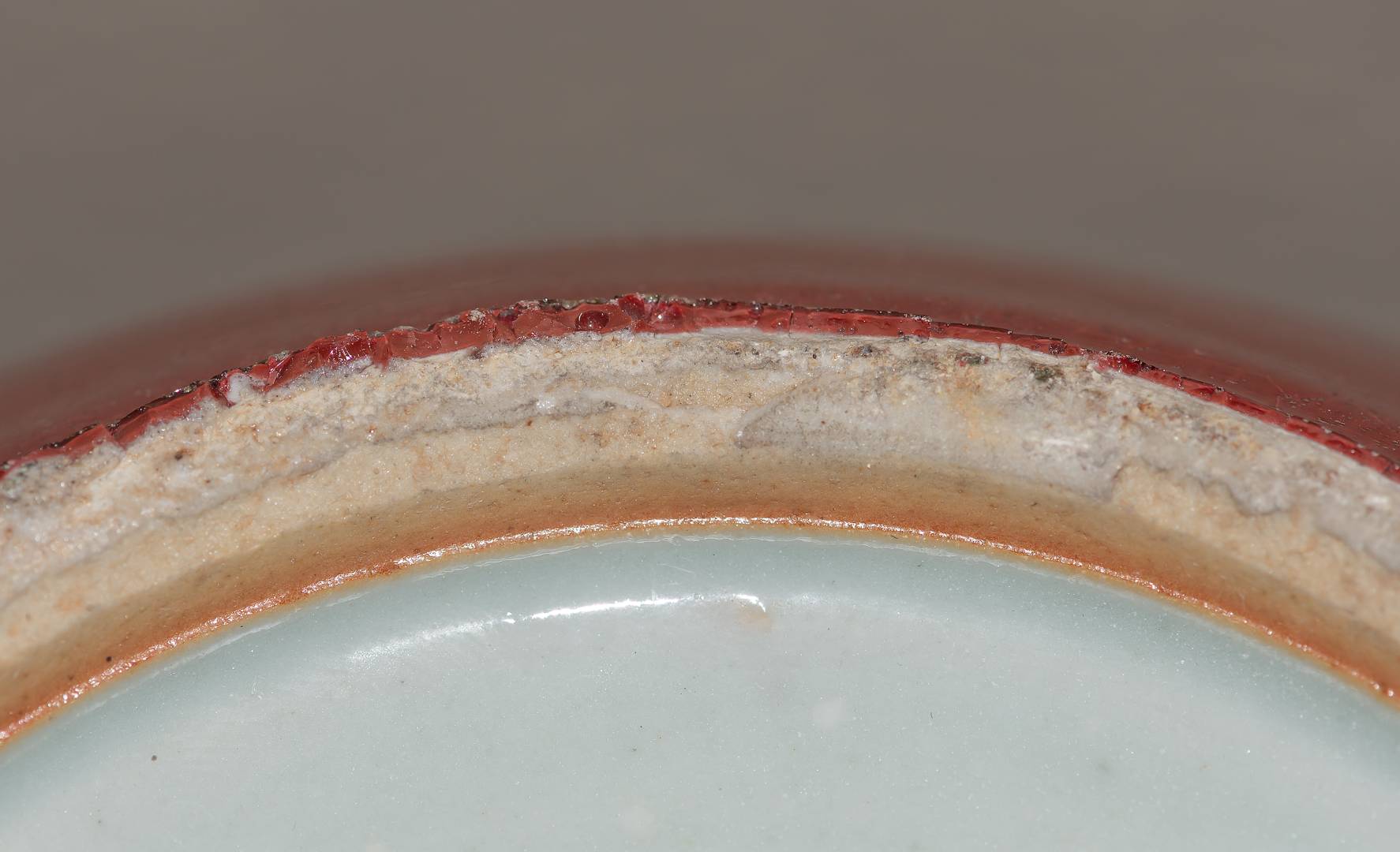 The glaze surface appears somewhat reflective and ‘shiny’, and the orange/yellowish line to the inside footrim edge, where the glaze meets the biscuit, appears very even …