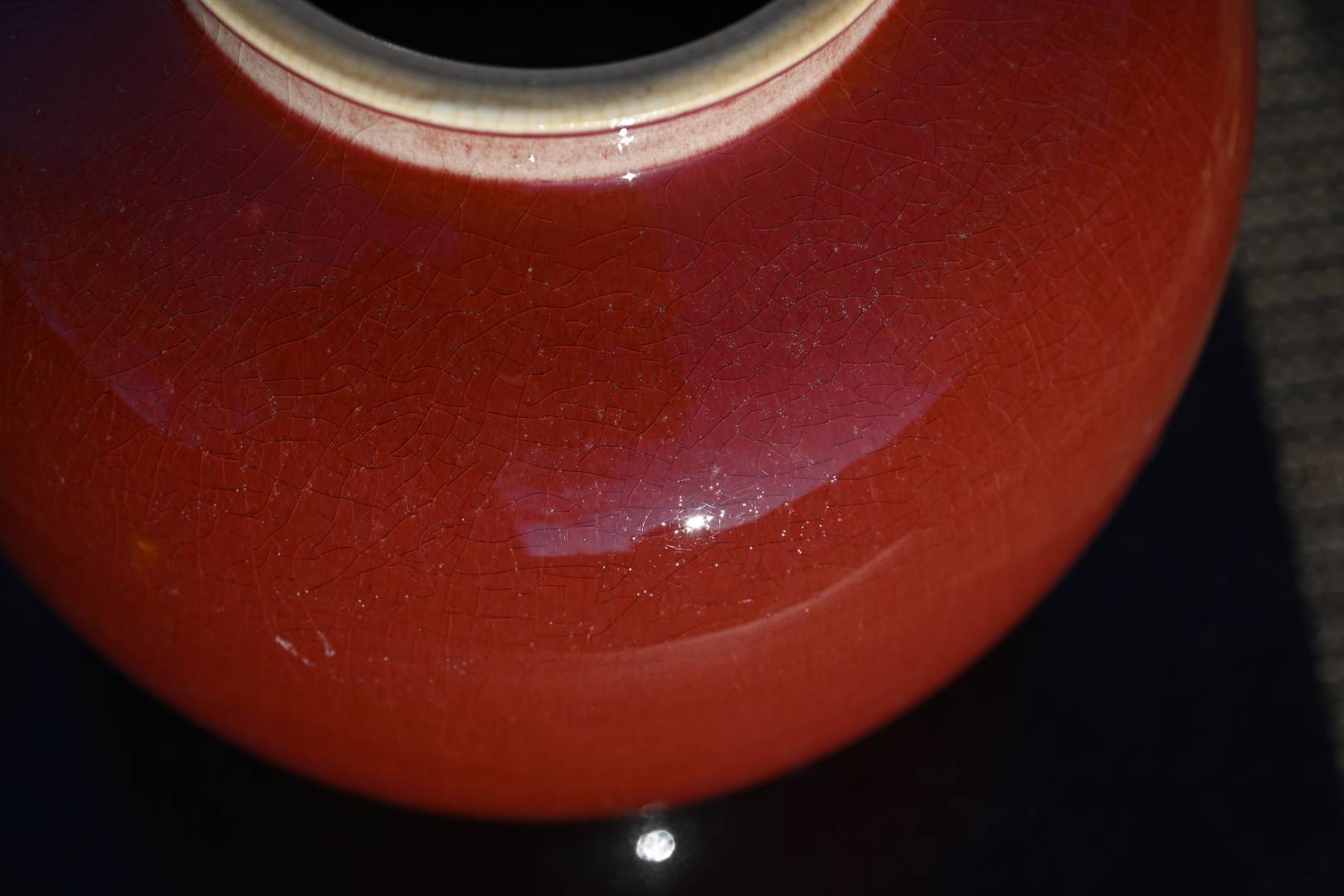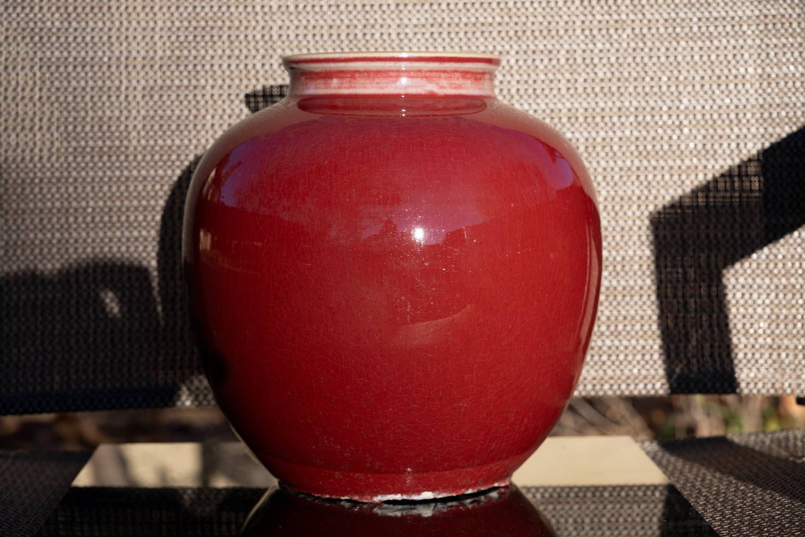 Is this a late Qing ox-blood ginger jar? The base looks good to me; the foot rim was hand-cut but chipped when the glaze stuck during firing; there is a strong iron oxide line on the inner edge of the foot rim; and the "CHINA" stamp looks like a million others late Qing (or early Republic) stamps I have seen. The glaze has lots of bubbles and isn't as perfect as might be expected for a new vase. Also, there are faint rings on the inside and outside, suggesting that it was hand-thrown. These are vertical on the inside of the shoulder, possibly where the potter was blending out a luting line?