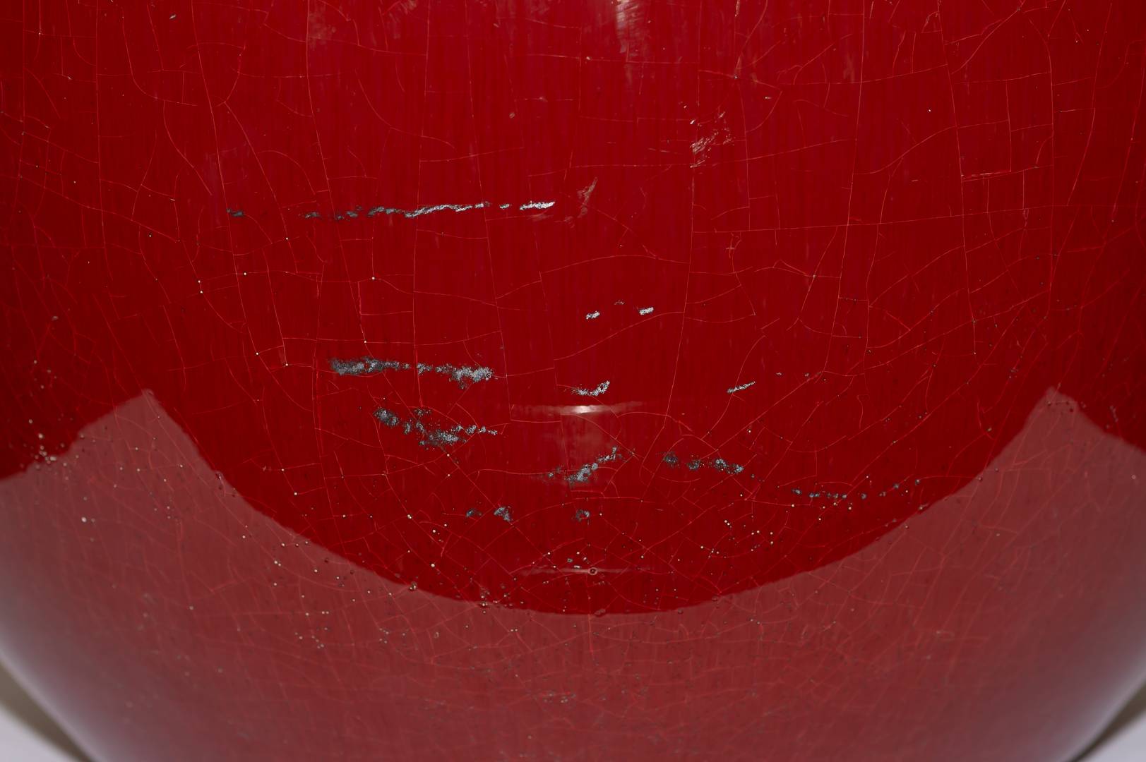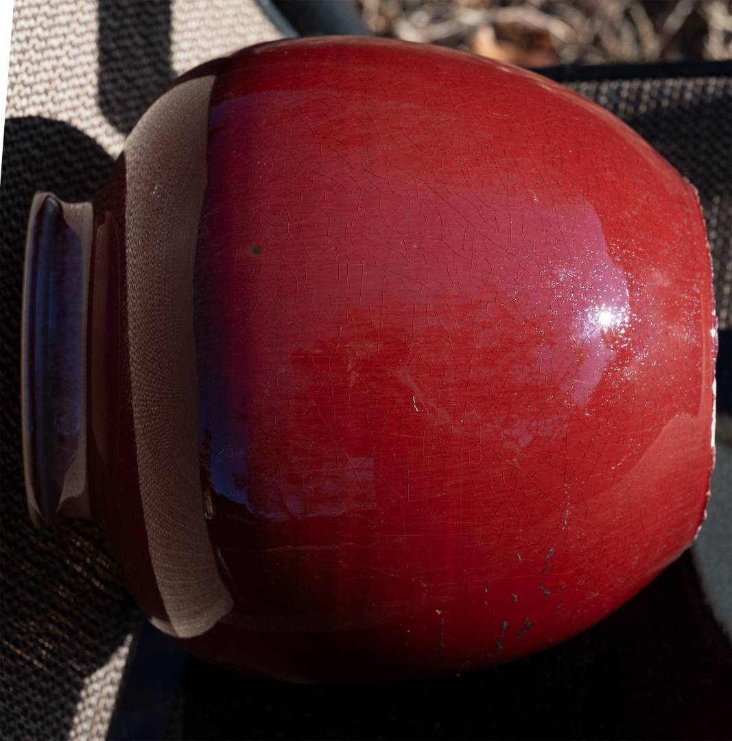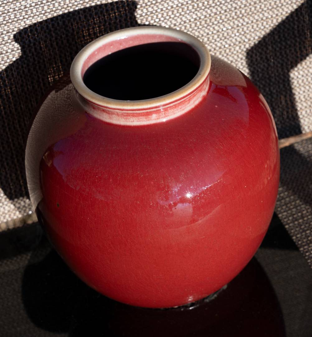 Here are some photos in better sunlight. The glaze on the bottom is not white but is a pale blue. The red glaze is pretty glassy, although it has a lot of bubbles in it, especially near base and the neck. As Birgit says, I haven't seen enough monochromes to know what the glaze is supposed to look like.