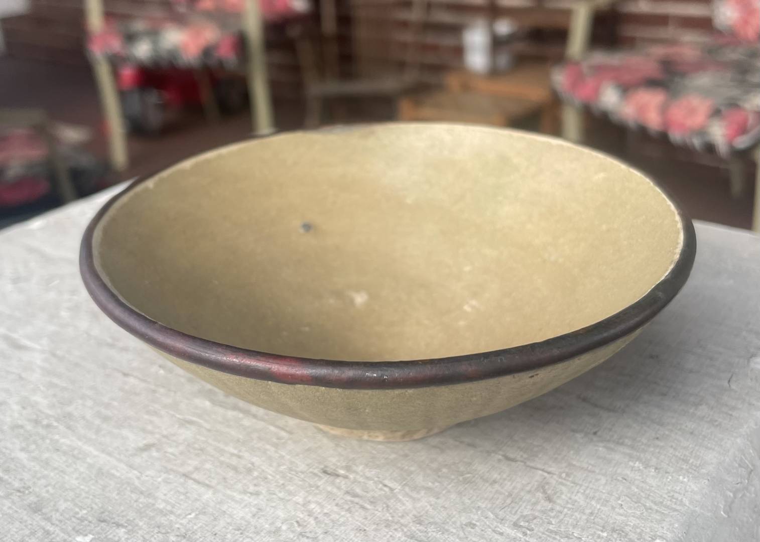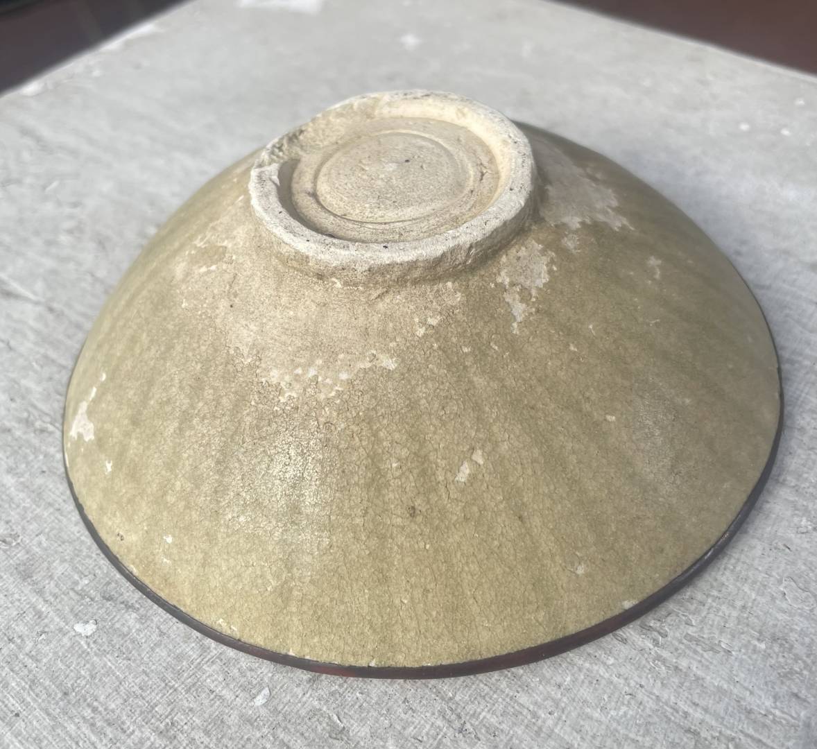 I found this 12cm wide by 4.3cm tall bowl recently and had to buy it to learn. Thought it was a brown treated rim when I bought it, but it’s actually a metal rim. Assuming a reproduction when I first saw it, then turned it over and saw the incised lines and thought I’d get it and ask the experts. I should stop writing because I have no clue. Thanks for your thoughts. It is hand turned. Hopefully that can be seen. There is one closeup.