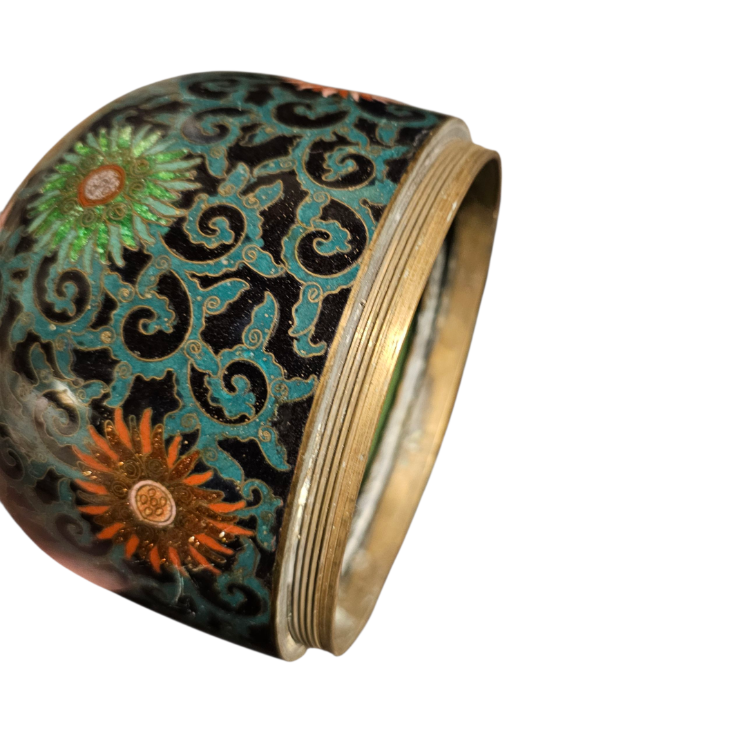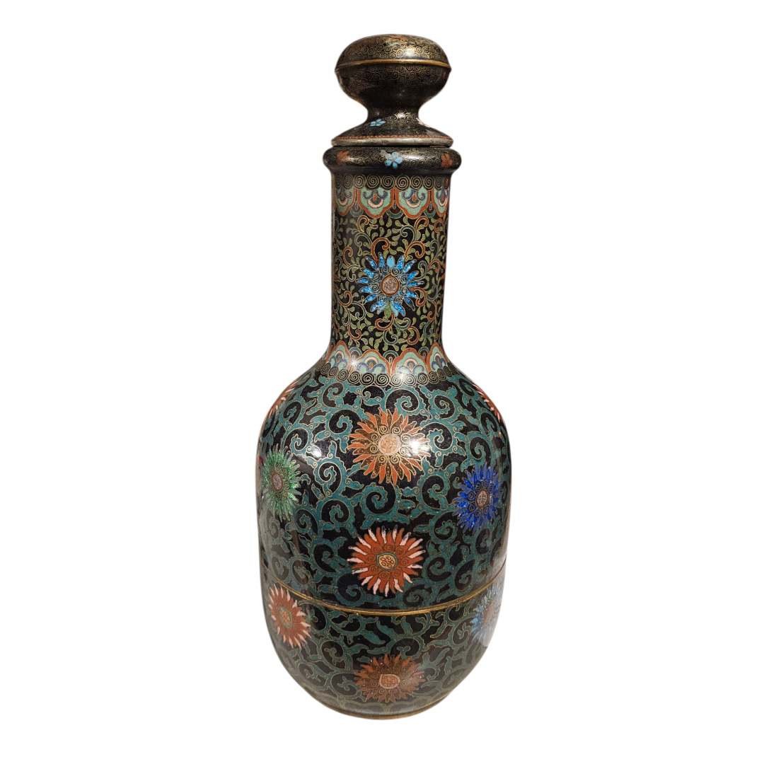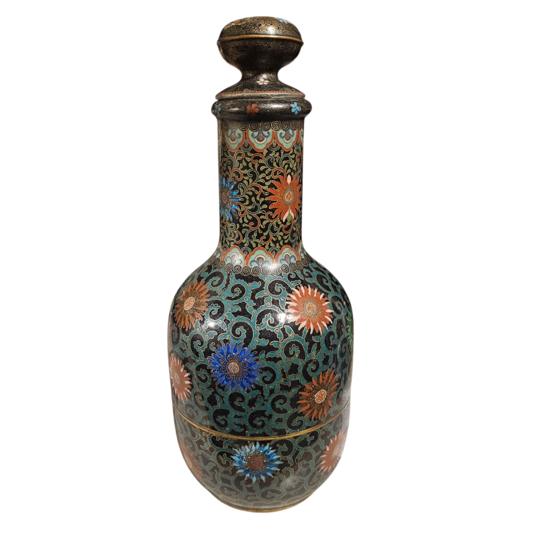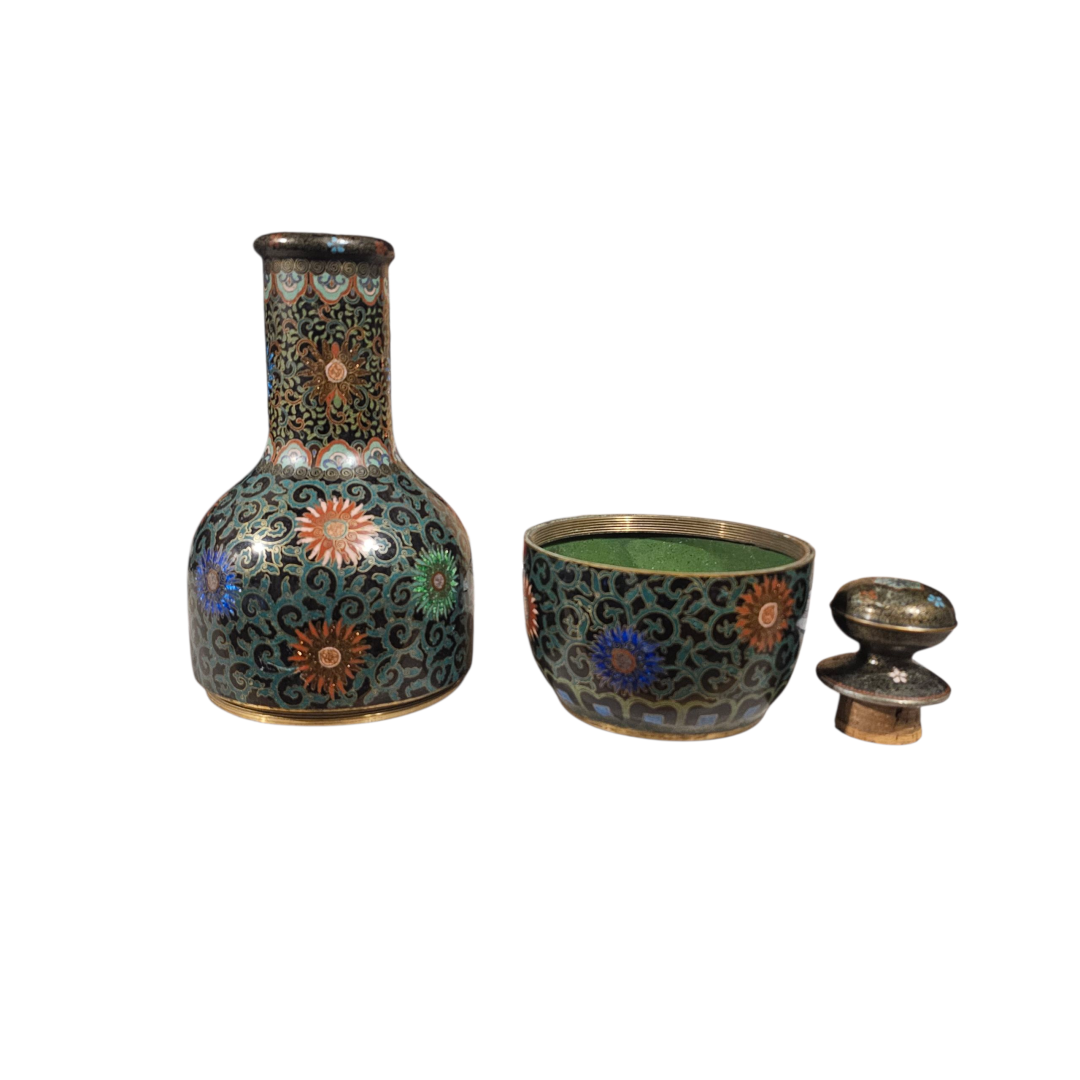 I picked this up today, never seen one before and cant find one yet still. Its a 3 part cloissoné bottle. Stopper, upper half and lower half with a central brass(?) platform.