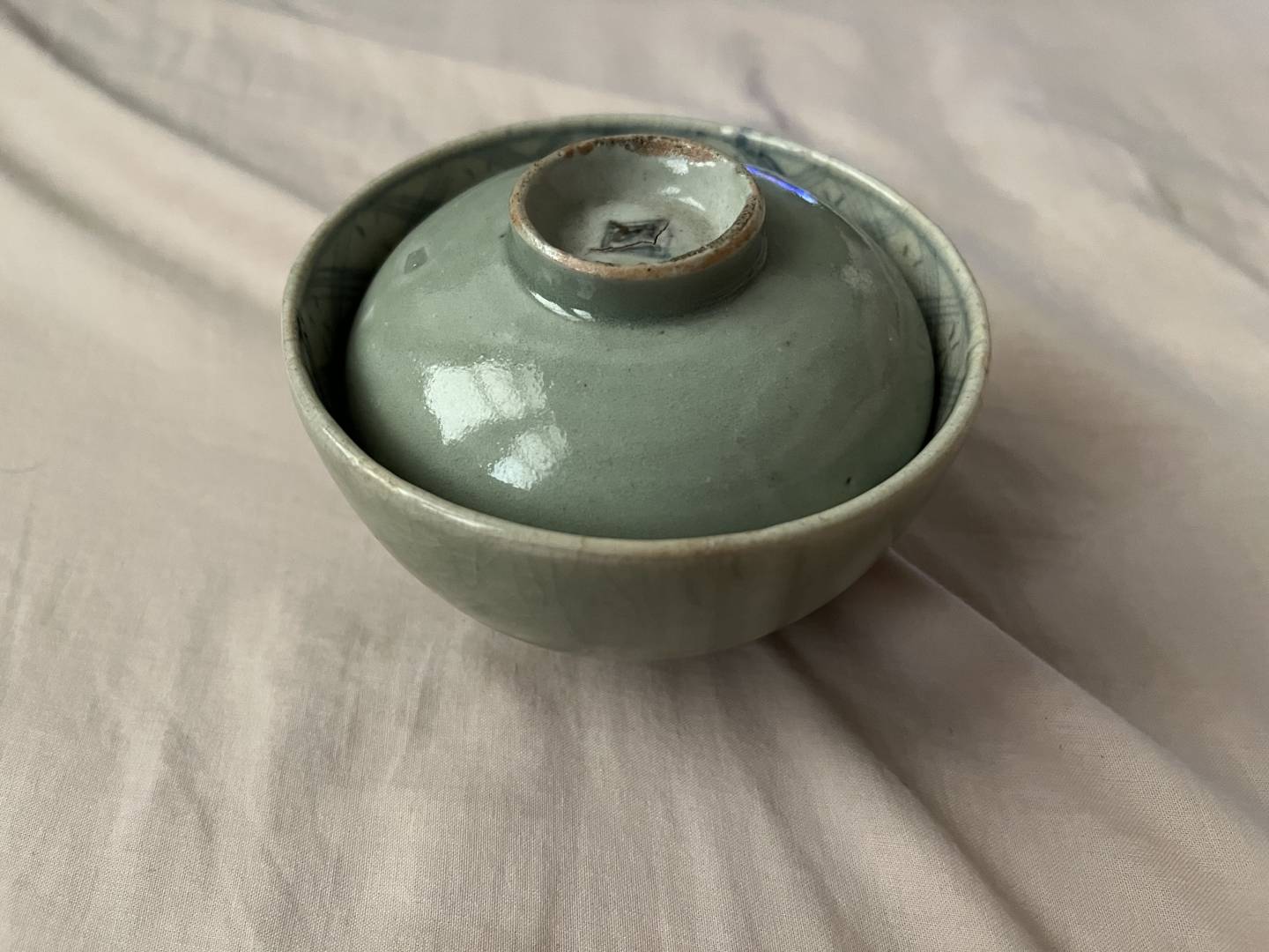 3. Celadon color covered bowl with blue and white interior (paid about 60 USD), seller said this was japanese (imari) and from earlier in the edo period.