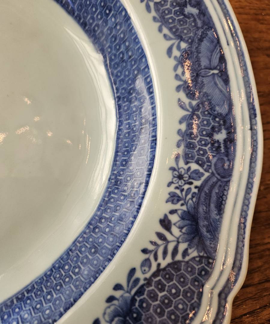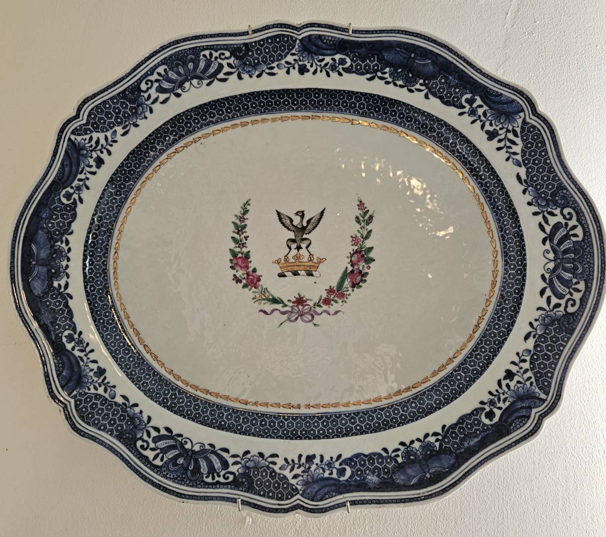 I picked up this beauty at a charity shop last weekend and it made it back in the overhead bin OK. Interesting in that its border and shape of rim with grooved edge matches armorial export examples but the center is blank. I got a really good deal on it and my niece asked me how much it would be regularly and I said about $300-600. Does that sound about right? It's in perfect condition. 14.5" long.