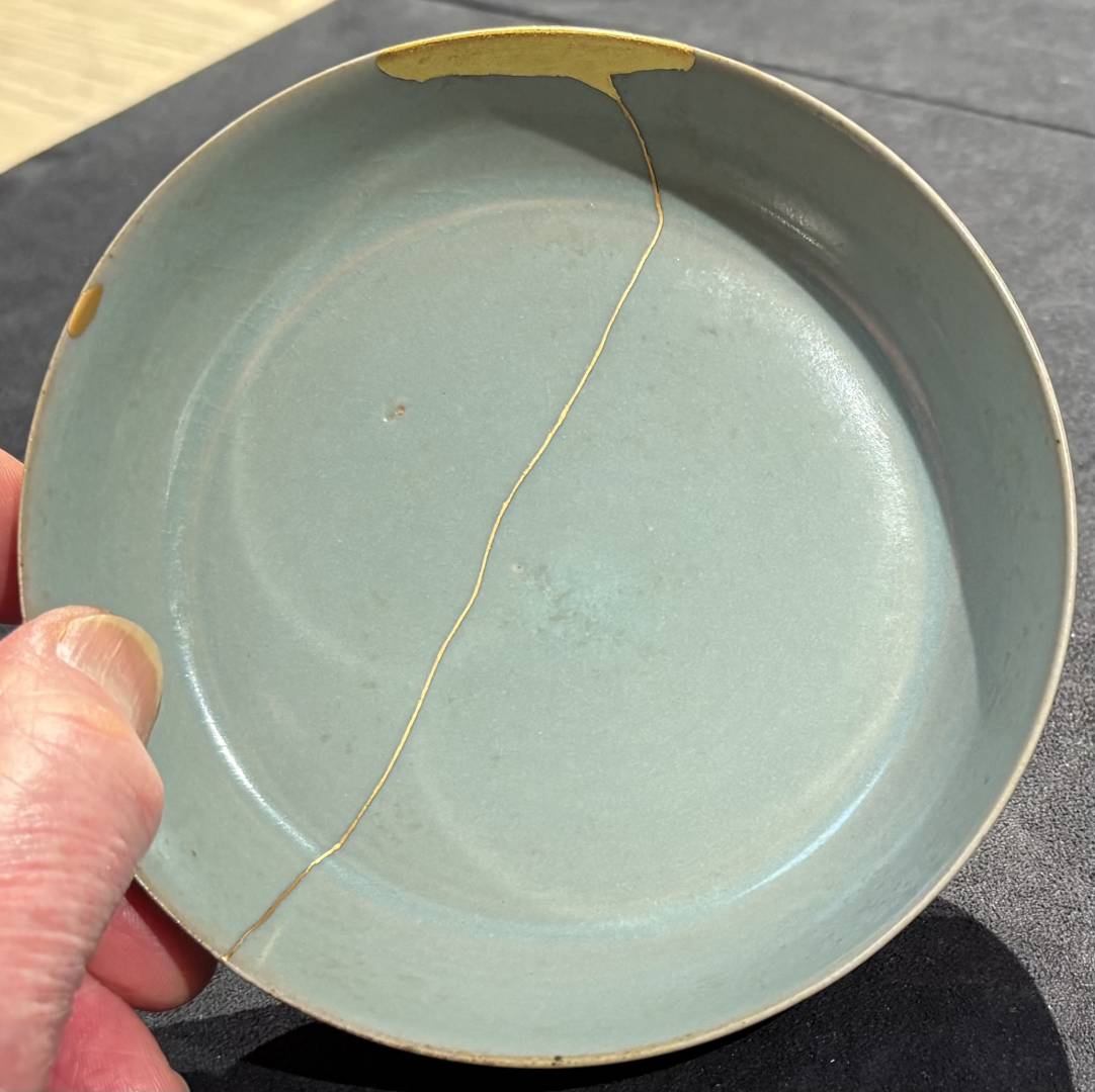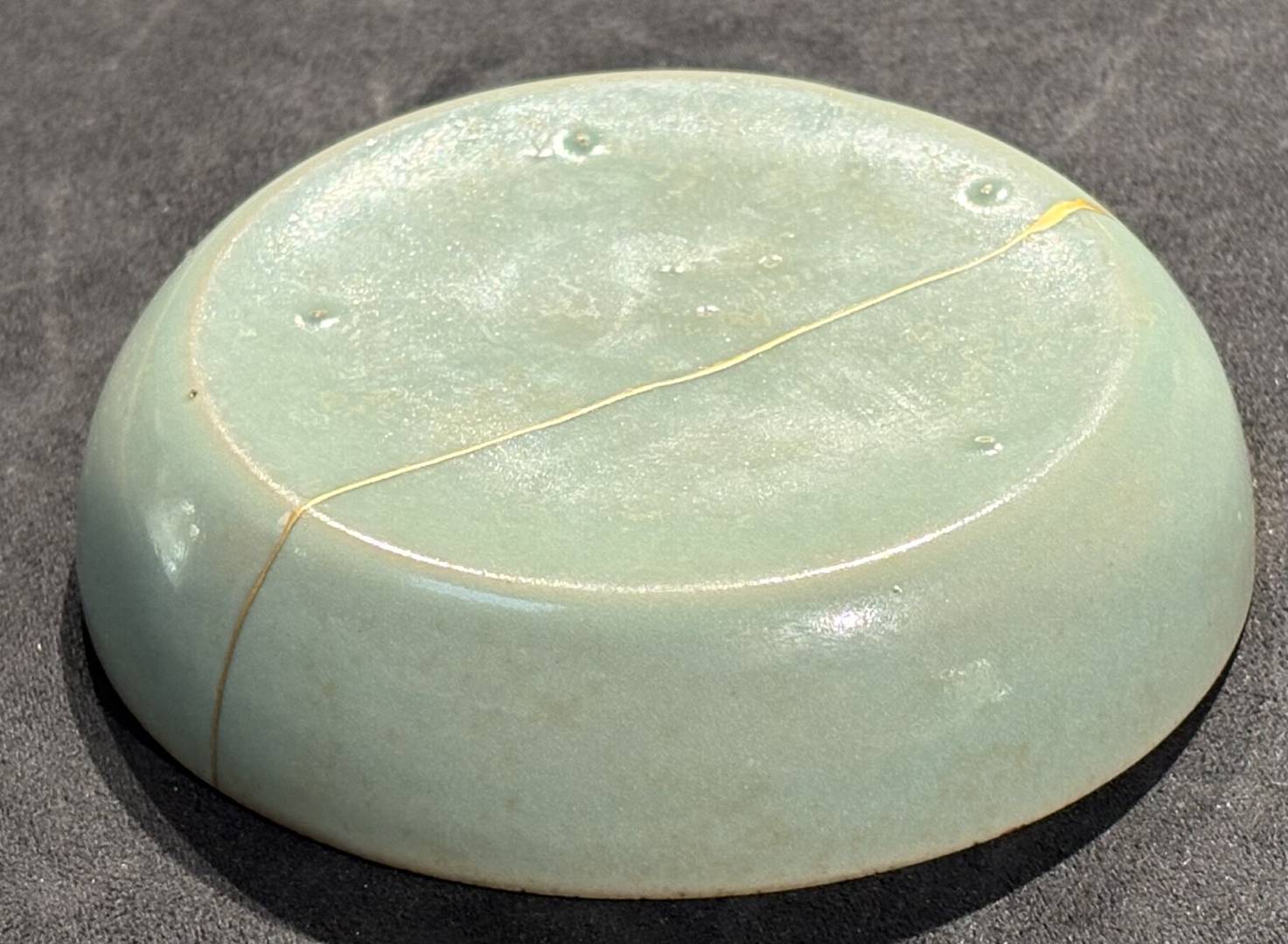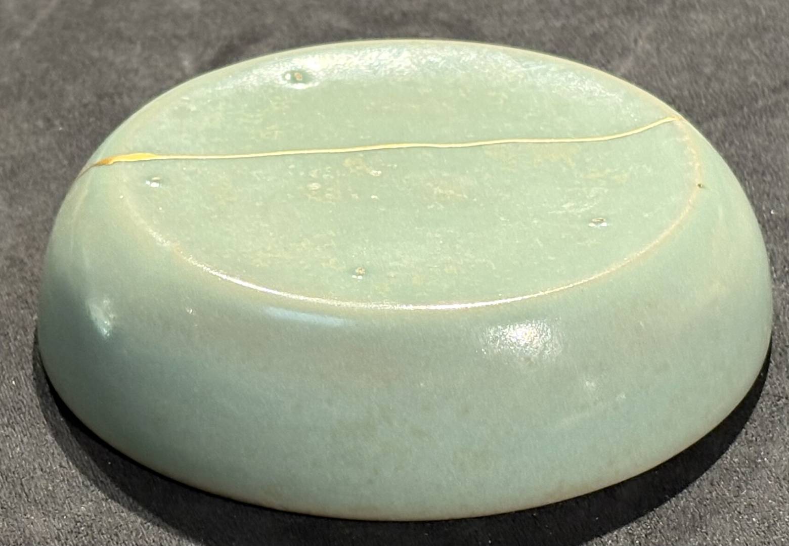 Images 1-3; an extremely rare Ru Guanyao brush washer, D. 11.6 cm, attributed to Northern Song dynasty. Obvious condition issues, broken in half, mouthrim losses with gold lacquer repairs and several small glaze defects …