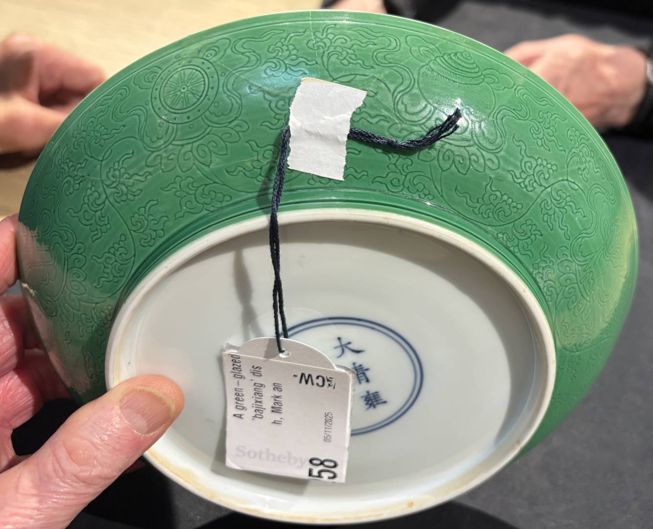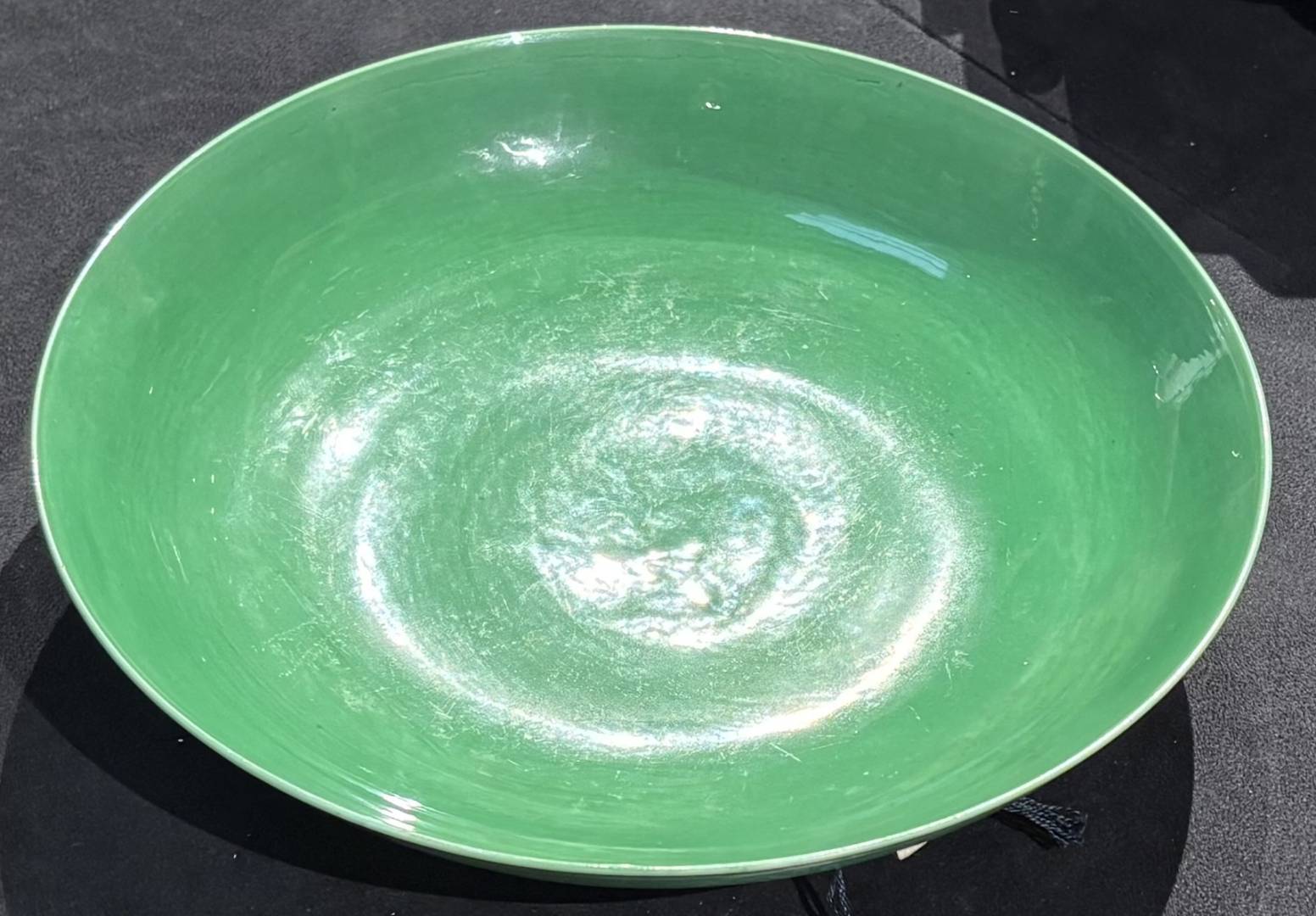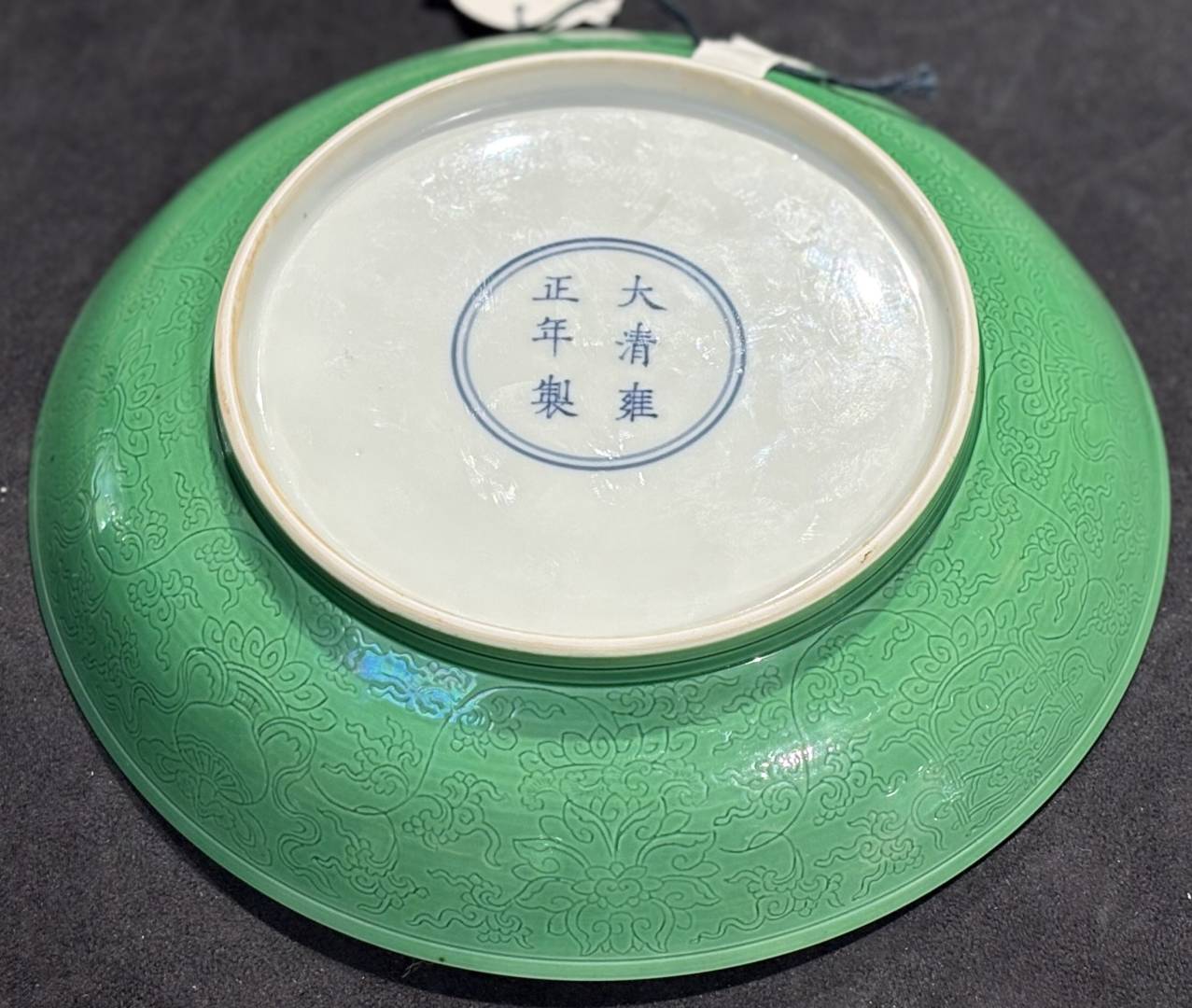 Images 6-8; Imperial Yongzheng mark and period green glazed dish, D. 20.5cm, with incised decoration of eight buddhist emblems supported upon a lotus blossom scroll …
