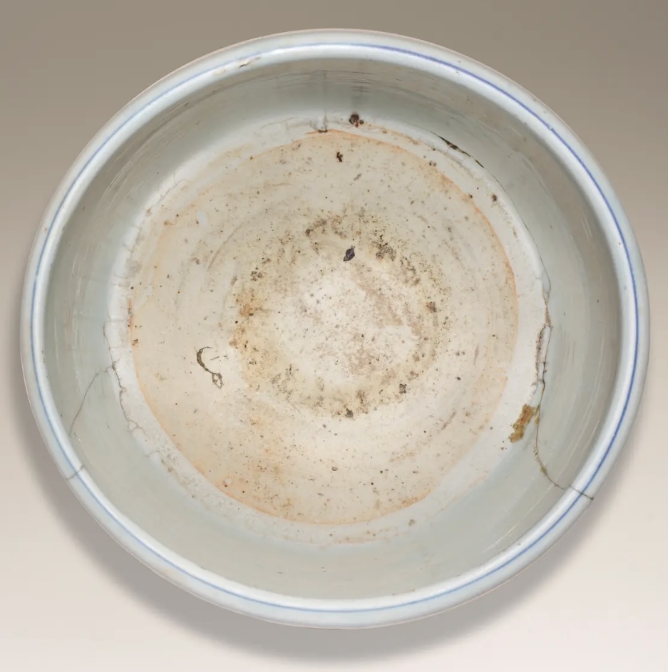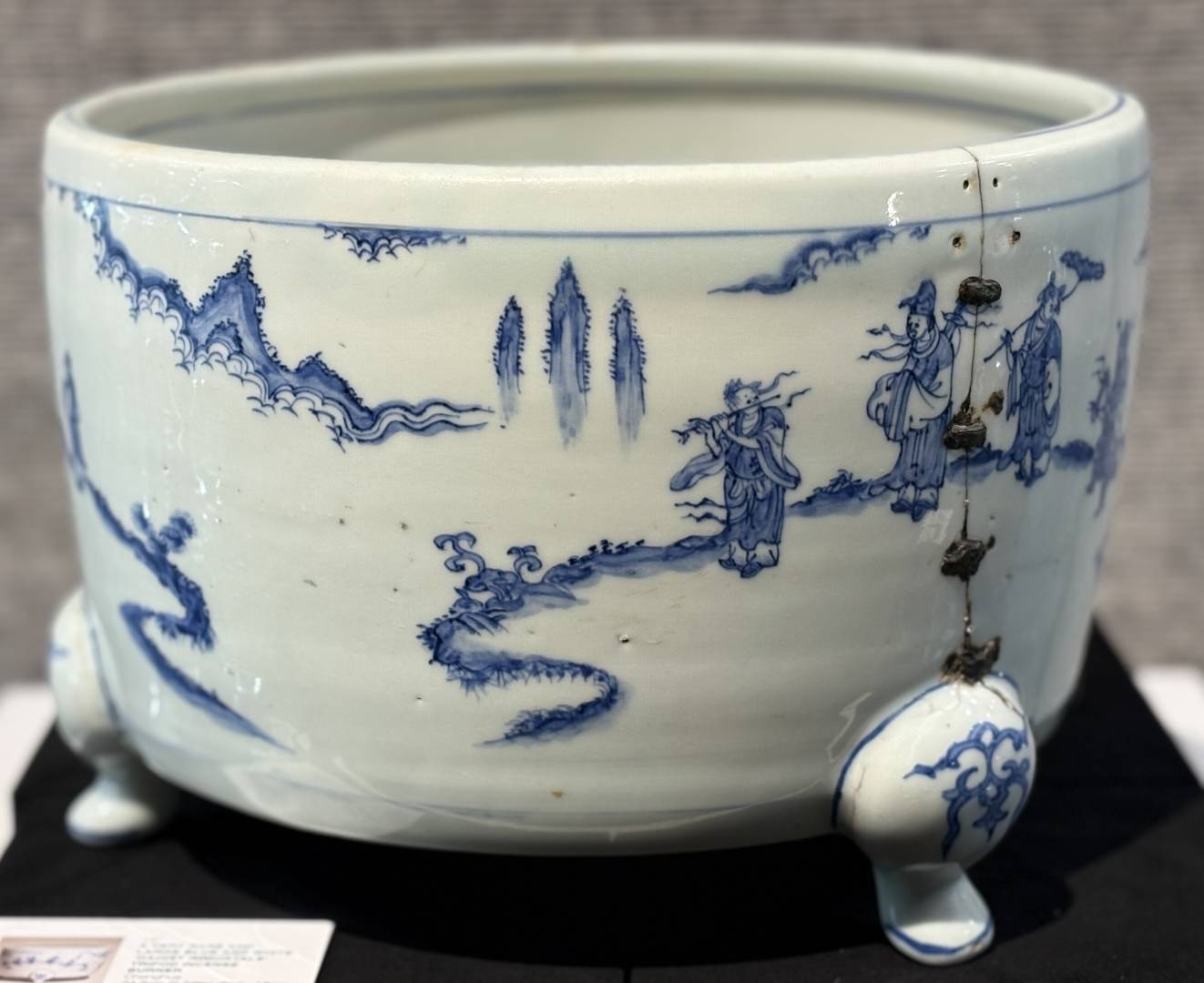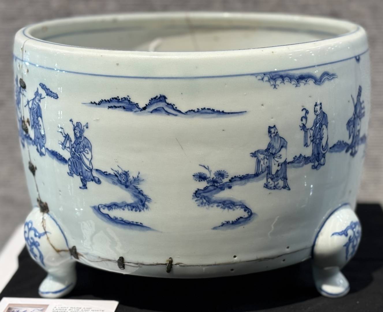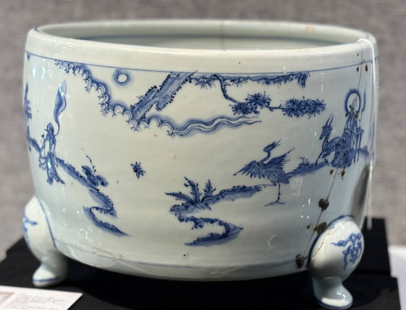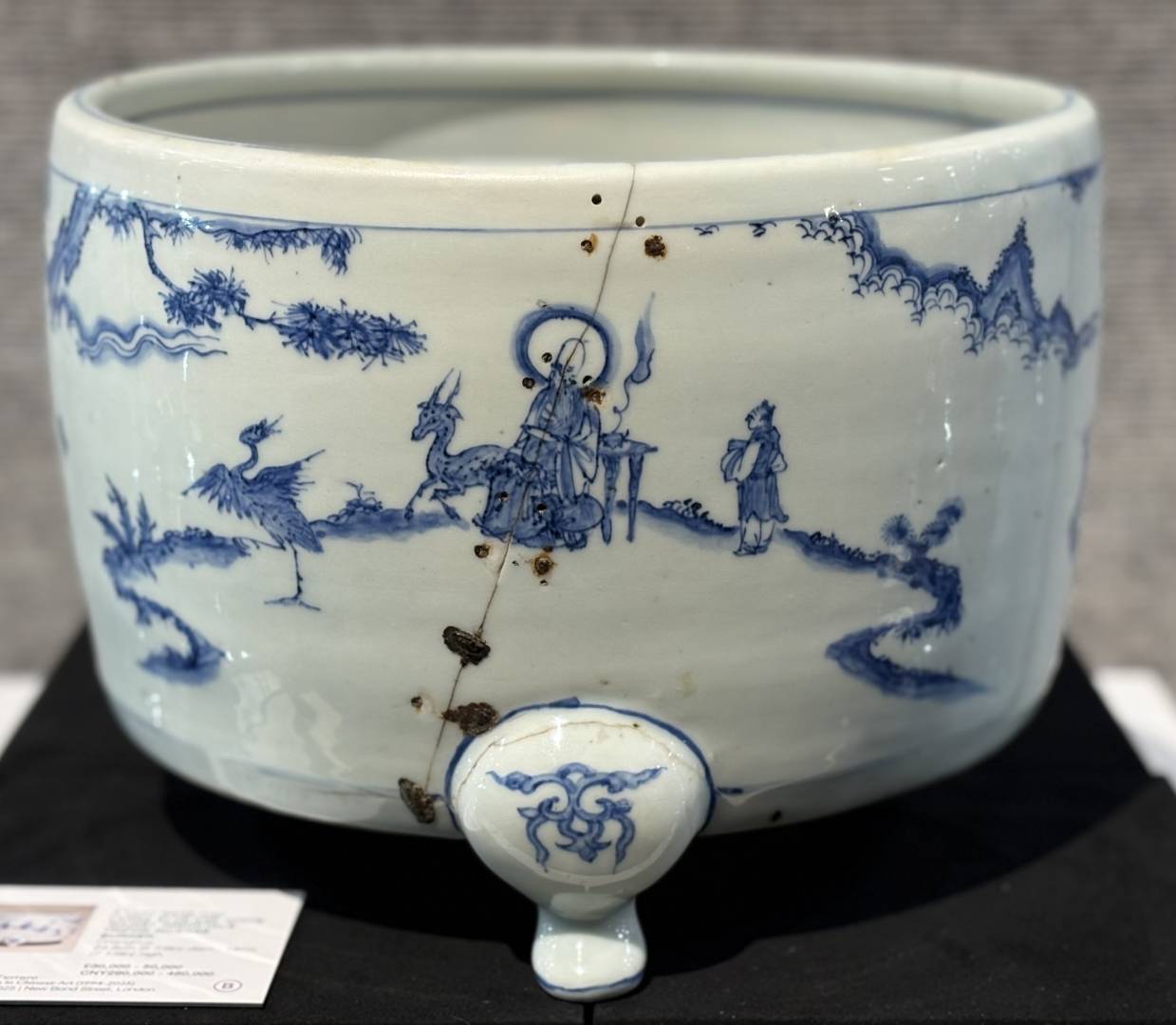 Obvious condition issues, several old riveted cracks and numerous glaze defects, but well painted in a good strong cobalt, the overall size being quite rare …