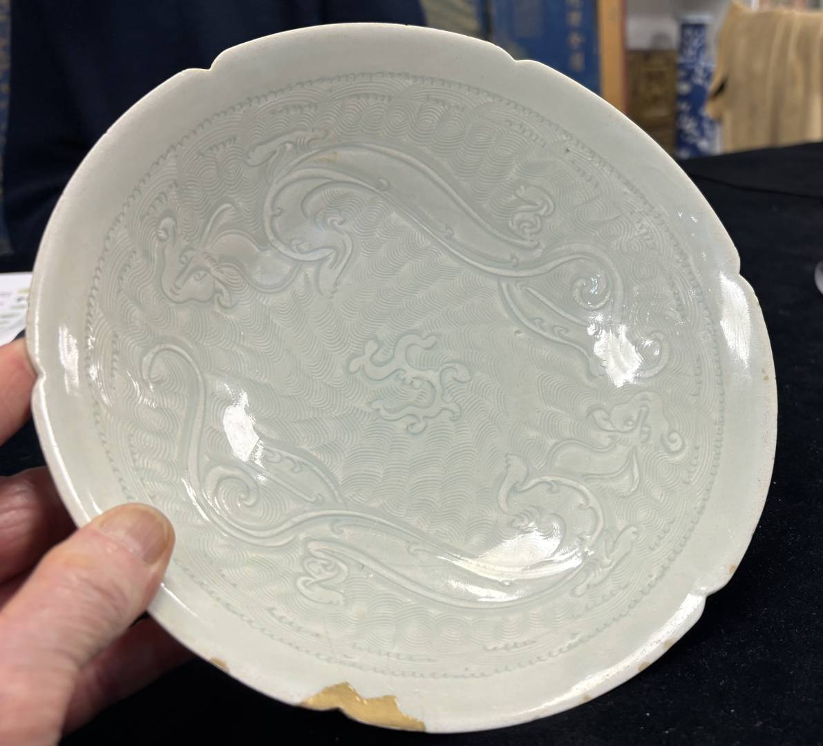 It is always a great privilege to be able to see and handle such wonderful pieces, especially when one comes across a ‘super apex’ object such as the Qingbai Chi dragon lobed bowl …
